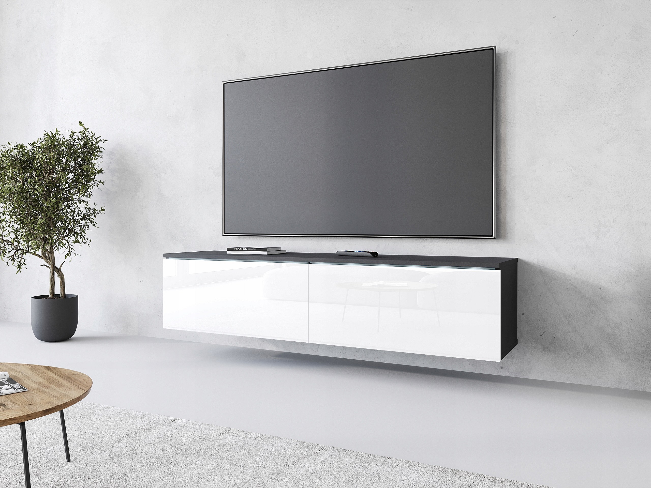 Moderne TV-kast 140 cm met LED 2 deuren, greeploos, corpus matera, fronten wit hoogglans, staand of hangend
