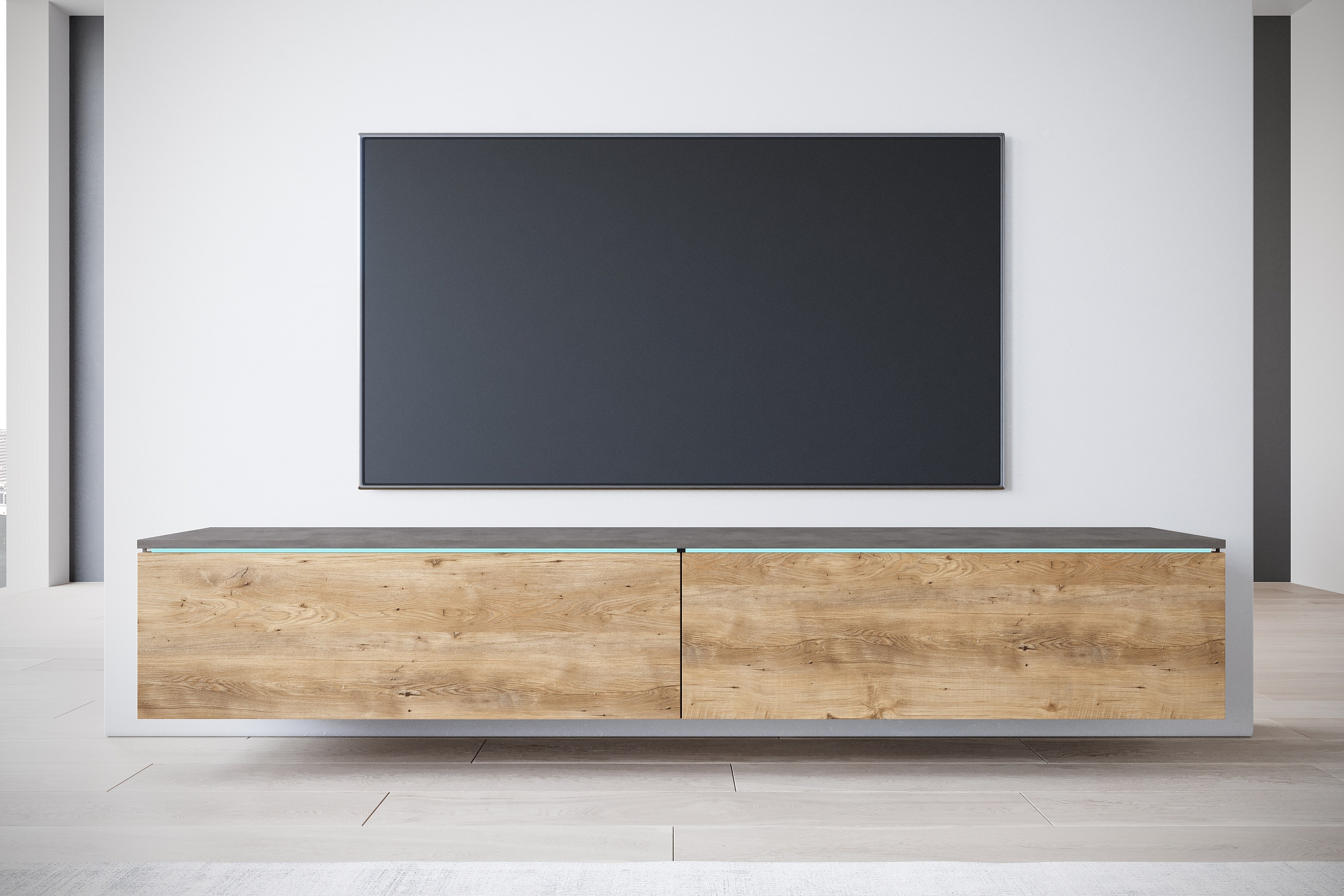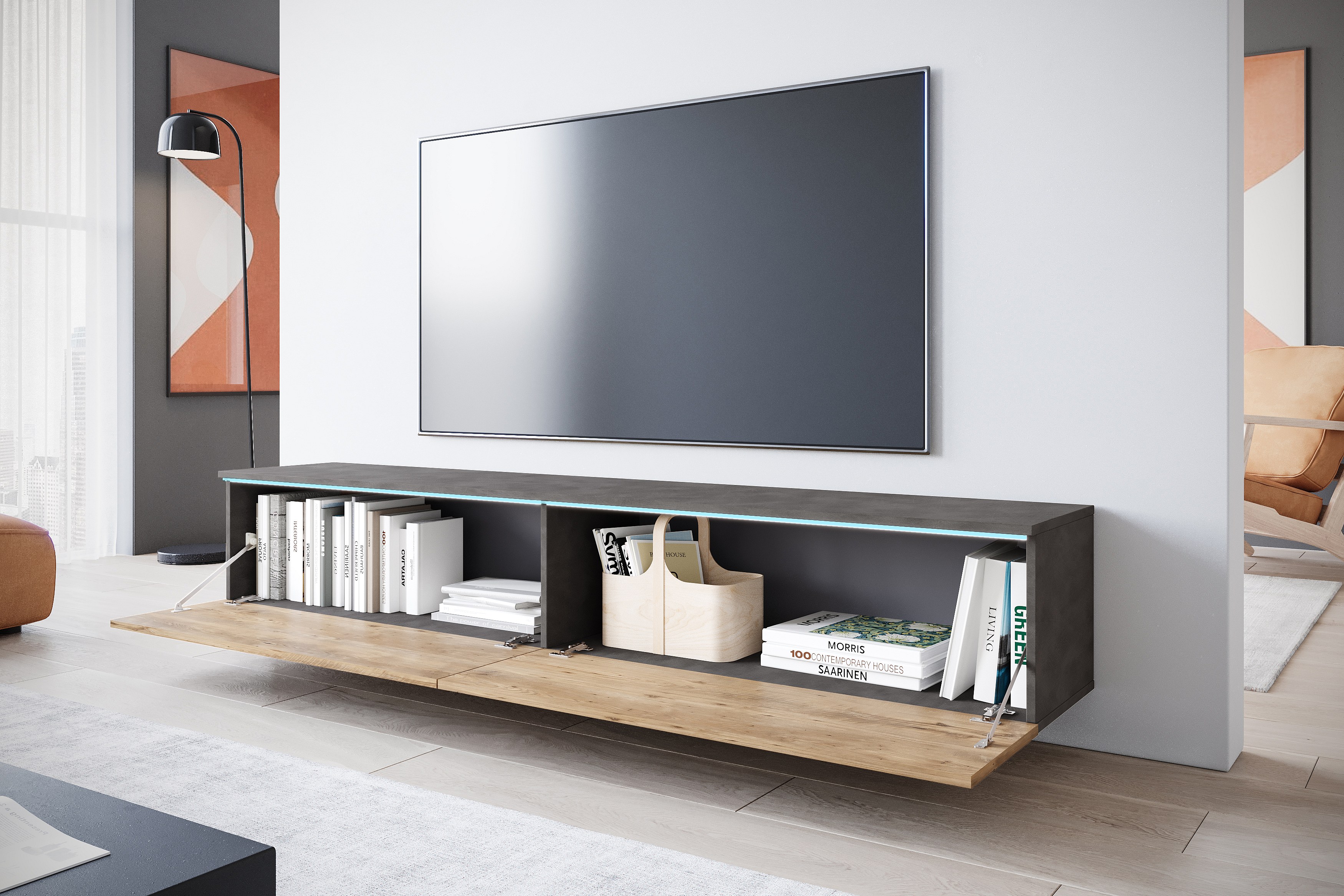 Moderne TV-meubel 180 cm voor woonkamer met LED – 2-deurs, greeploos, corpus antraciet, fronten kastanje mat, staand of hangend