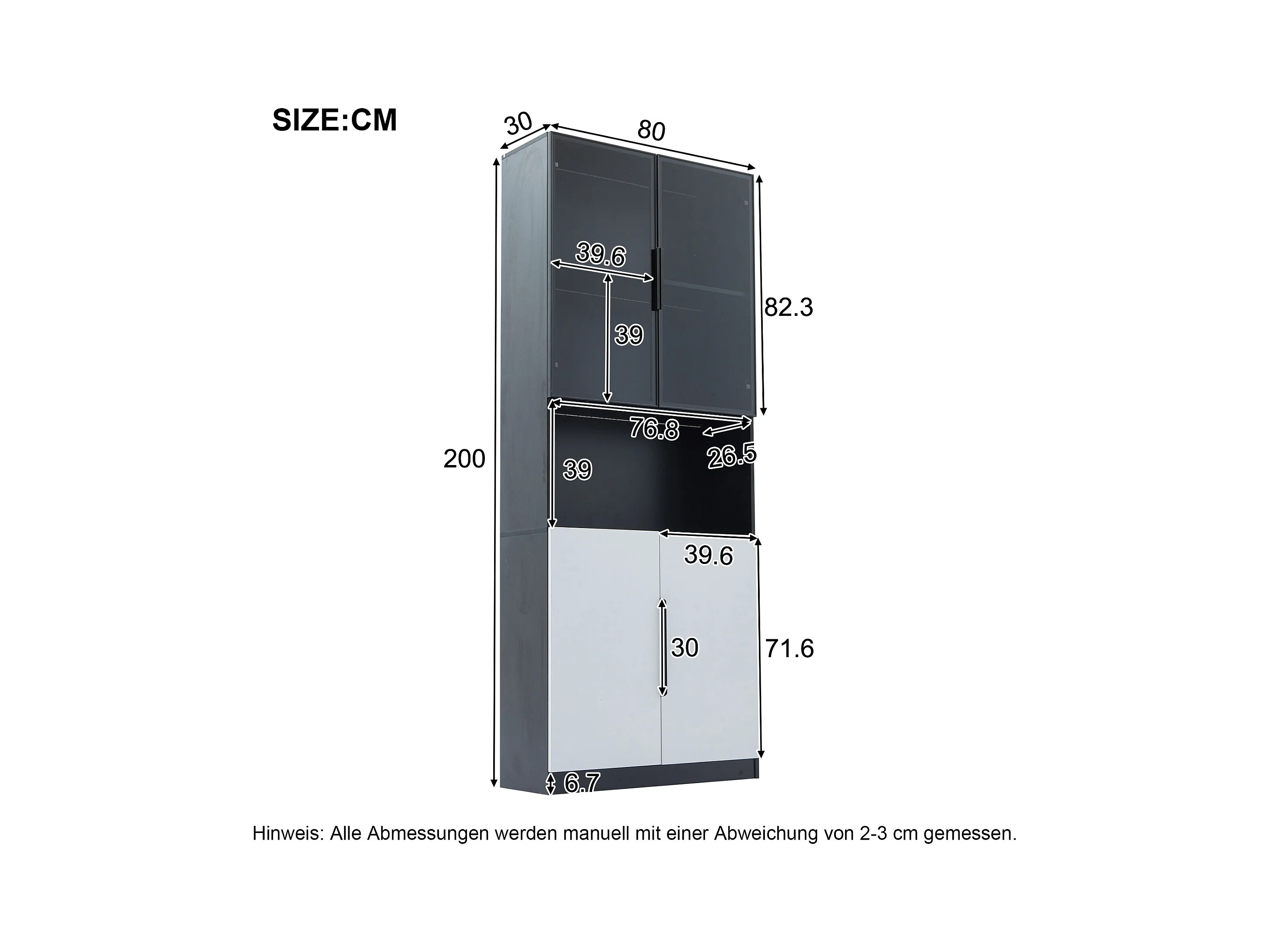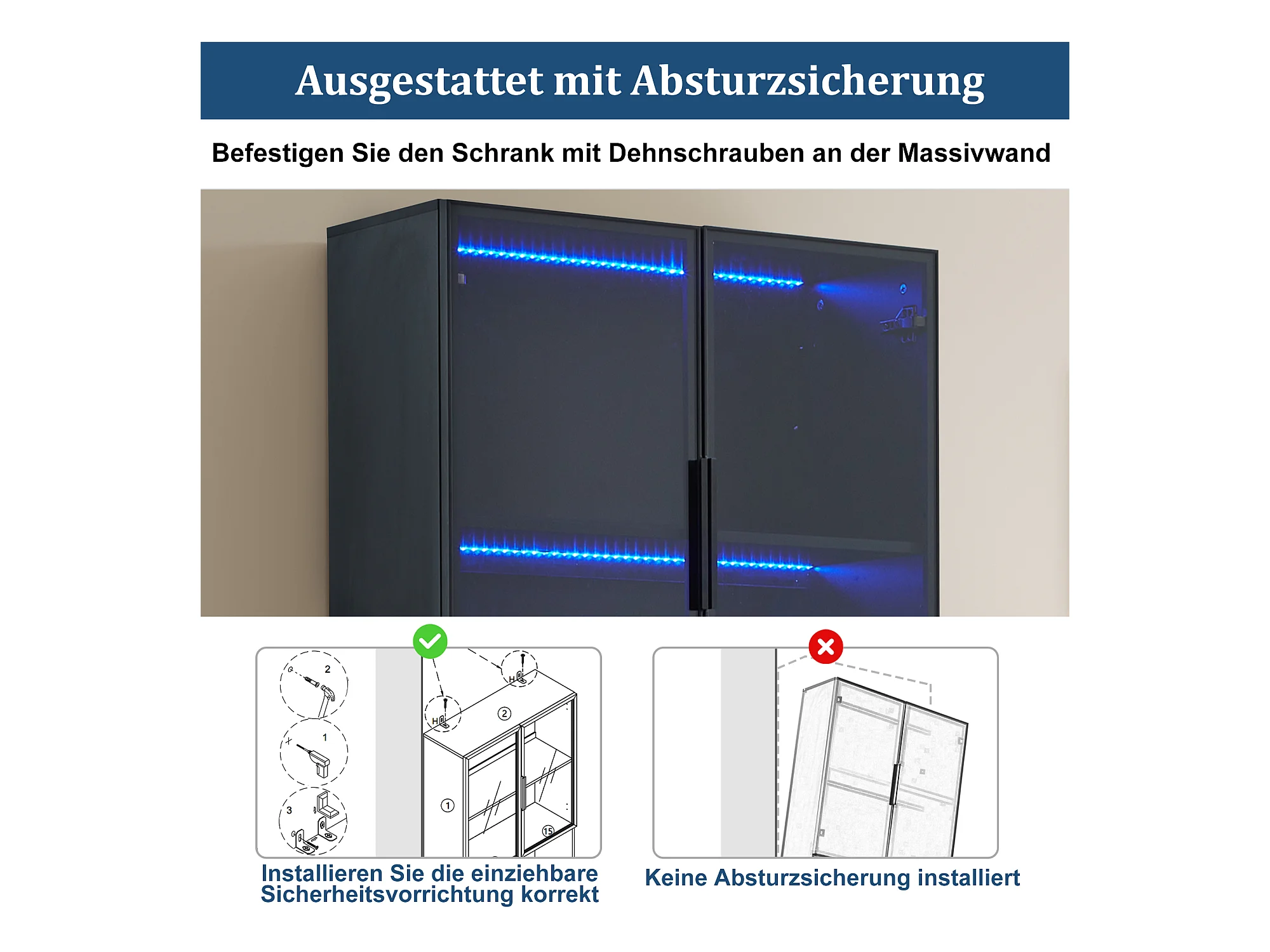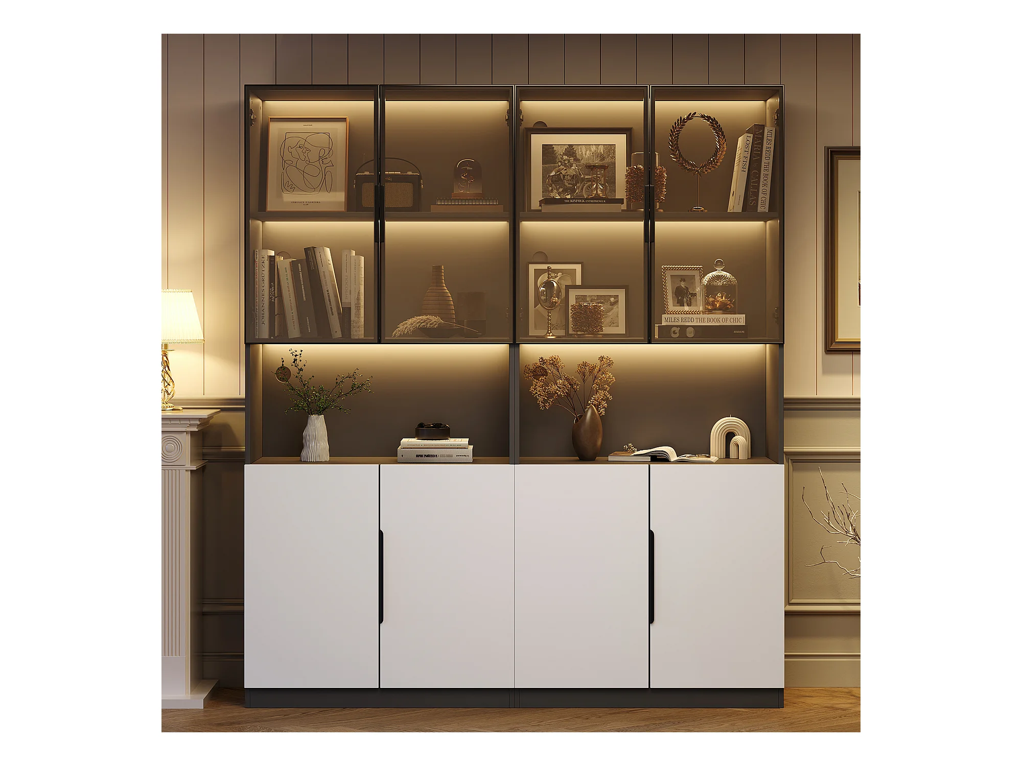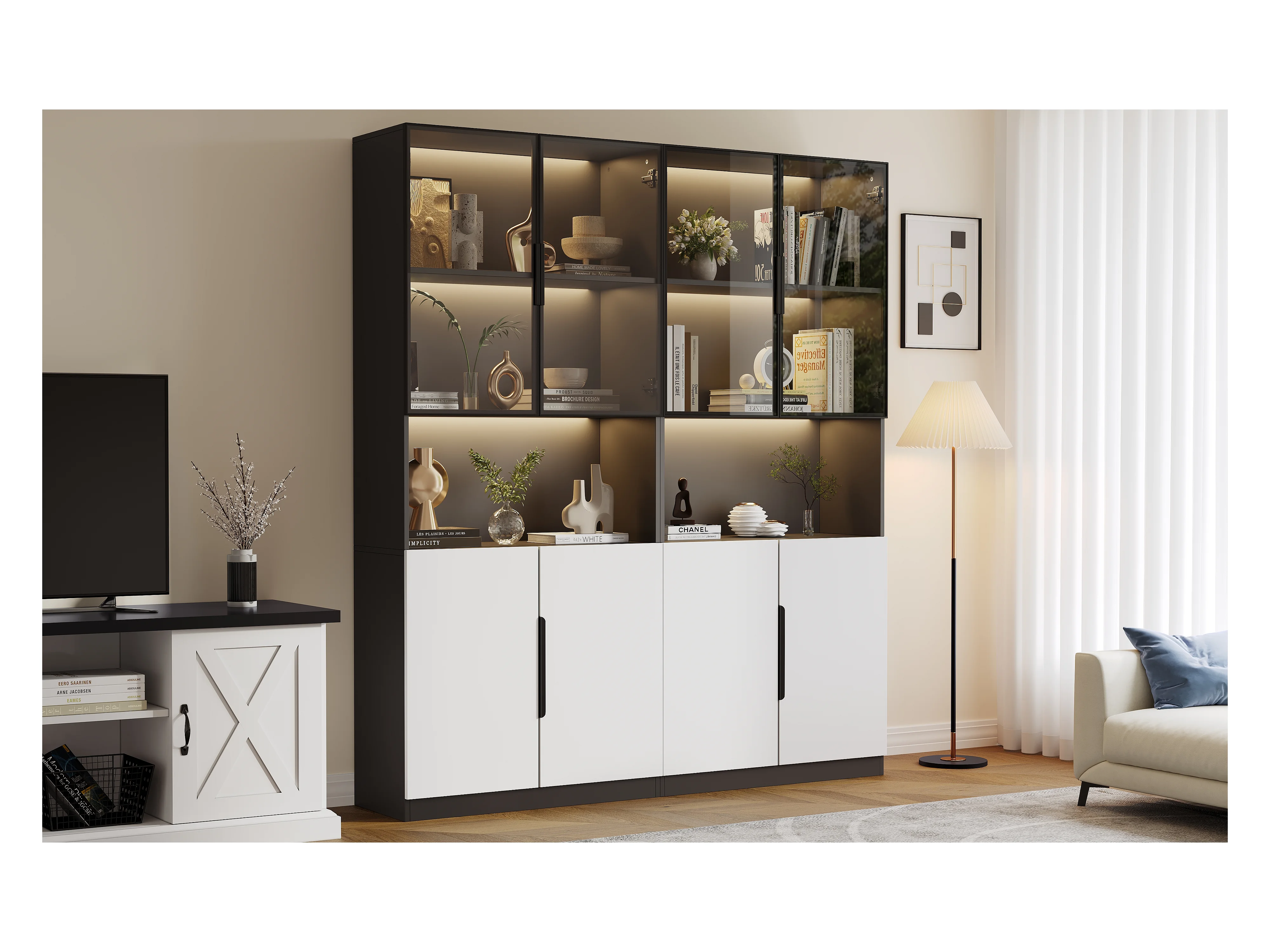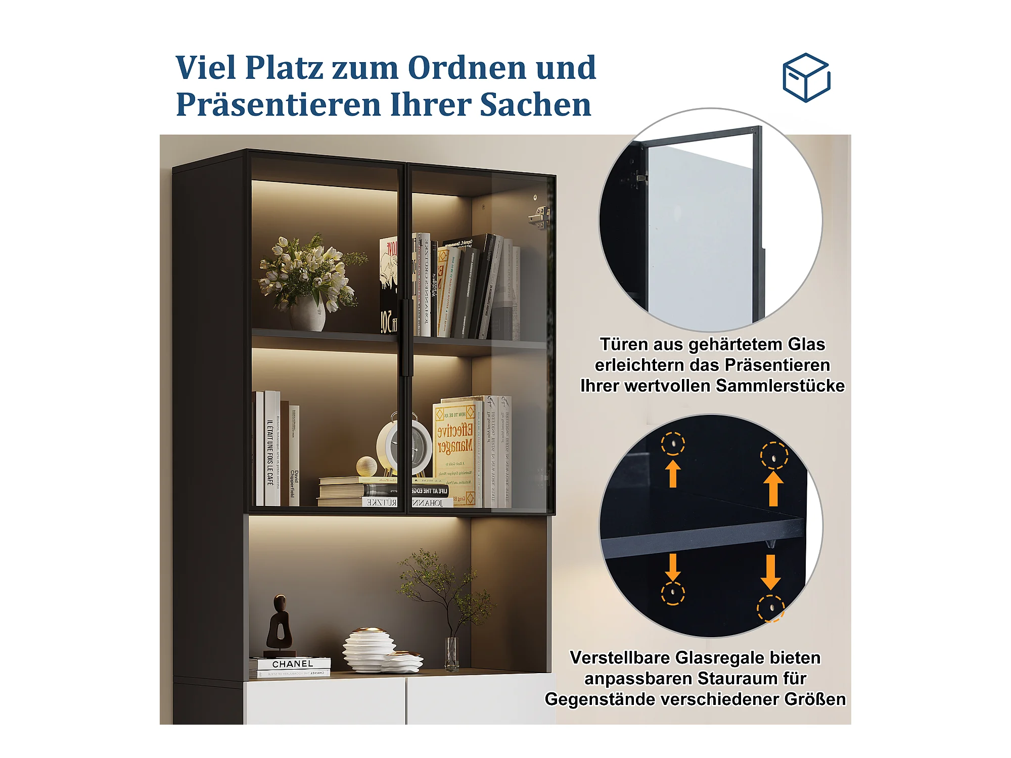 LED-vitrine met 4 deuren en verstelbare planken, MDF, wit en zwart (160x30x200 cm)