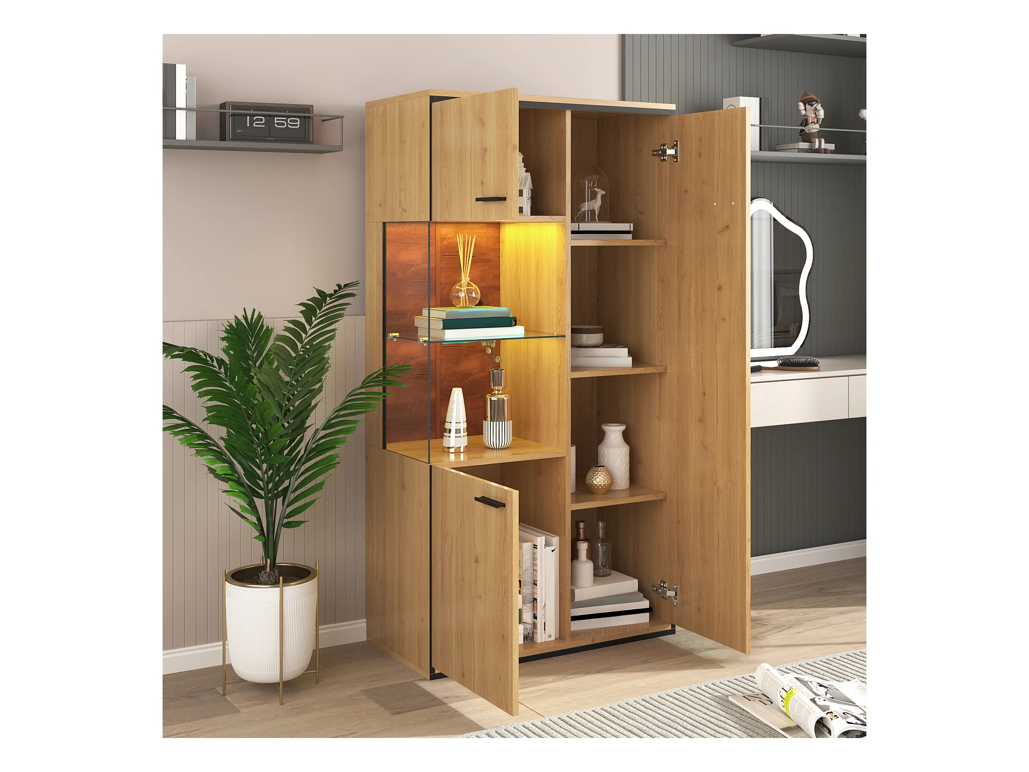 Moderne vitrinekast met ledverlichting, glazen deuren, verstelbare planken, 15 kleuren, MDF, wit (77,5x40x150 cm)