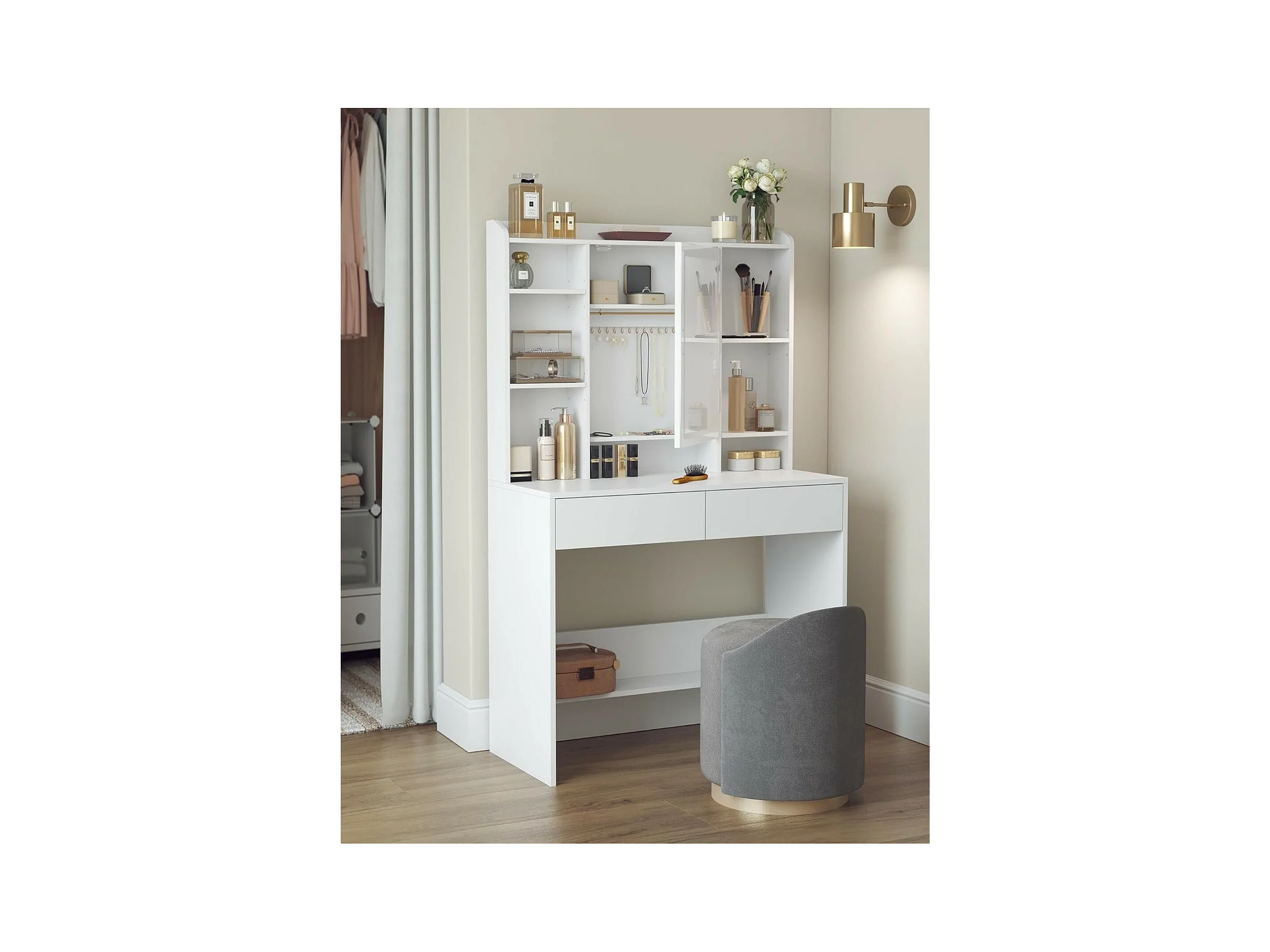 Bobbel Home - Witte Kaptafel - Rechthoekige spiegel - Gloeilampen - 2 lades en 3 open vakken - Wit
