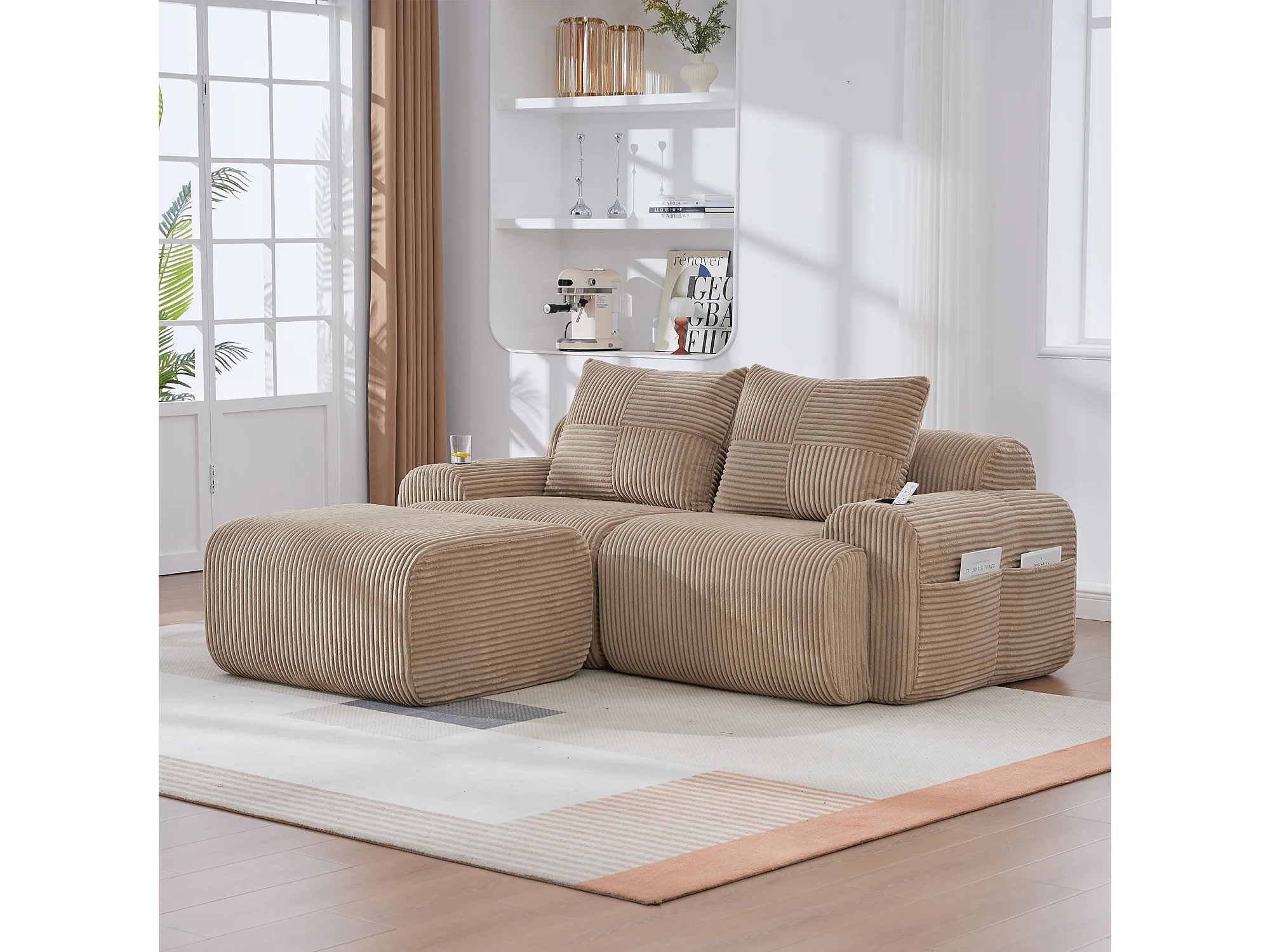 Modulaire 2-zits hoekbank ribfluweel, pouf, bekerhouders en zijvak, 200x174x80cm, Kaki
