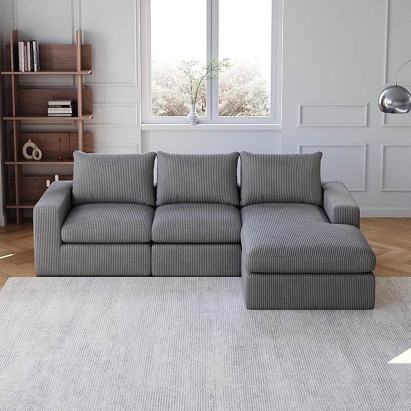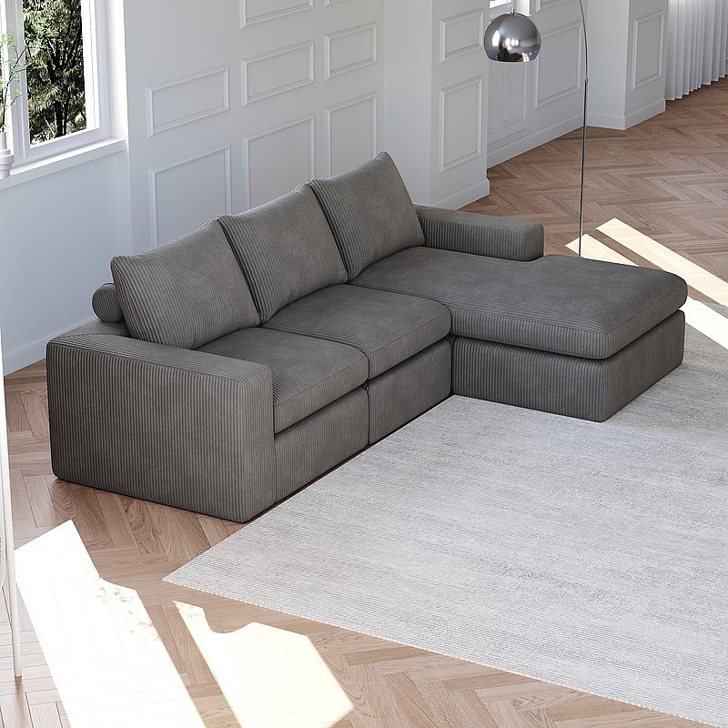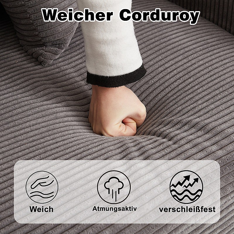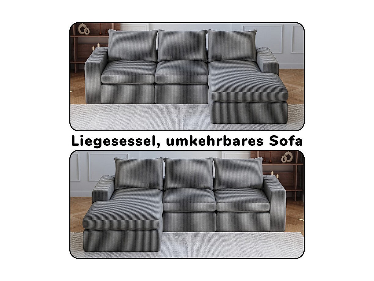 Modulaire 3-zits Hoekbank, van Ribfluweel, met Omkeerbare Lounger, 3 Kussens en Nekkussens, Antracietgrijs