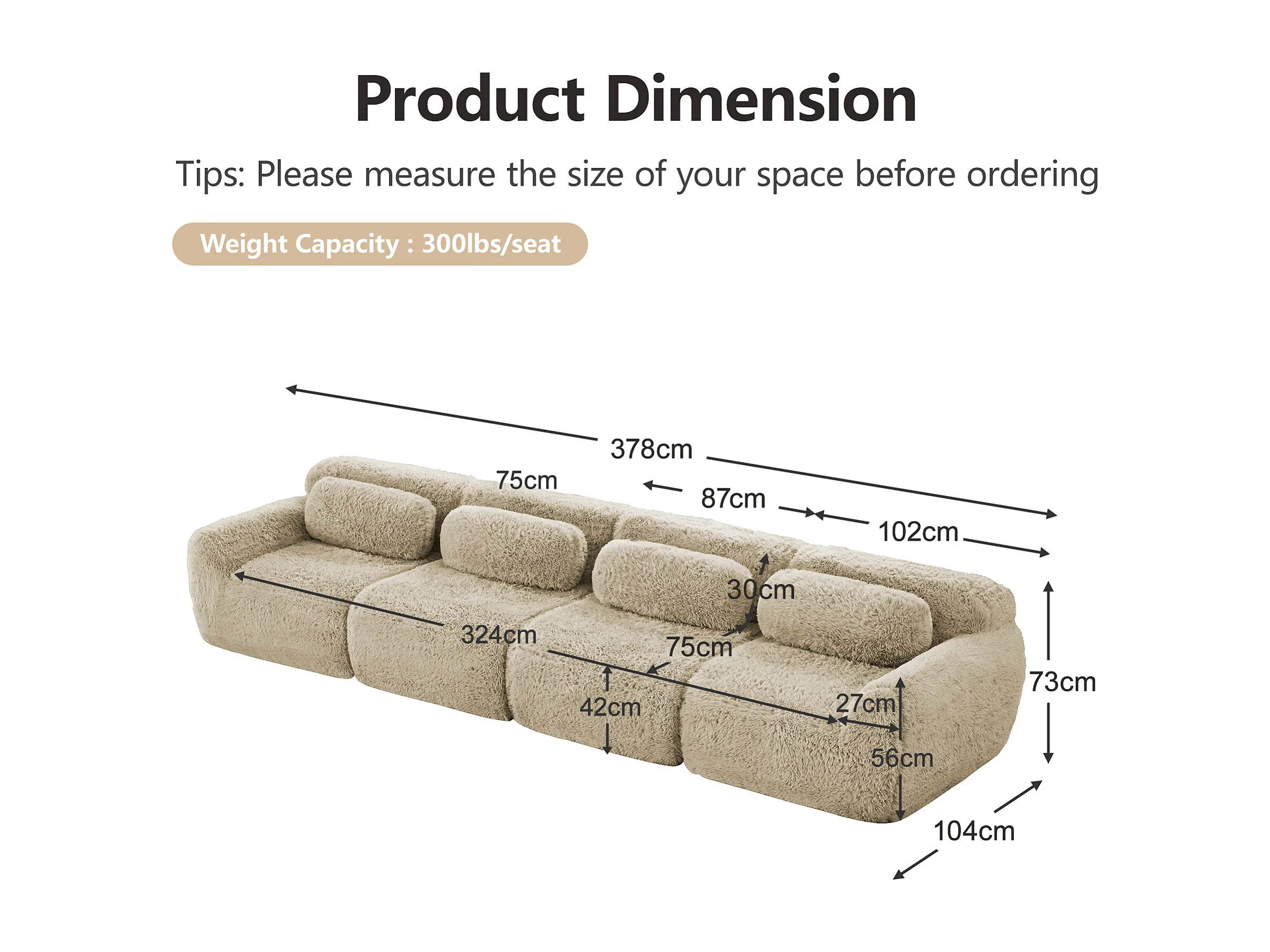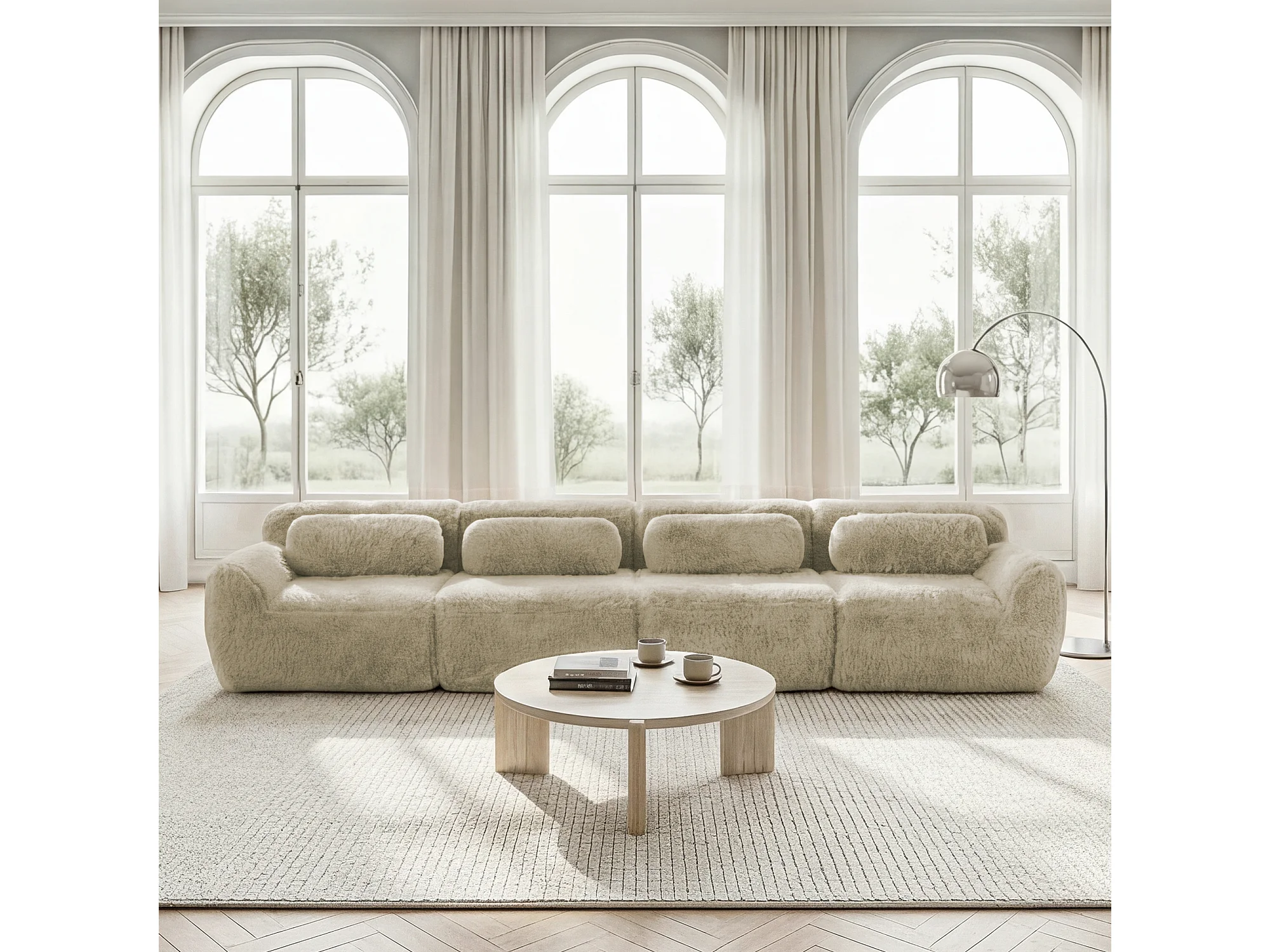 Modulaire 4-zitsbank in hoogwaardige pluche stof met kussens en antislipvoet – Licht kaki kleur