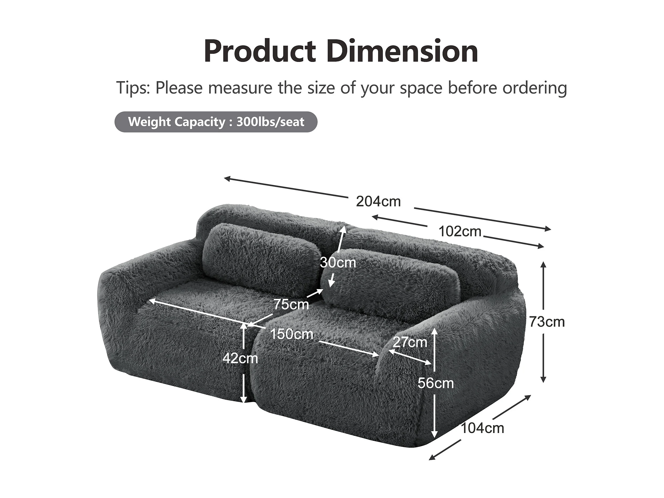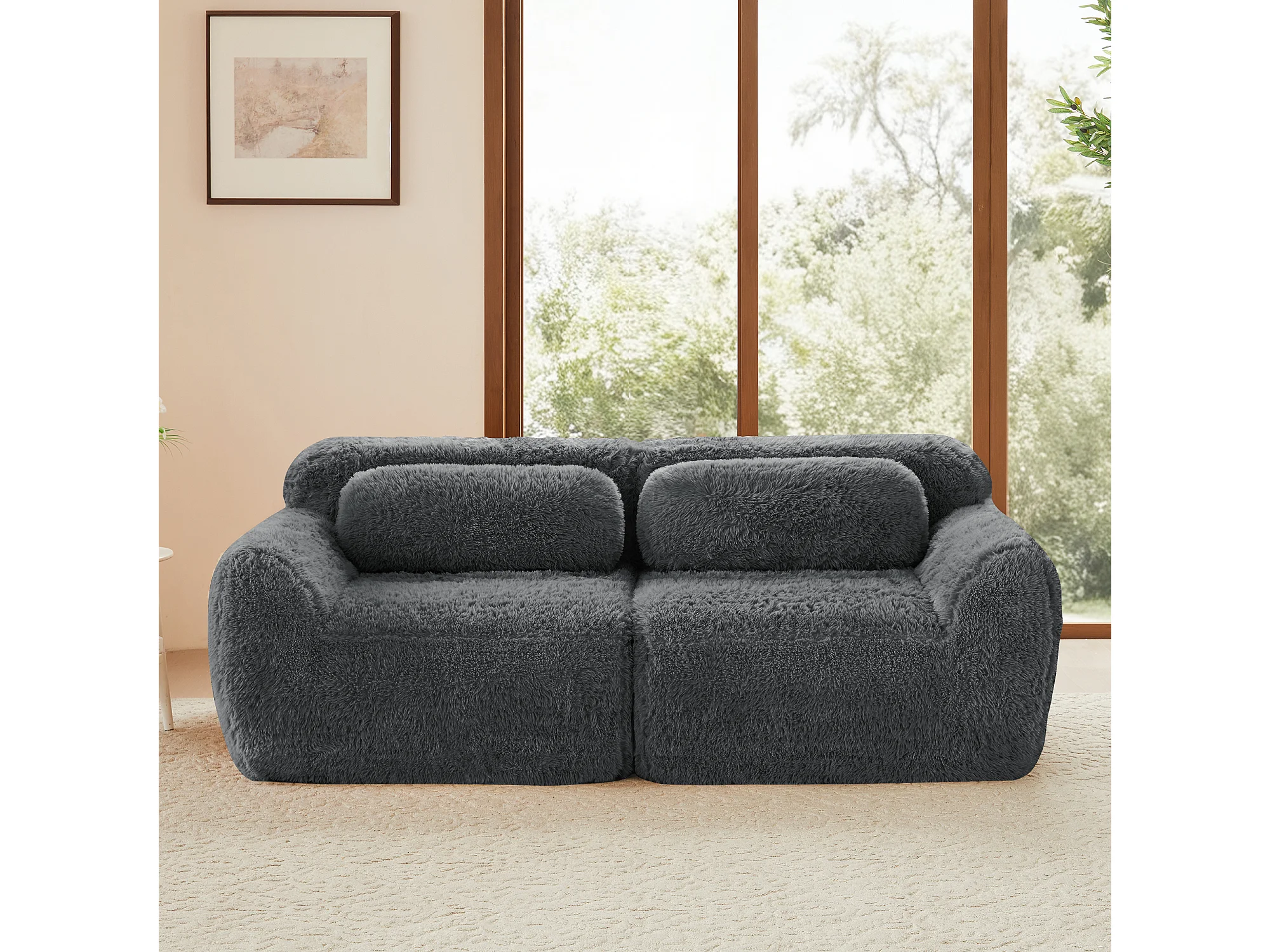 Modulaire Bank 2-zits in pluche stof, met 2 kussens, extra diepe zit 75cm, 204x104x73cm, Grijs