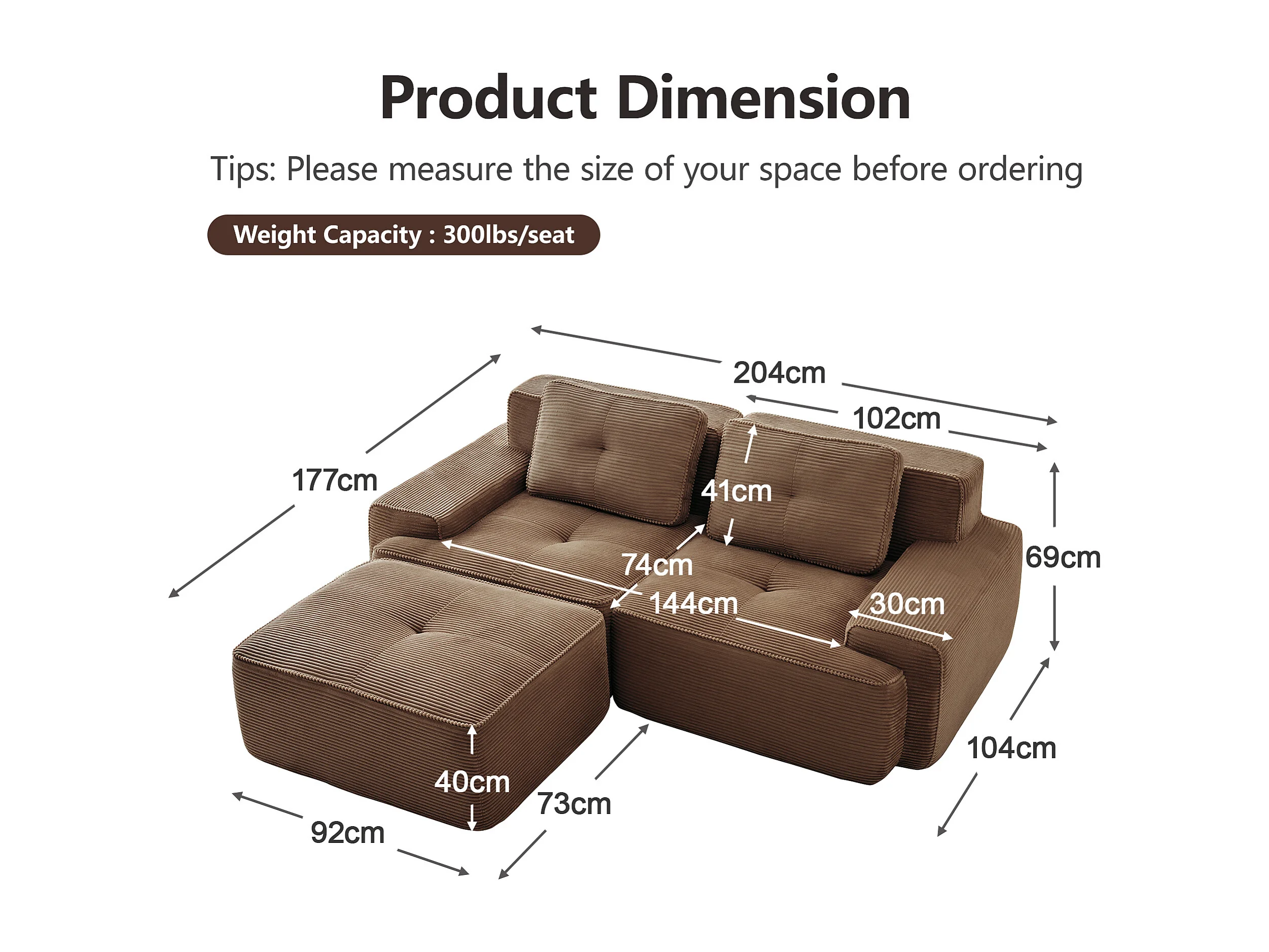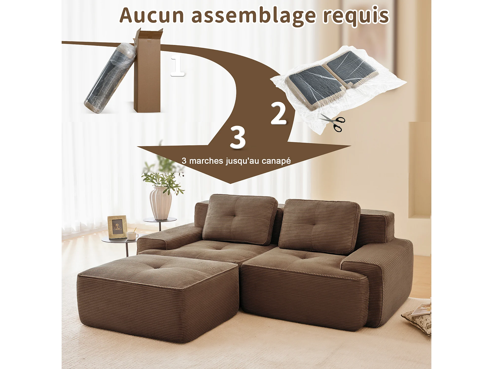 Modulaire Bank 2-zits in Ribfluweel, met poef en 2 kussens, 204x177x69cm, Bruin