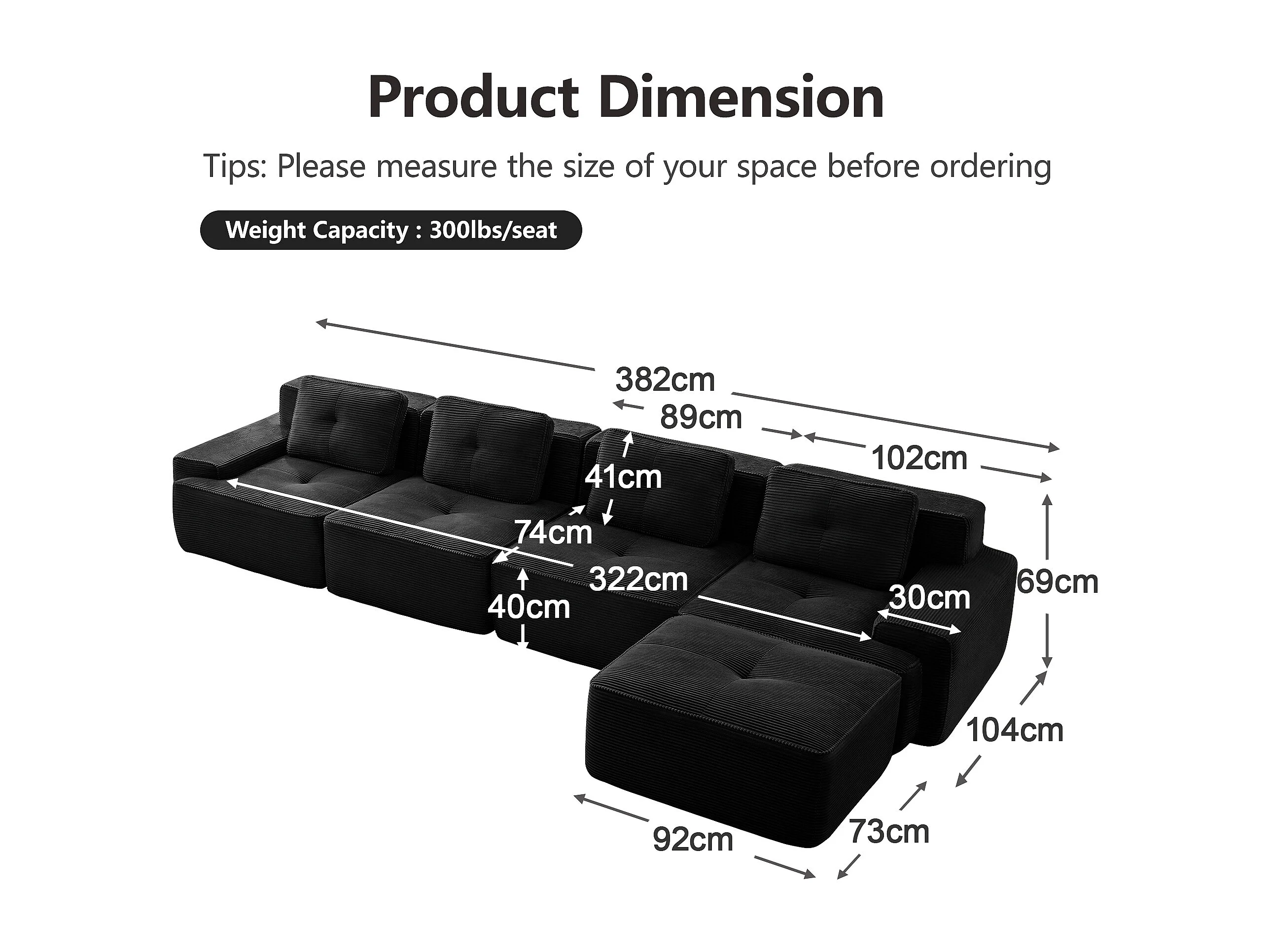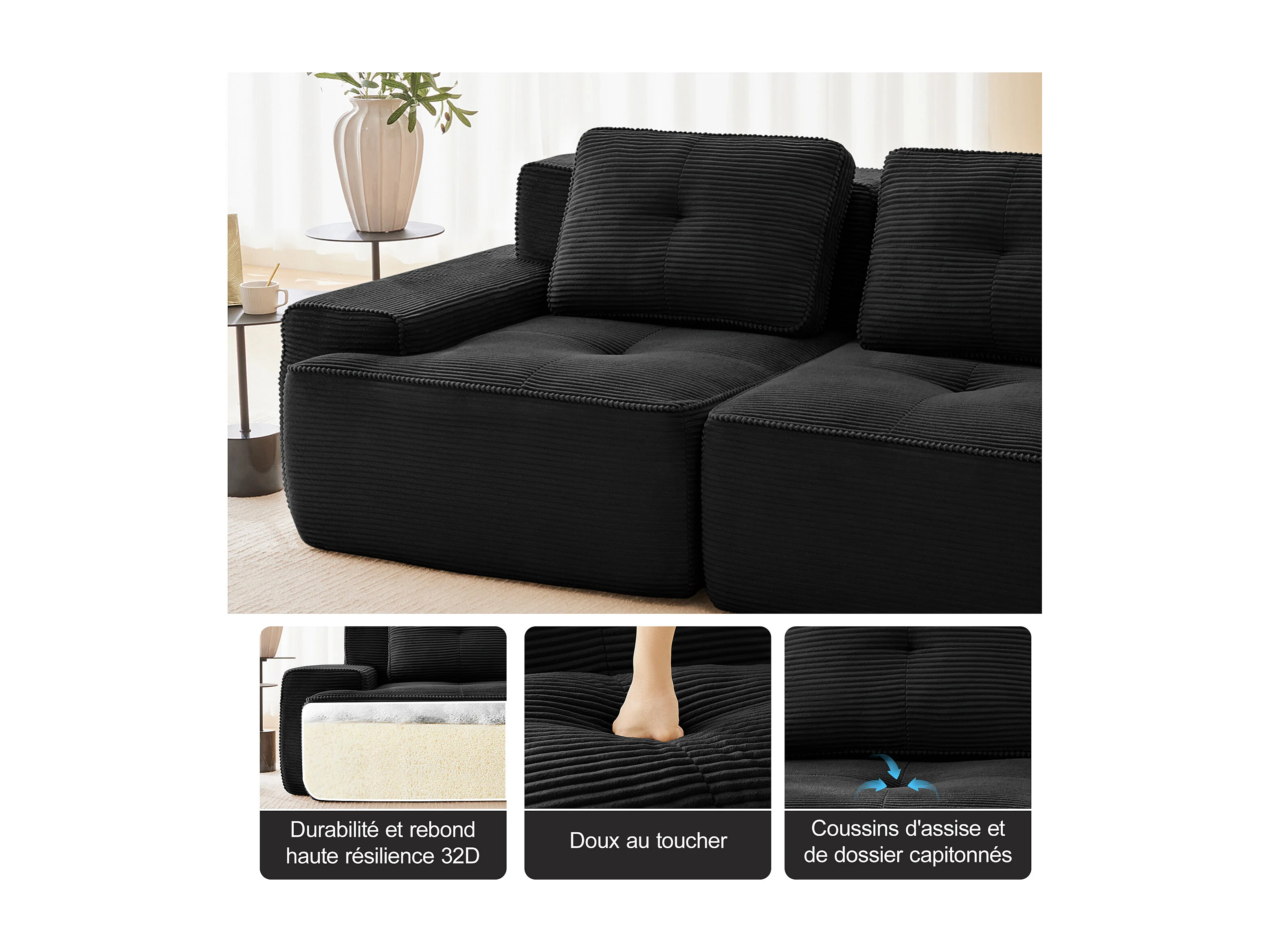 Modulaire Bank 4-zits in Ribfluweel, met poef en 4 kussens, 382x177x69cm, Zwart