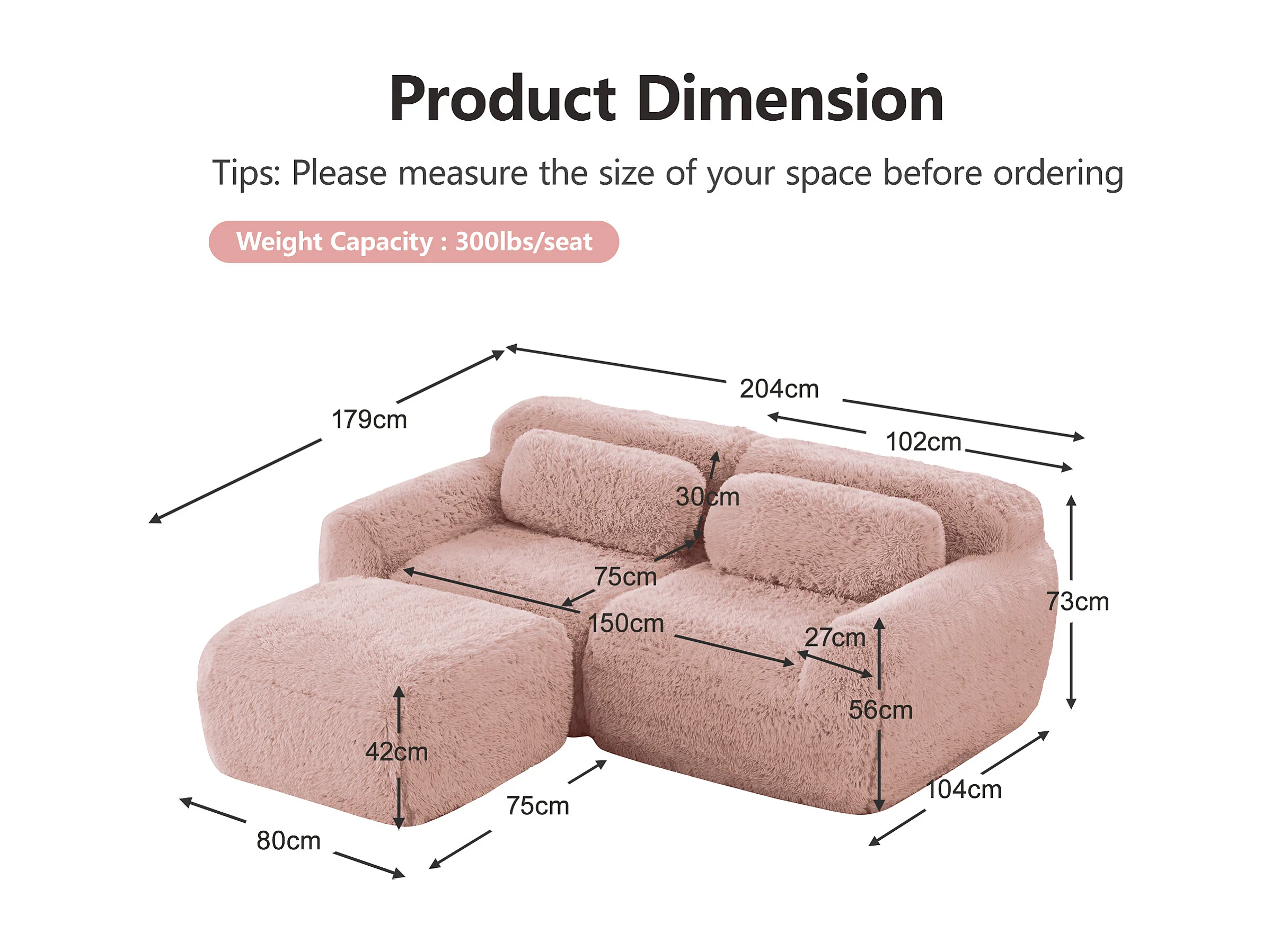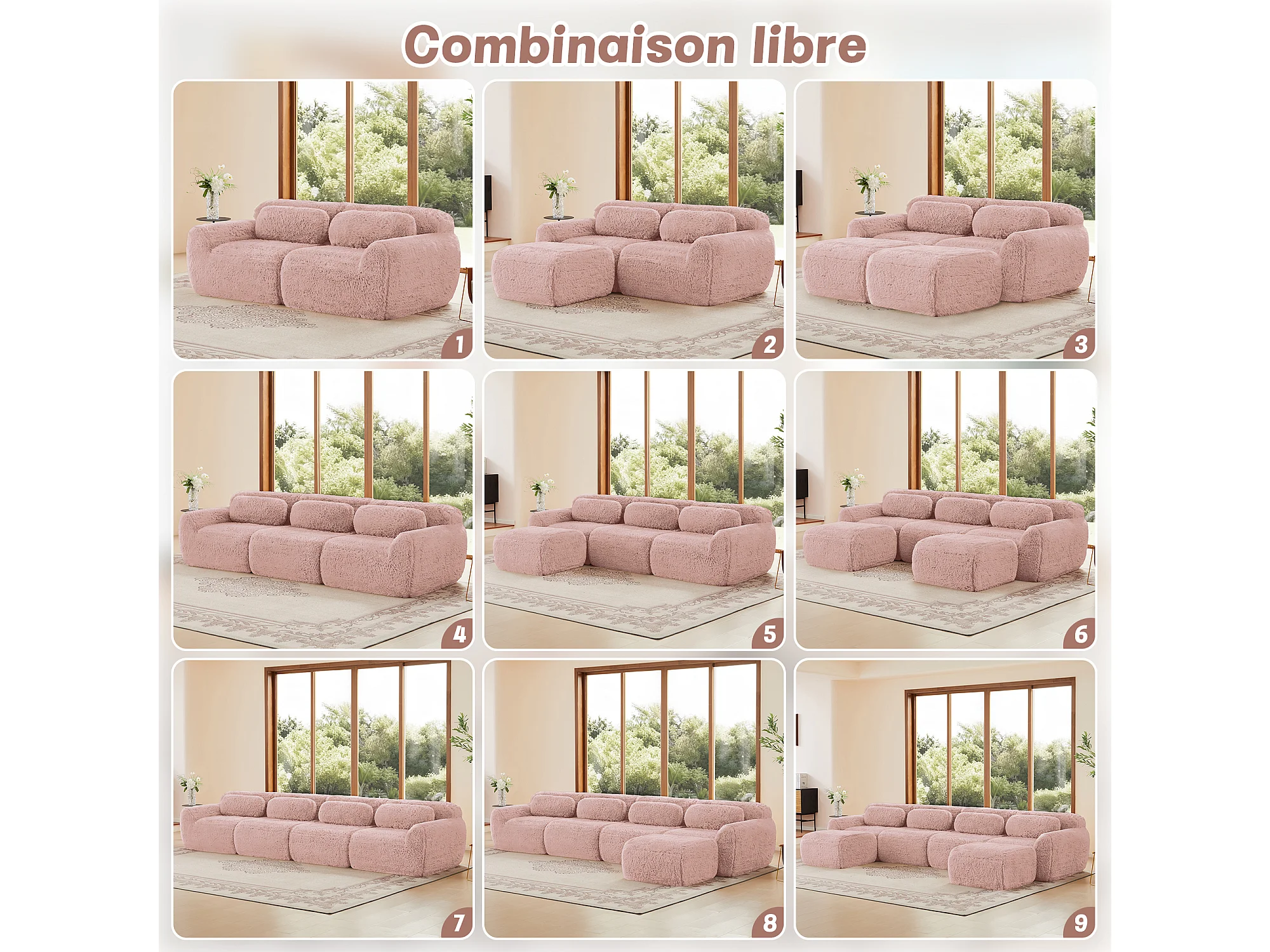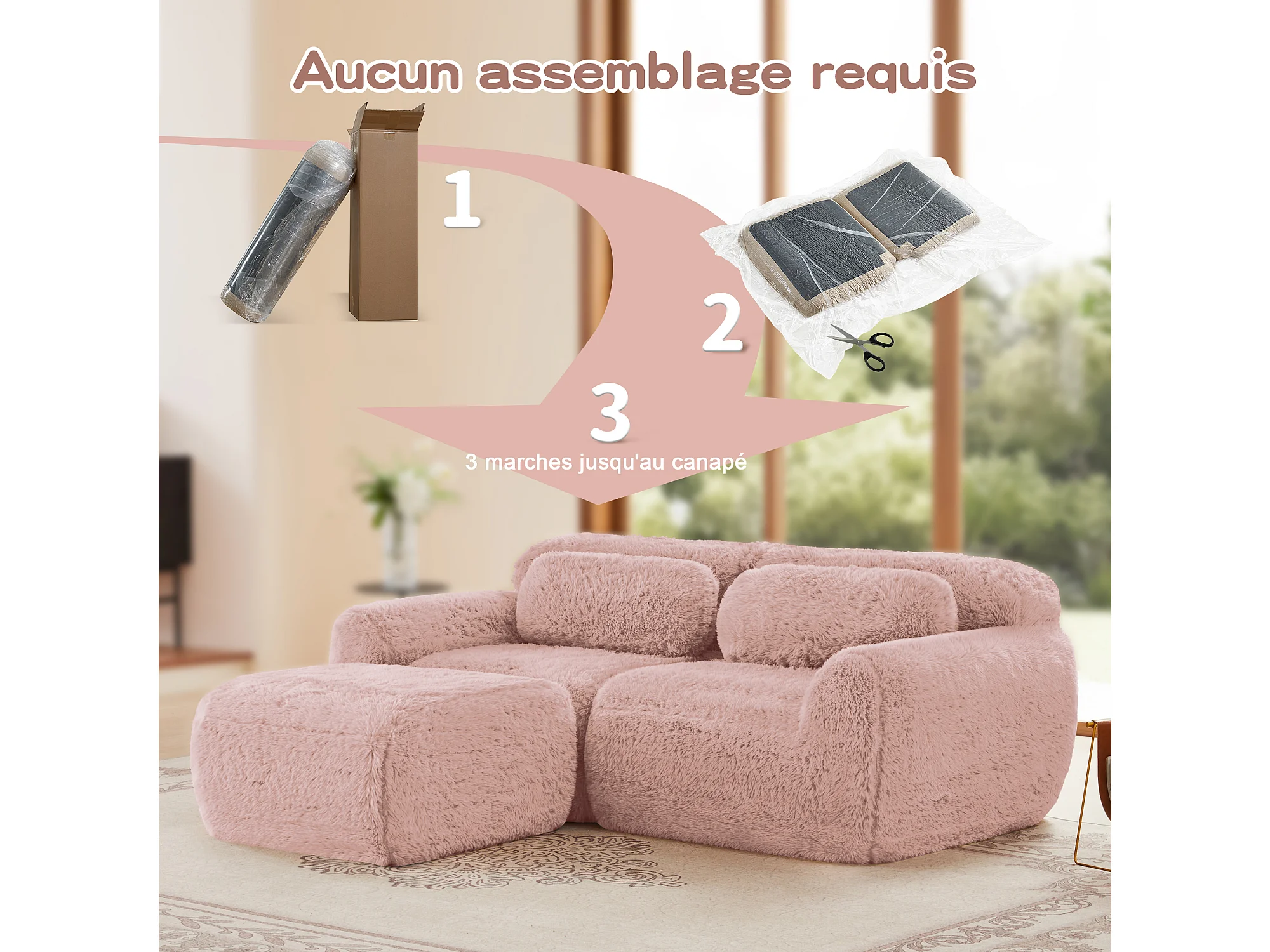 Modulaire Hoekbank 2-zits in pluche stof, met poef en 2 kussens, 204x179x73cm, Roze