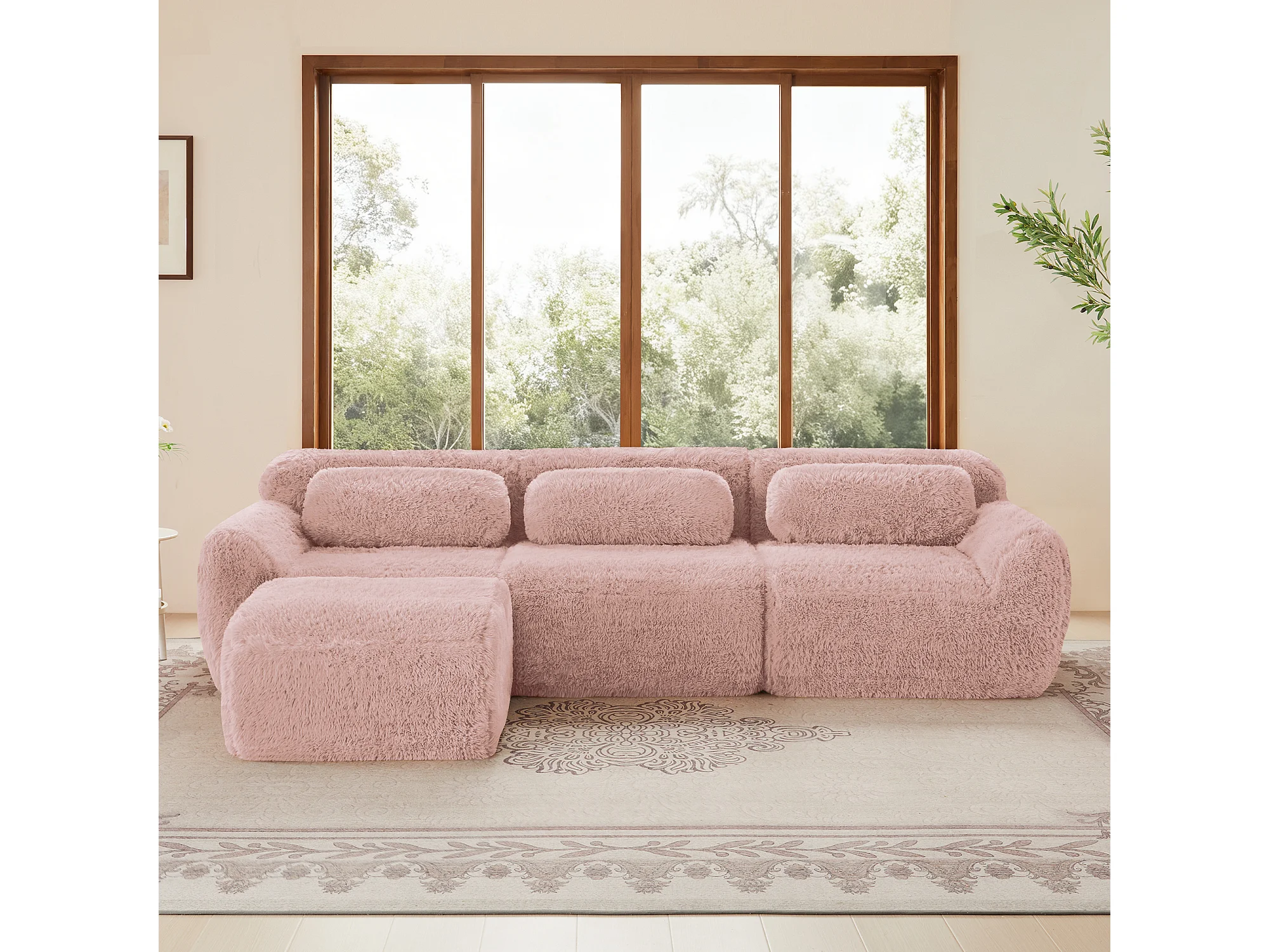Modulaire Hoekbank 3-zits in pluche stof, met poef en 3 kussens, 291x179x73cm, Roze