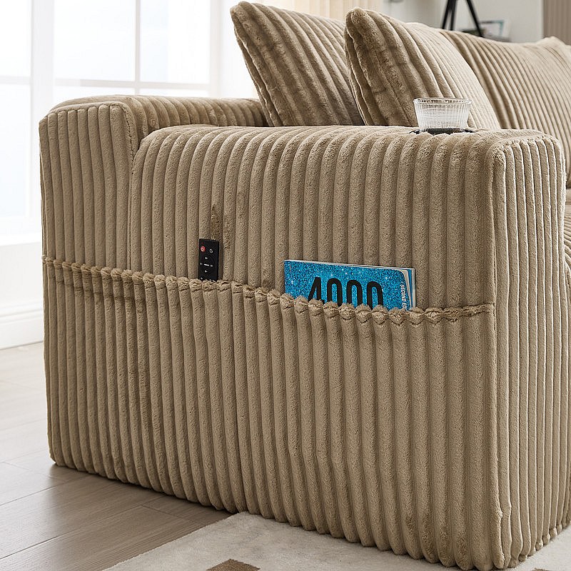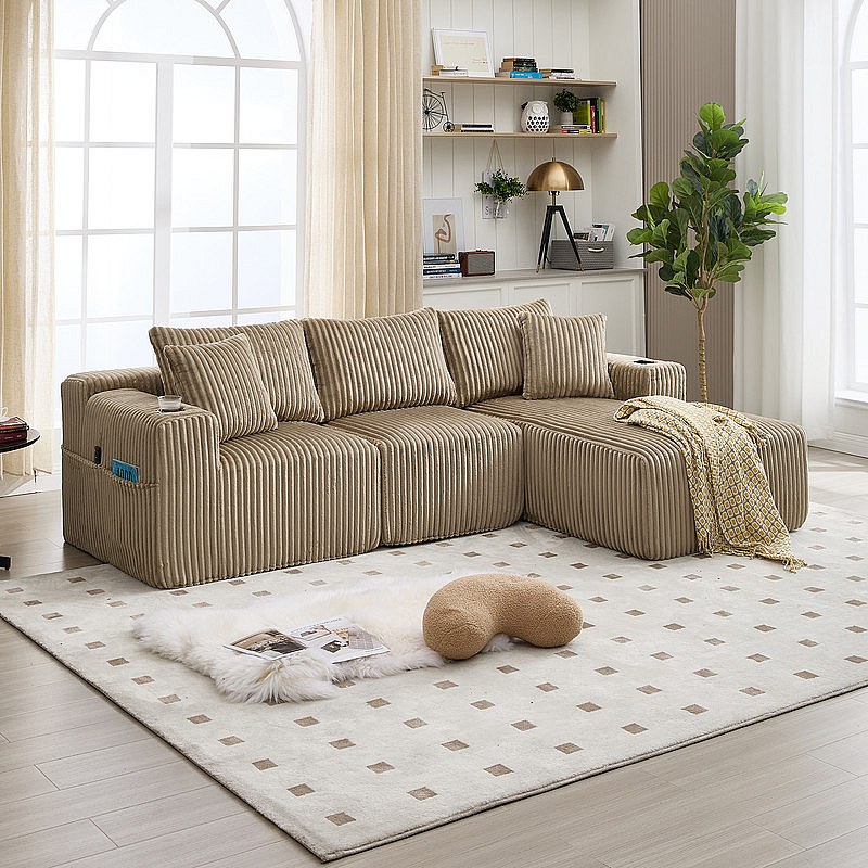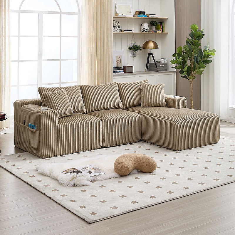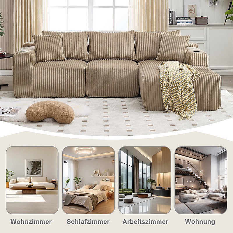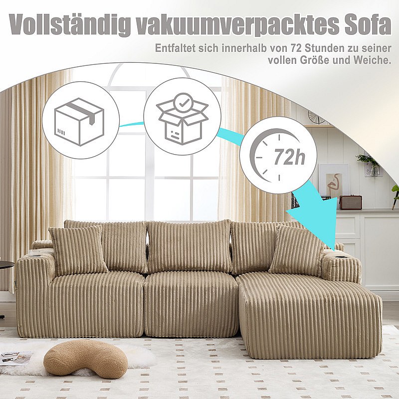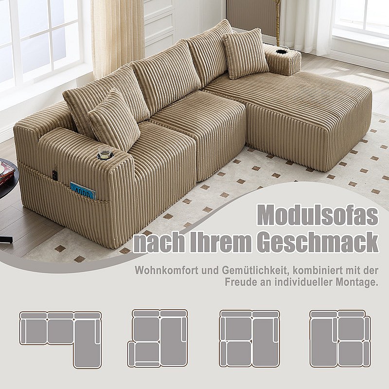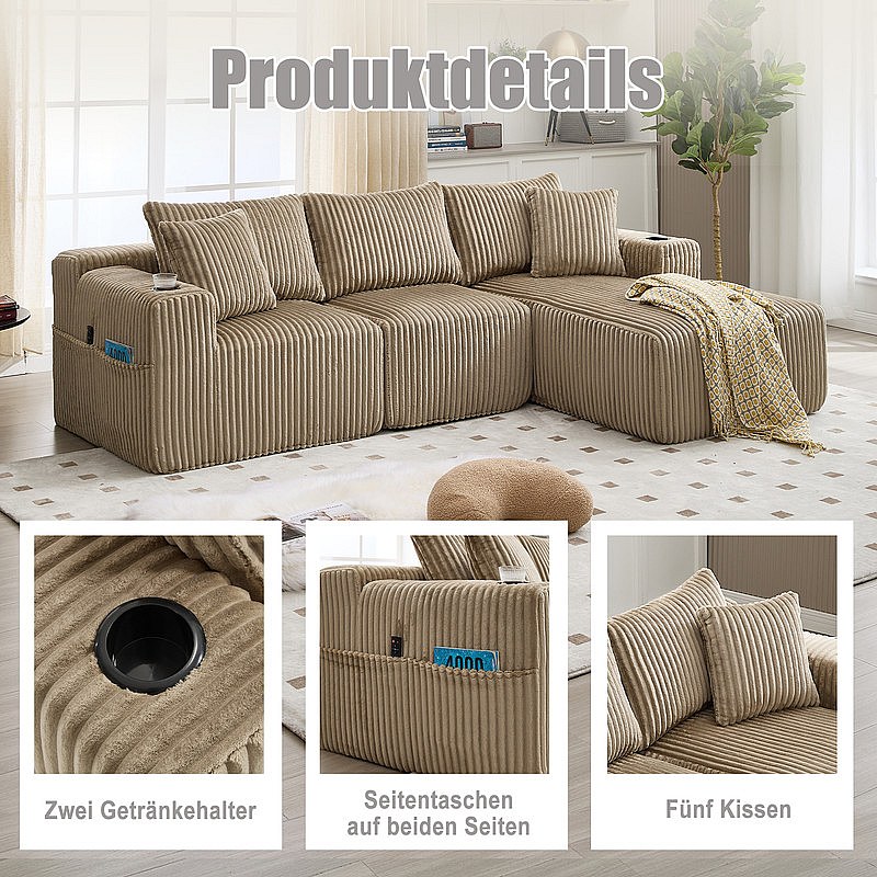Modulaire Hoekbank 3-zits, van Ribfluweel, met Drinkhouder, Kussens en Zijzakken, Lounger 118cm, Kaki