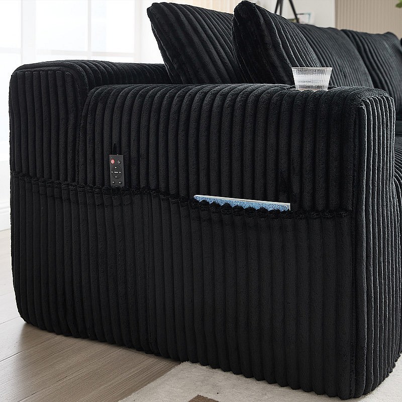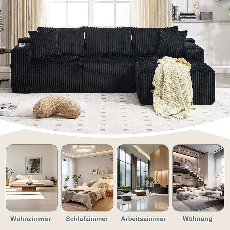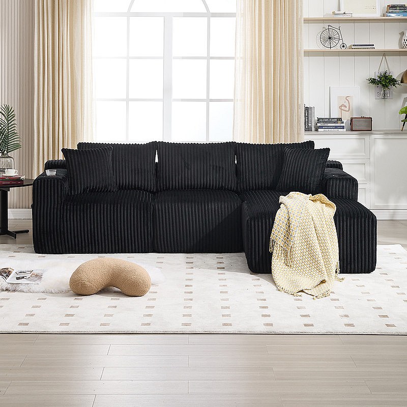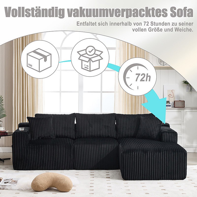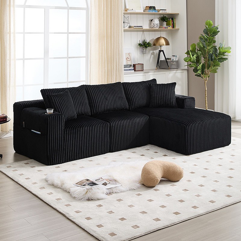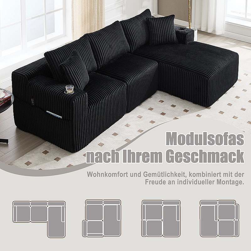 Modulaire Hoekbank 3-zits, van Ribfluweel, met Drinkhouder, Kussens en Zijzakken, Lounger 118cm, Zwart