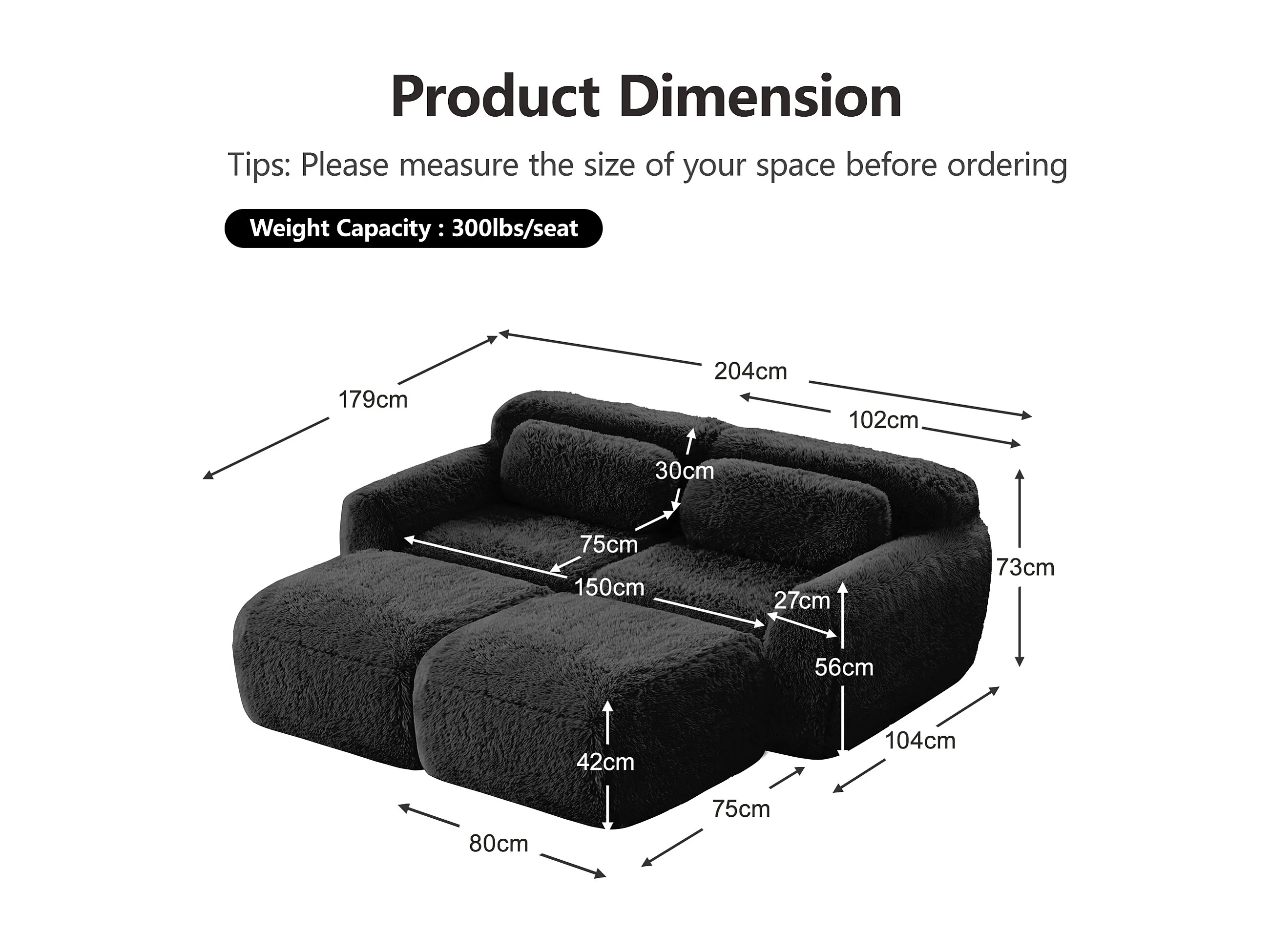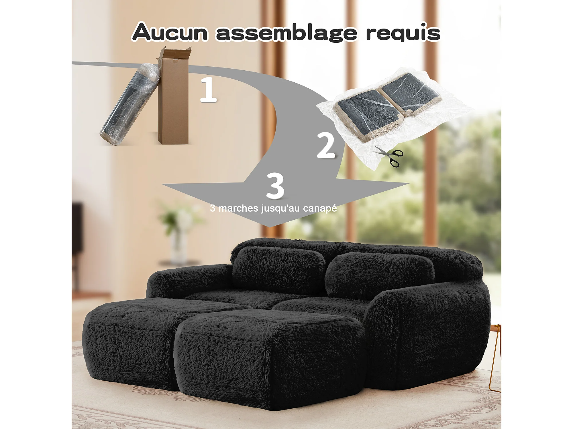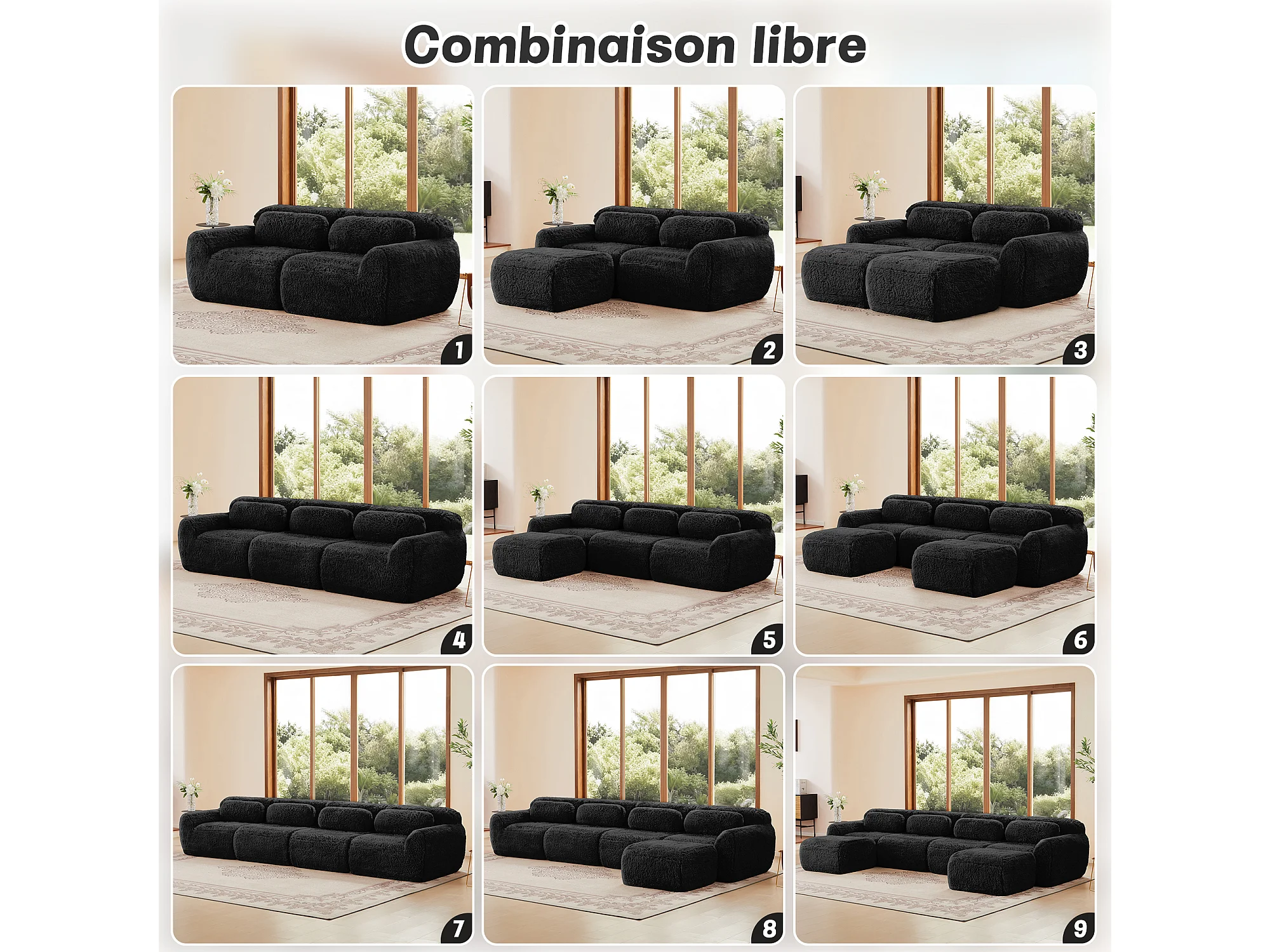Modulaire Hoekbank in pluche stof, met 2 poefs en 2 kussens, 204x179x73cm, Zwart