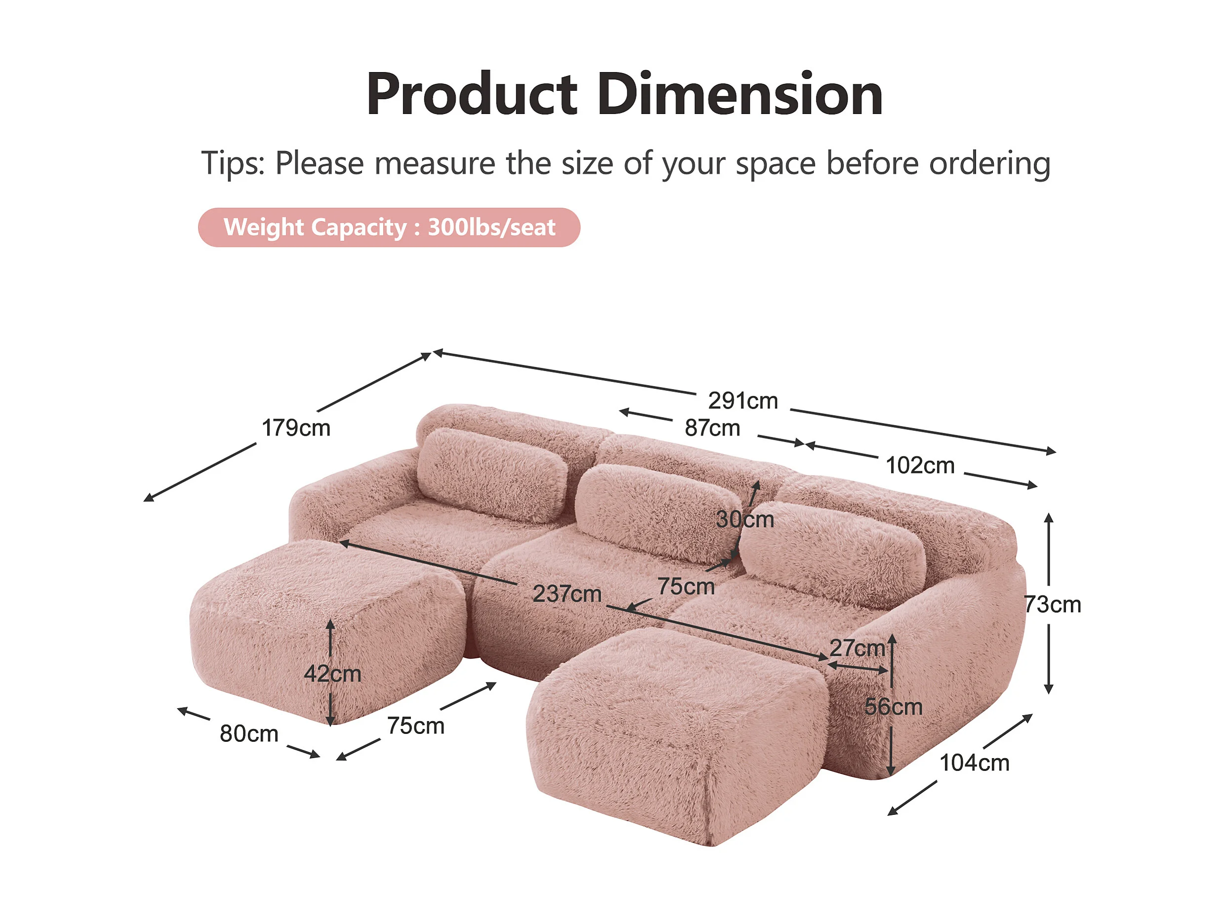Modulaire Hoekbank in pluche stof, met 2 poefs en 3 kussens, 291x179x73cm, Roze