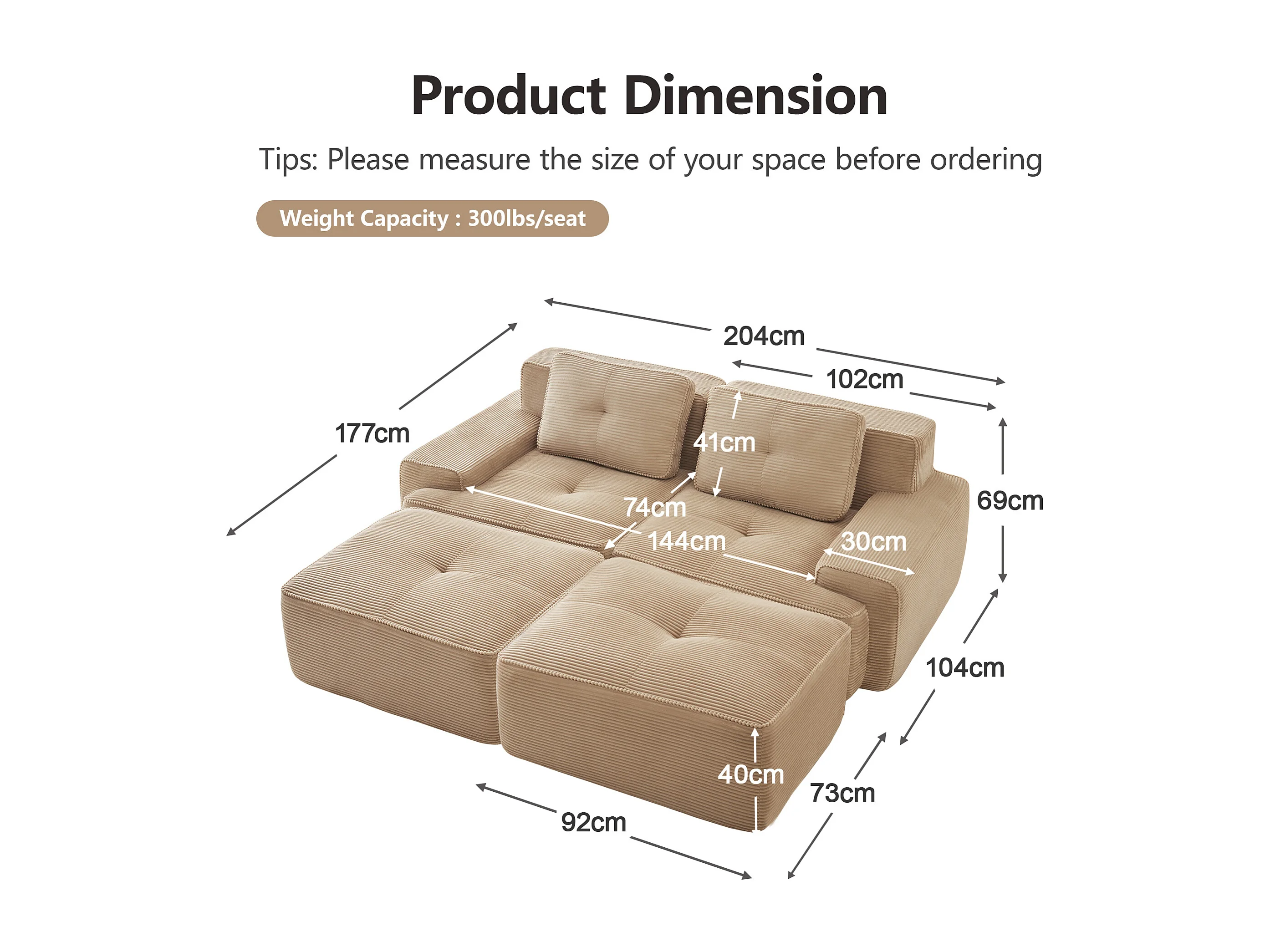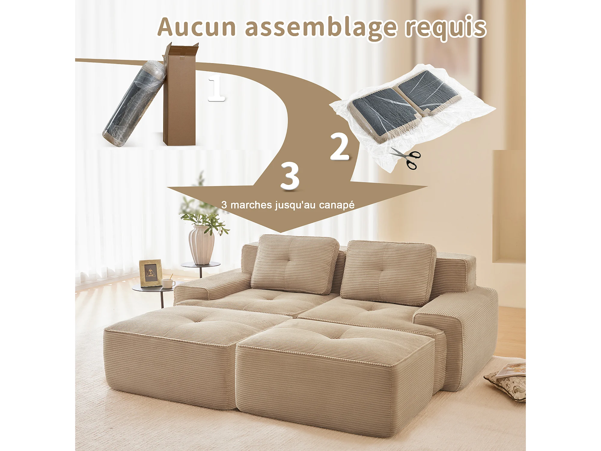 Modulaire Hoekbank in Ribfluweel, met 2 poefs en 2 kussens, 204x177x69cm, Beige