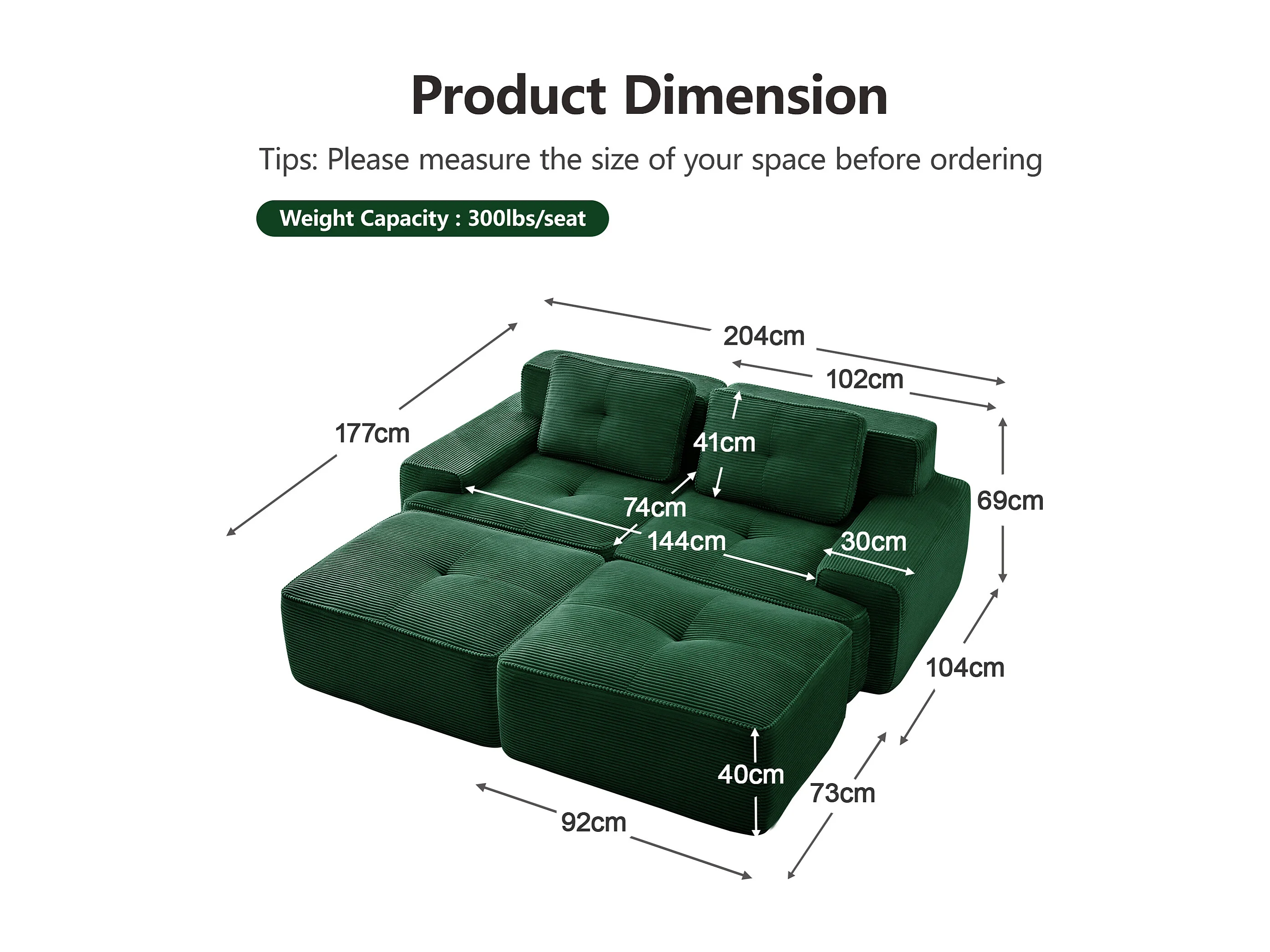 Modulaire Hoekbank in Ribfluweel, met 2 poefs en 2 kussens, 204x177x69cm, Groen