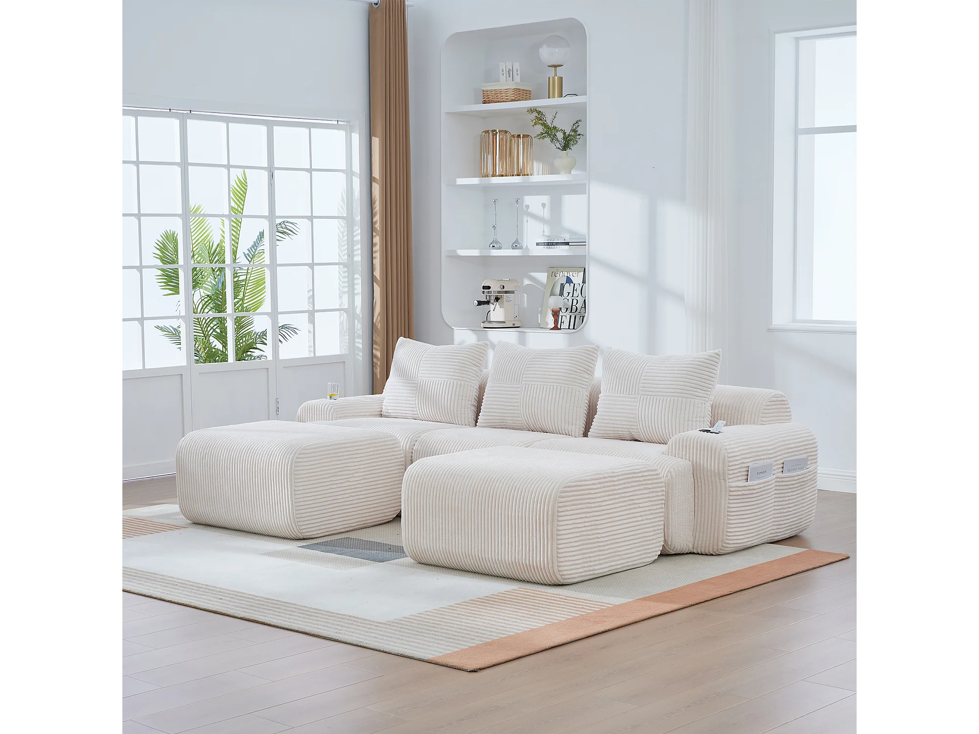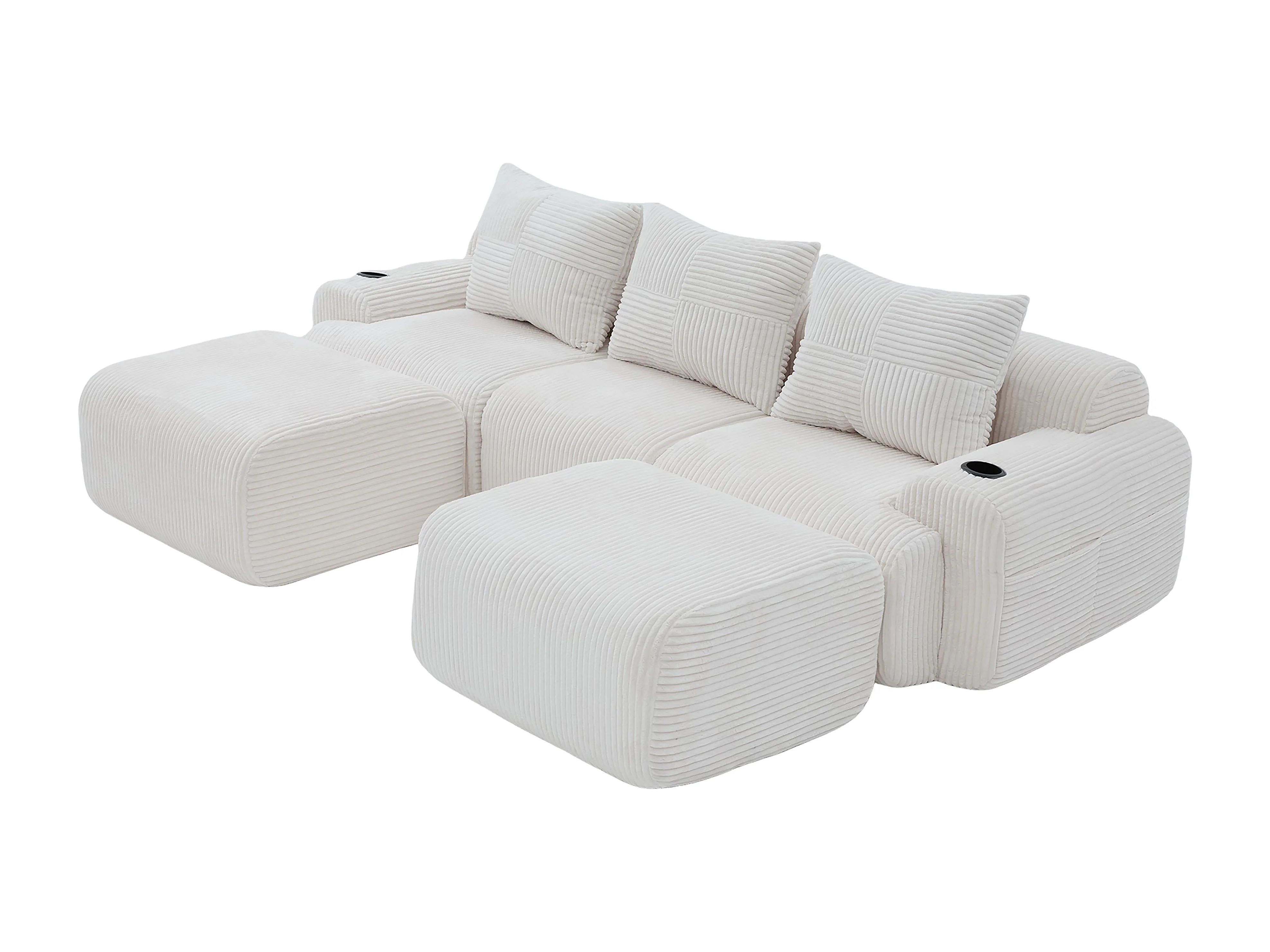 Modulaire hoekbank ribfluweel, bekerhouders, 2 poufs en 3 kussens, 268x174x80cm, Beige