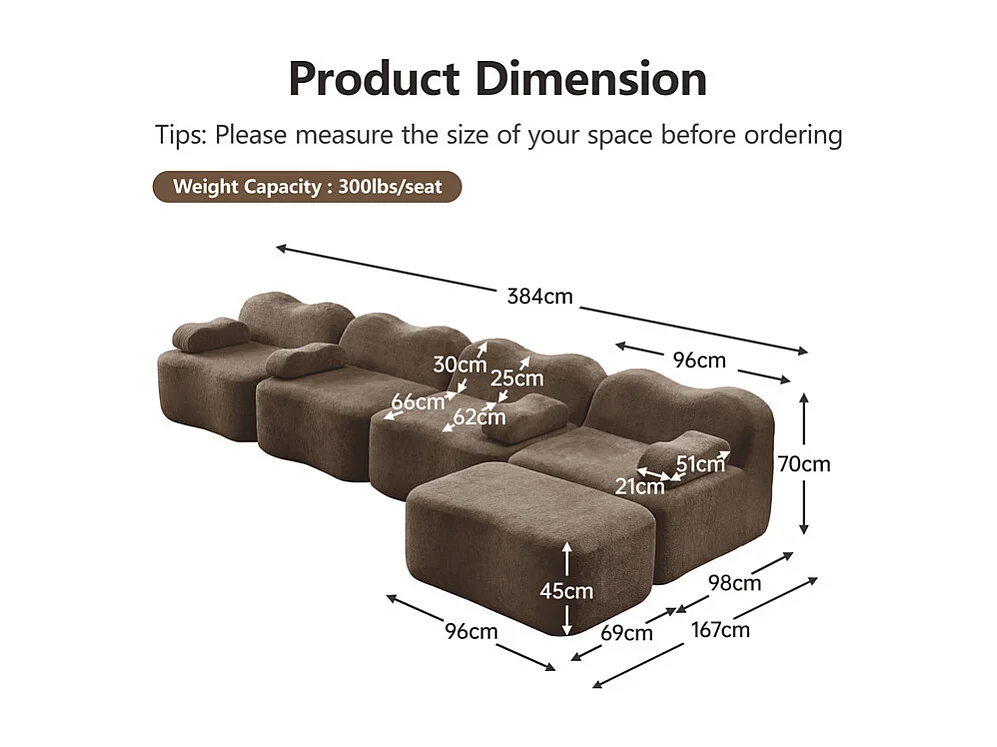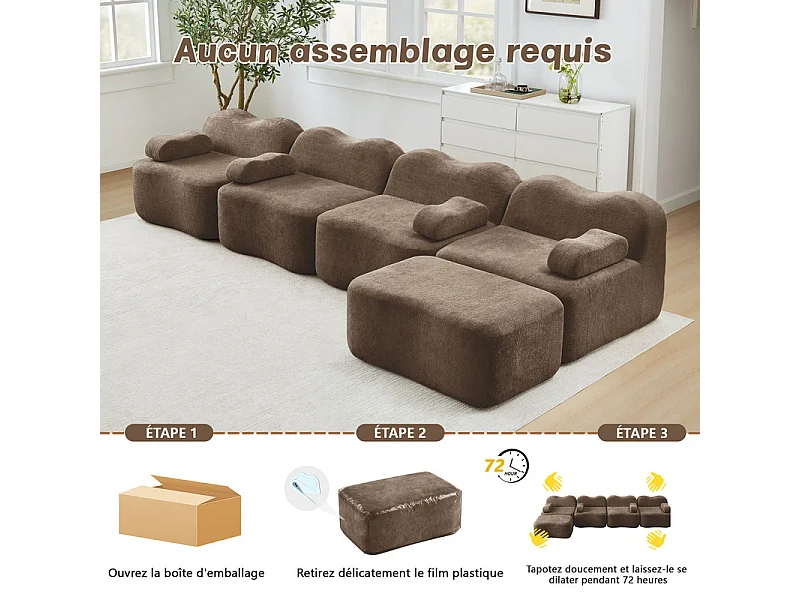 Modulaire hoekbank van fluweel - 4-zits - met poef en armleuningskussen - 384x167x70cm - Bruin