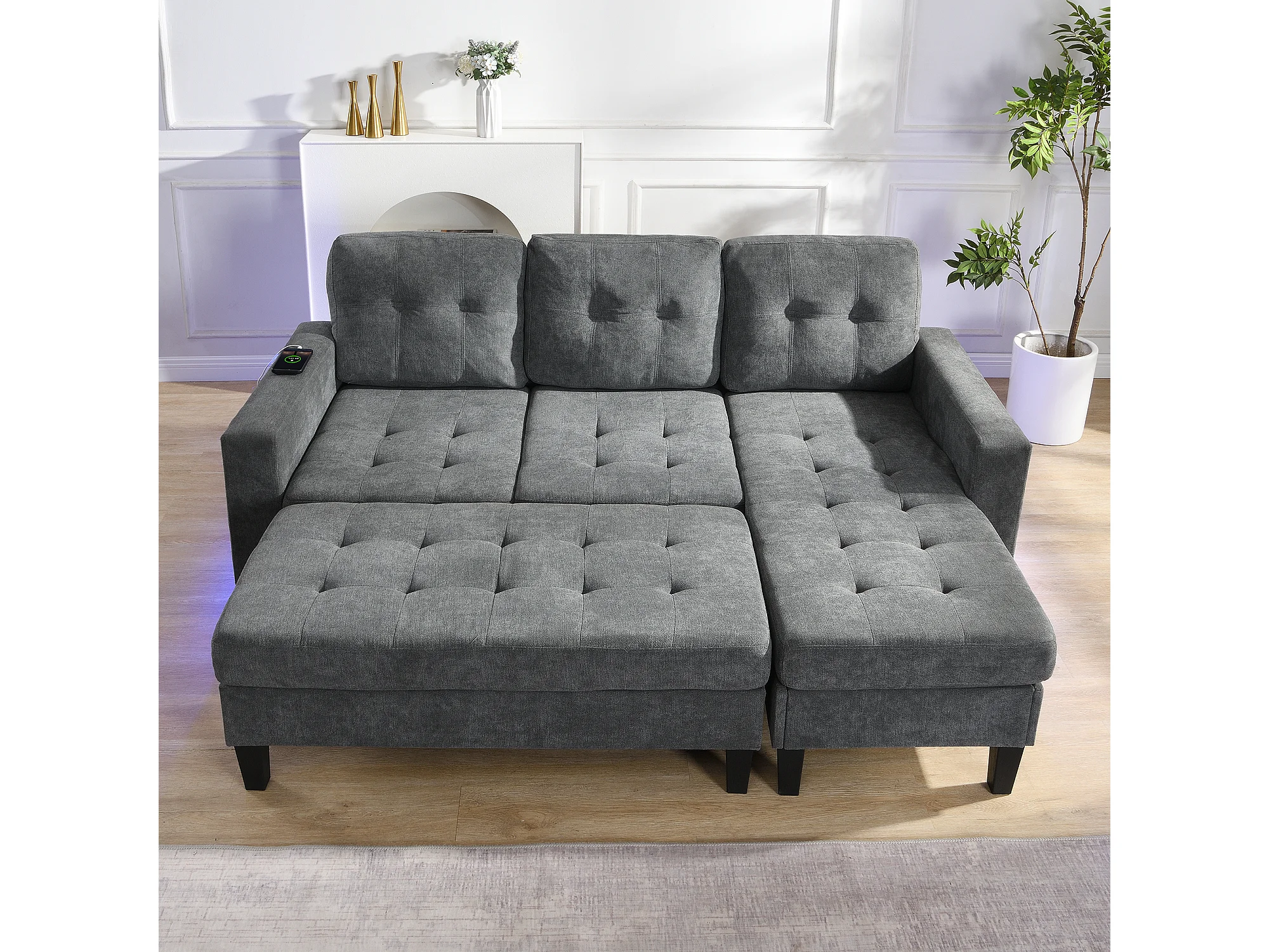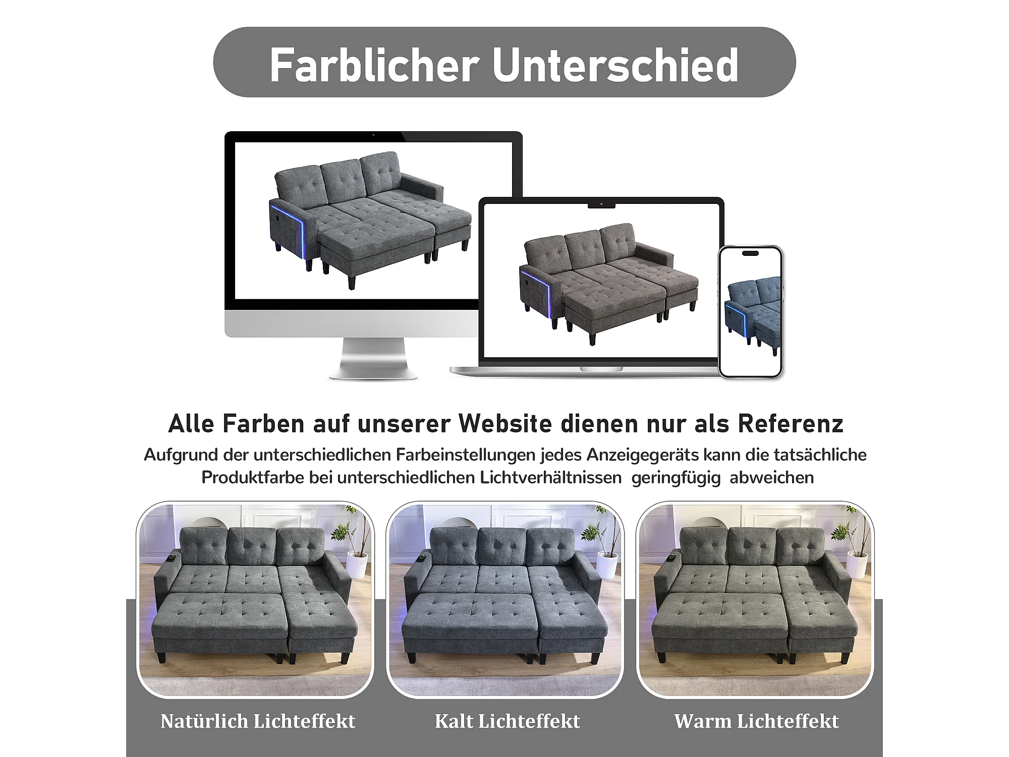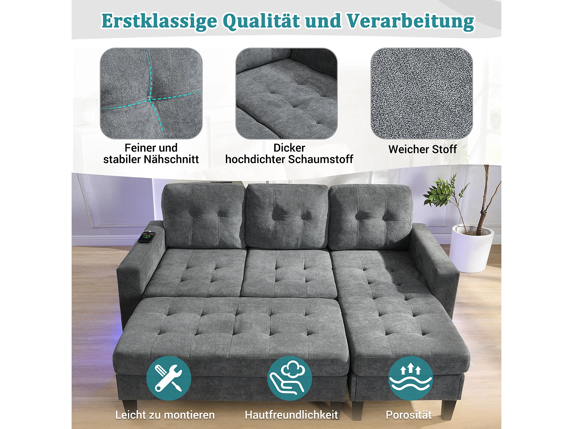 Modulaire L-vormige bank met uitneembare voetenbank en LED-verlichting, 3-zits, antiekgrijs (185x135x85 cm)