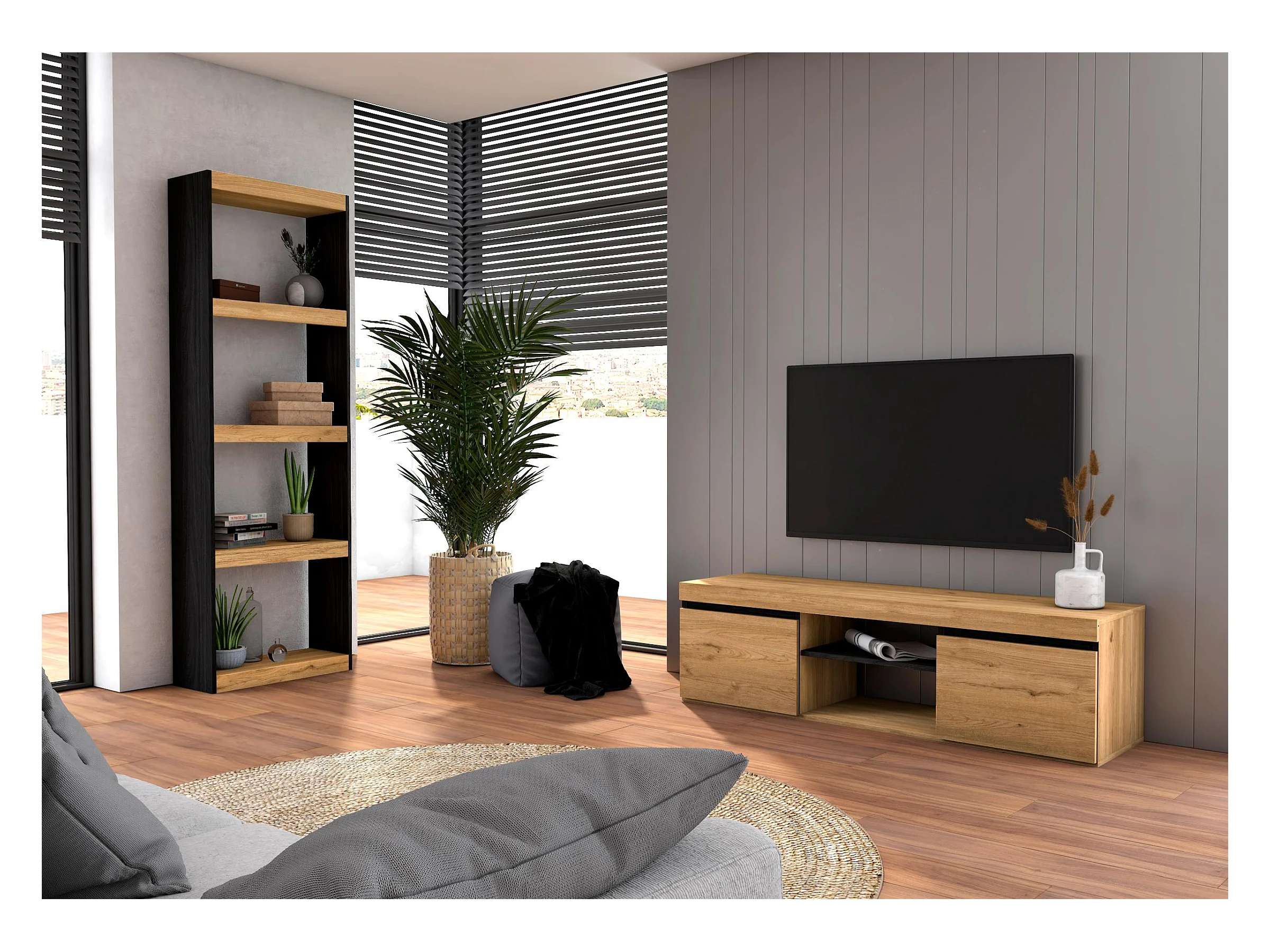 Modulaire woonkamer set, Natuur- en totem -model, 140x40x41cm / 60x25x181cm, Tv -meubels en plank, Eik en zwart, Industriële stijl