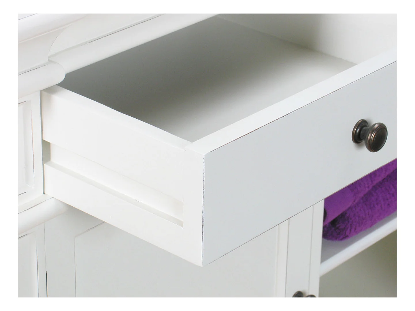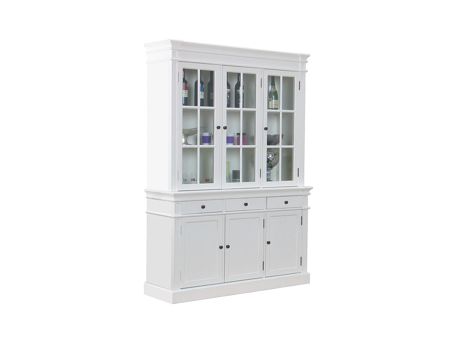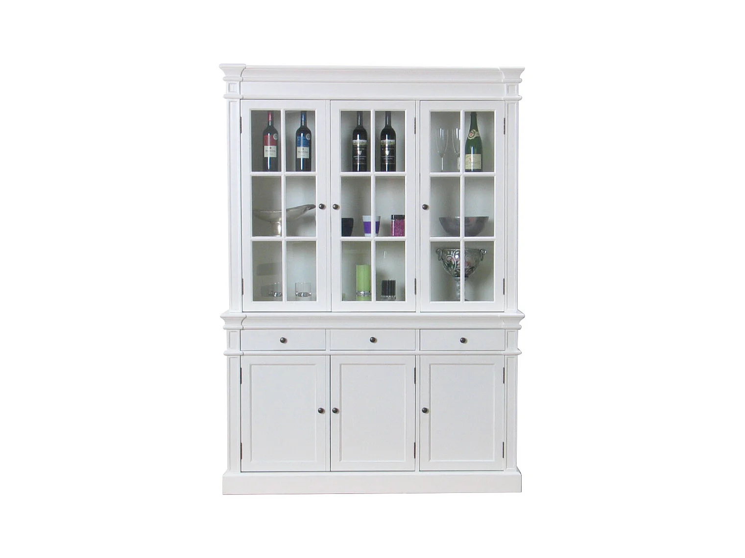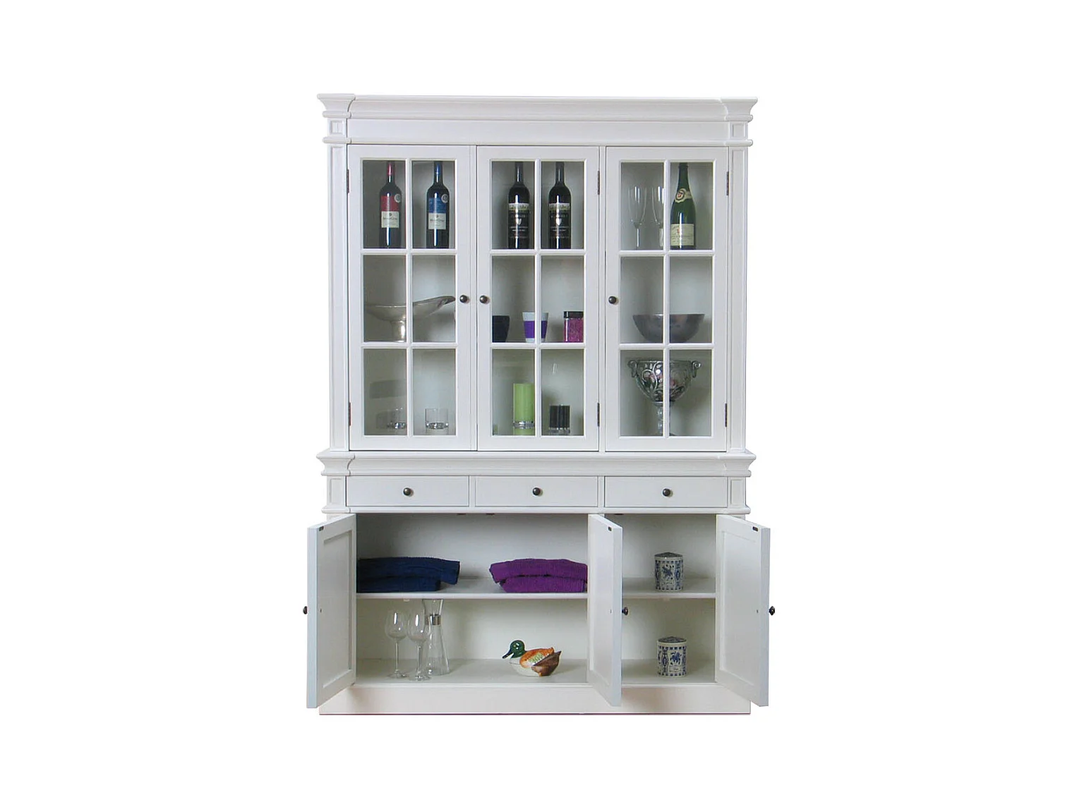 Mozart 3-deurs vitrinekast in antiek wit, antiek gepatineerd. Breedte 142 cm, hoogte 200 cm.