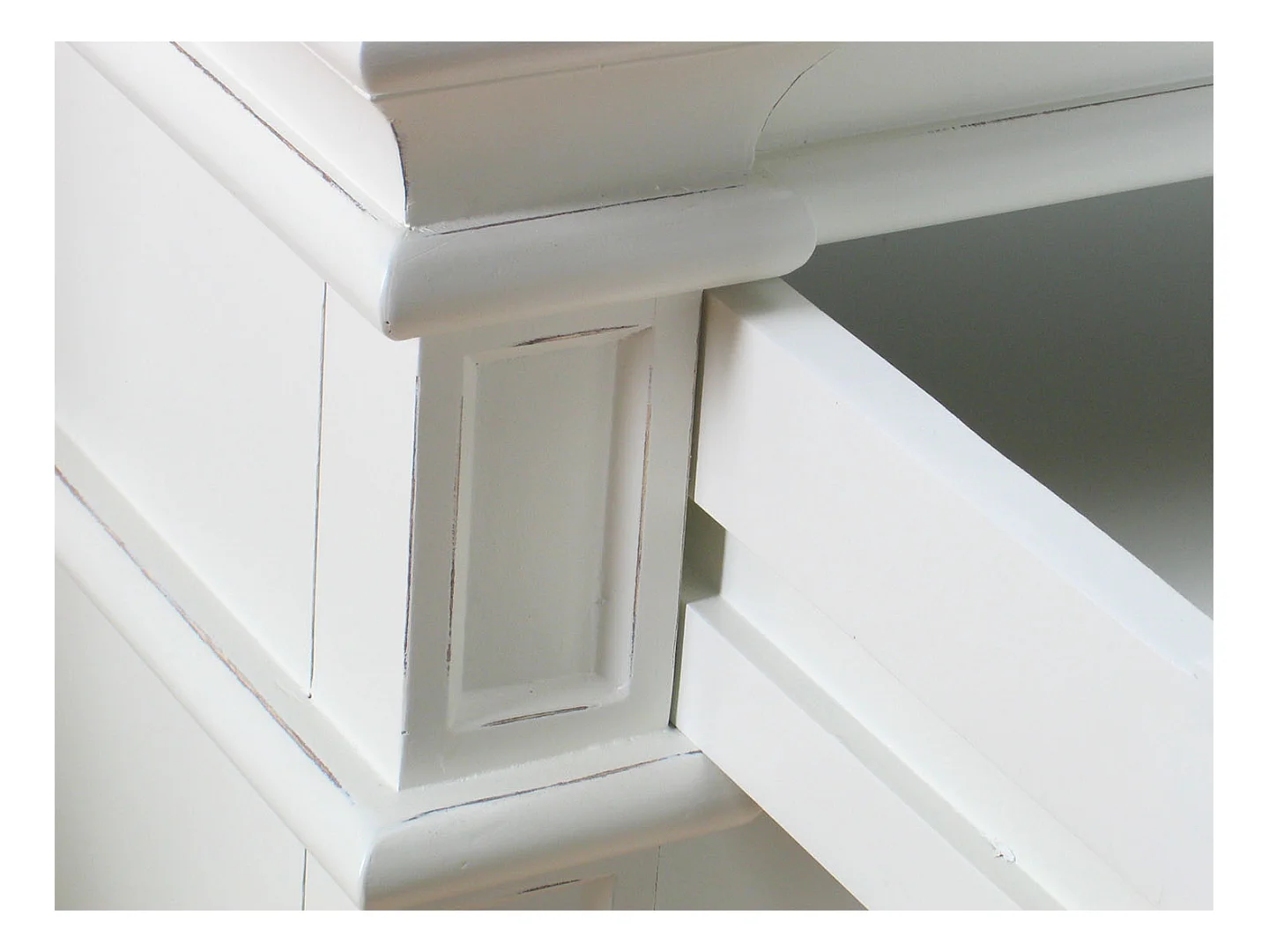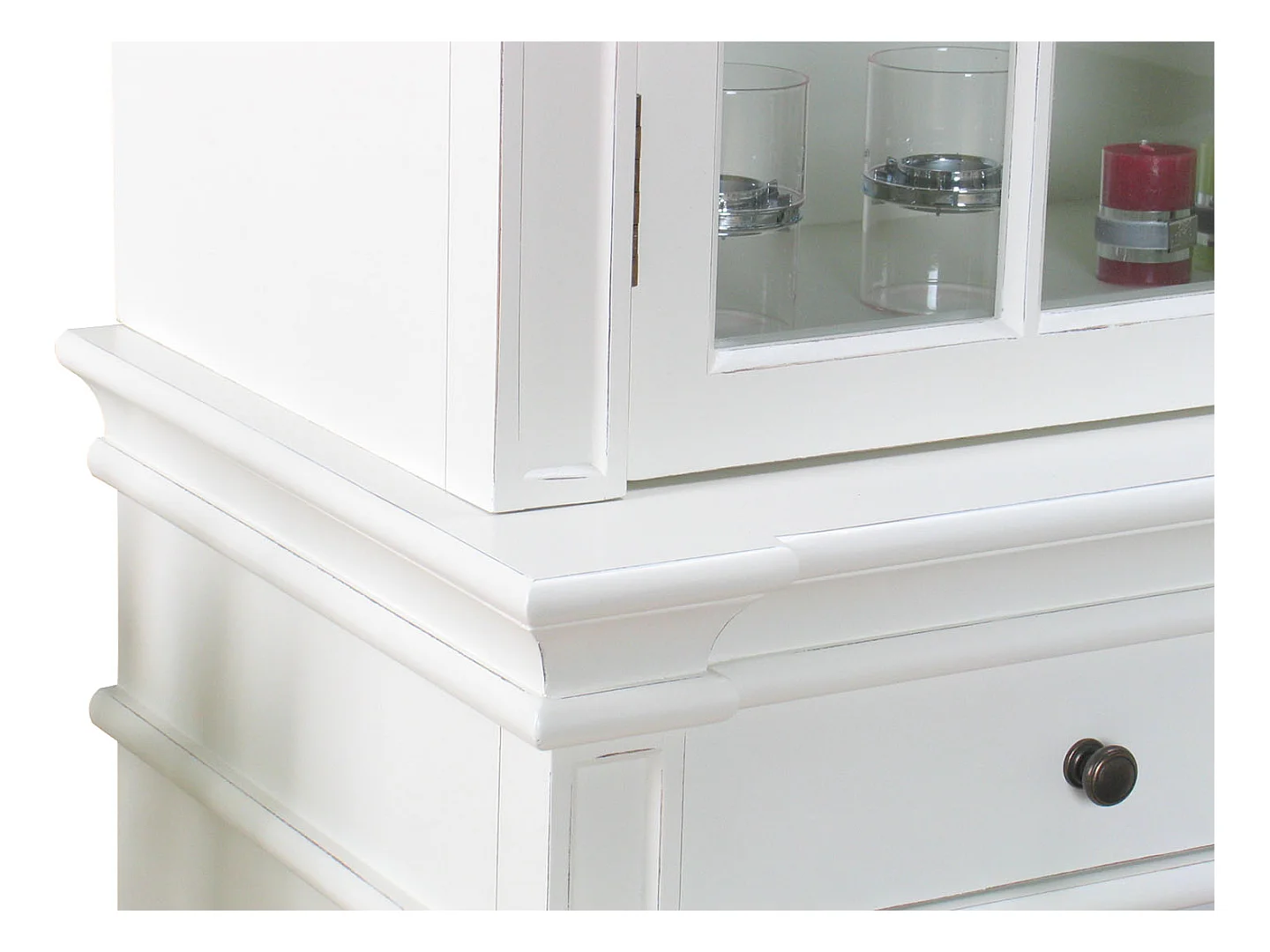Mozart 4-deurs vitrinekast in antiek wit, antiek gepatineerd. Breedte 186 cm, hoogte 200 cm.