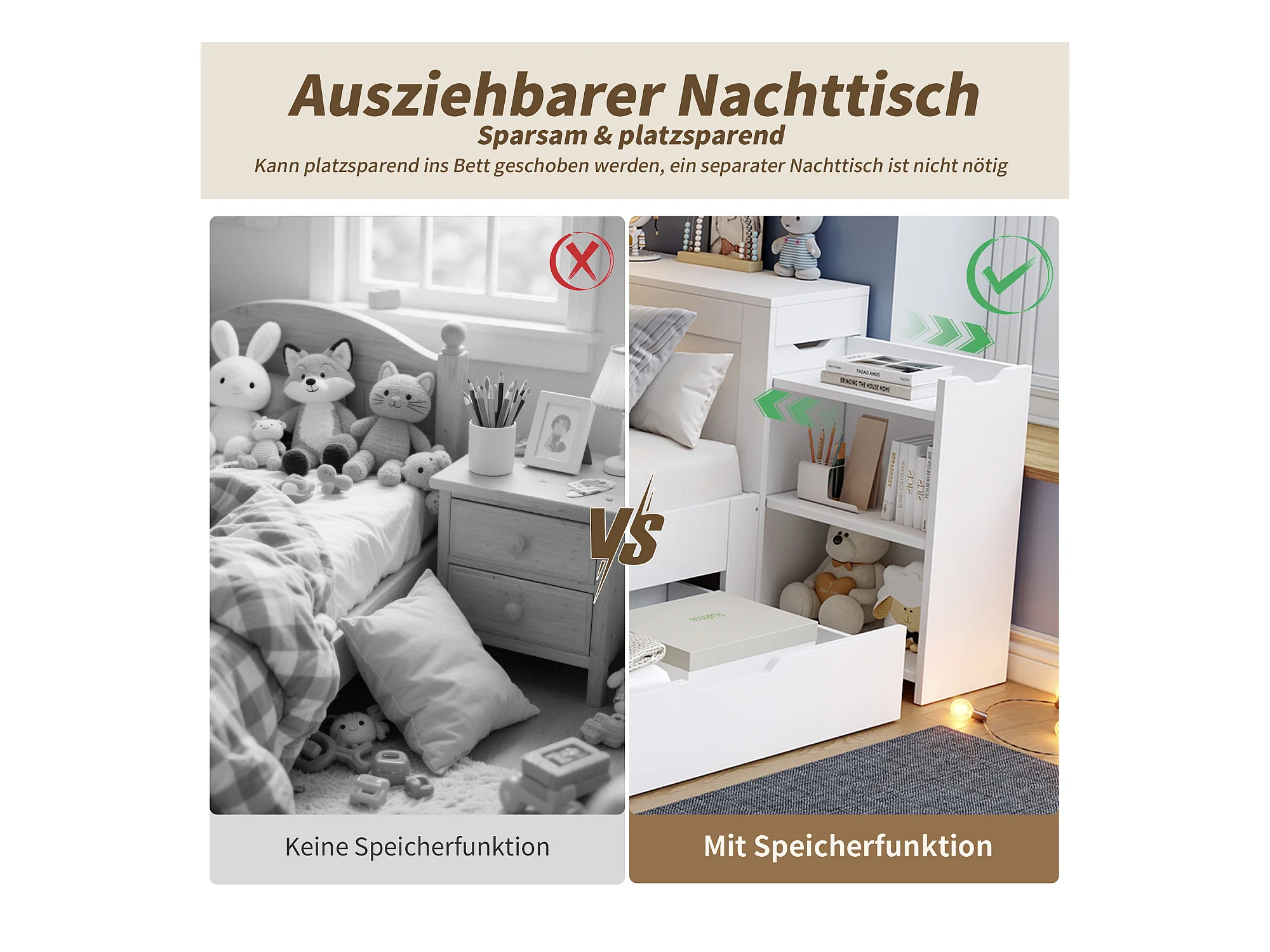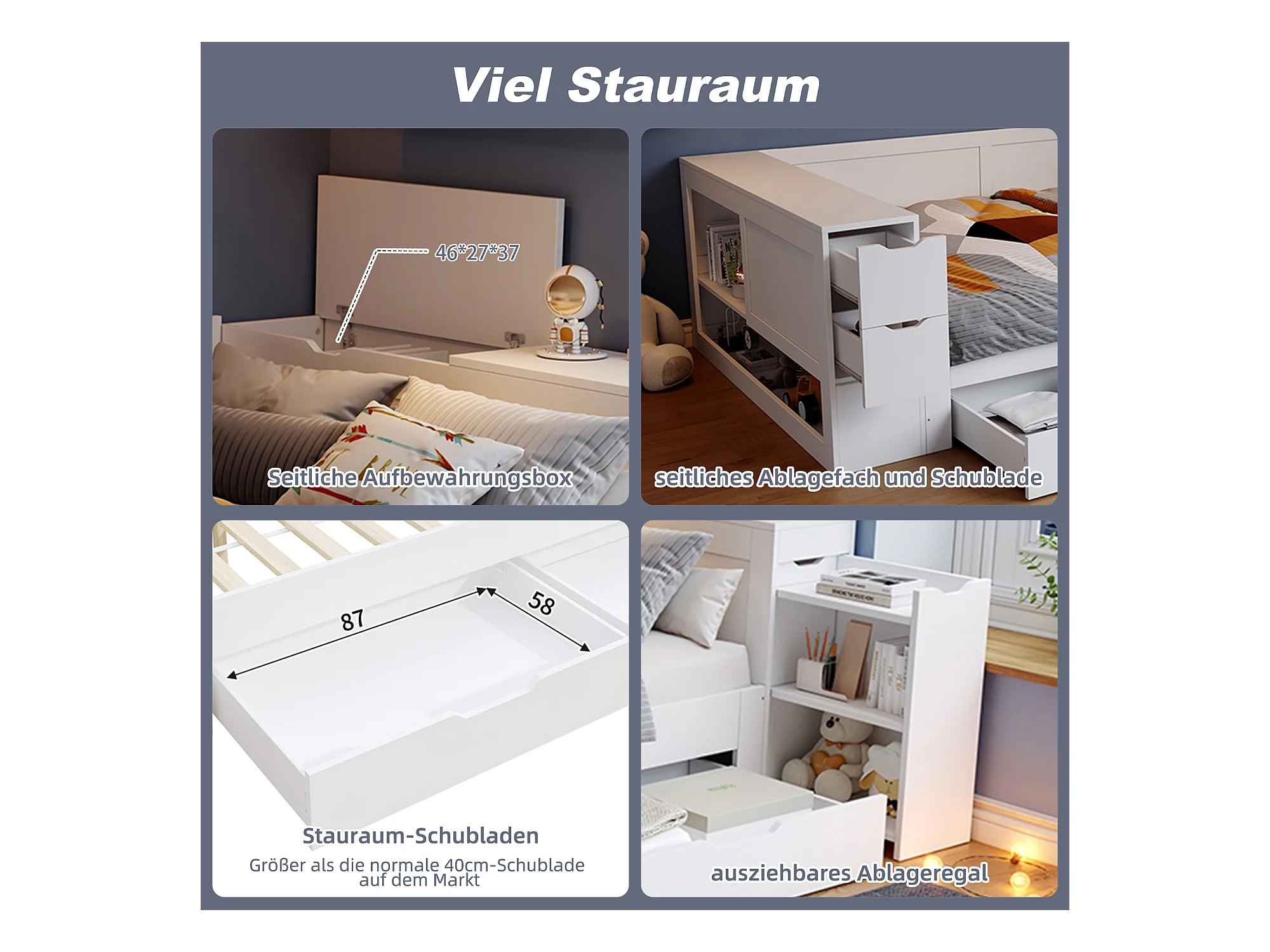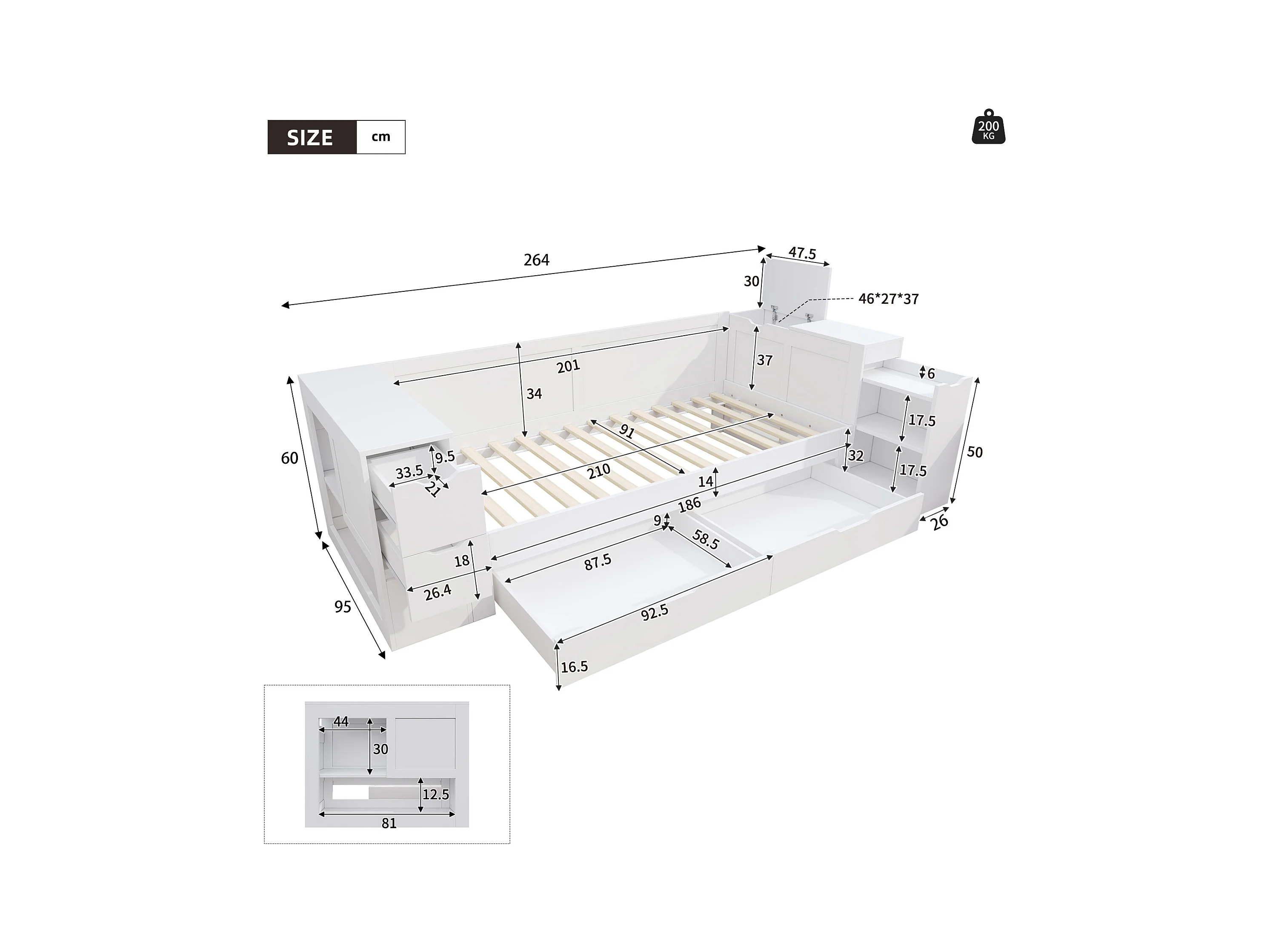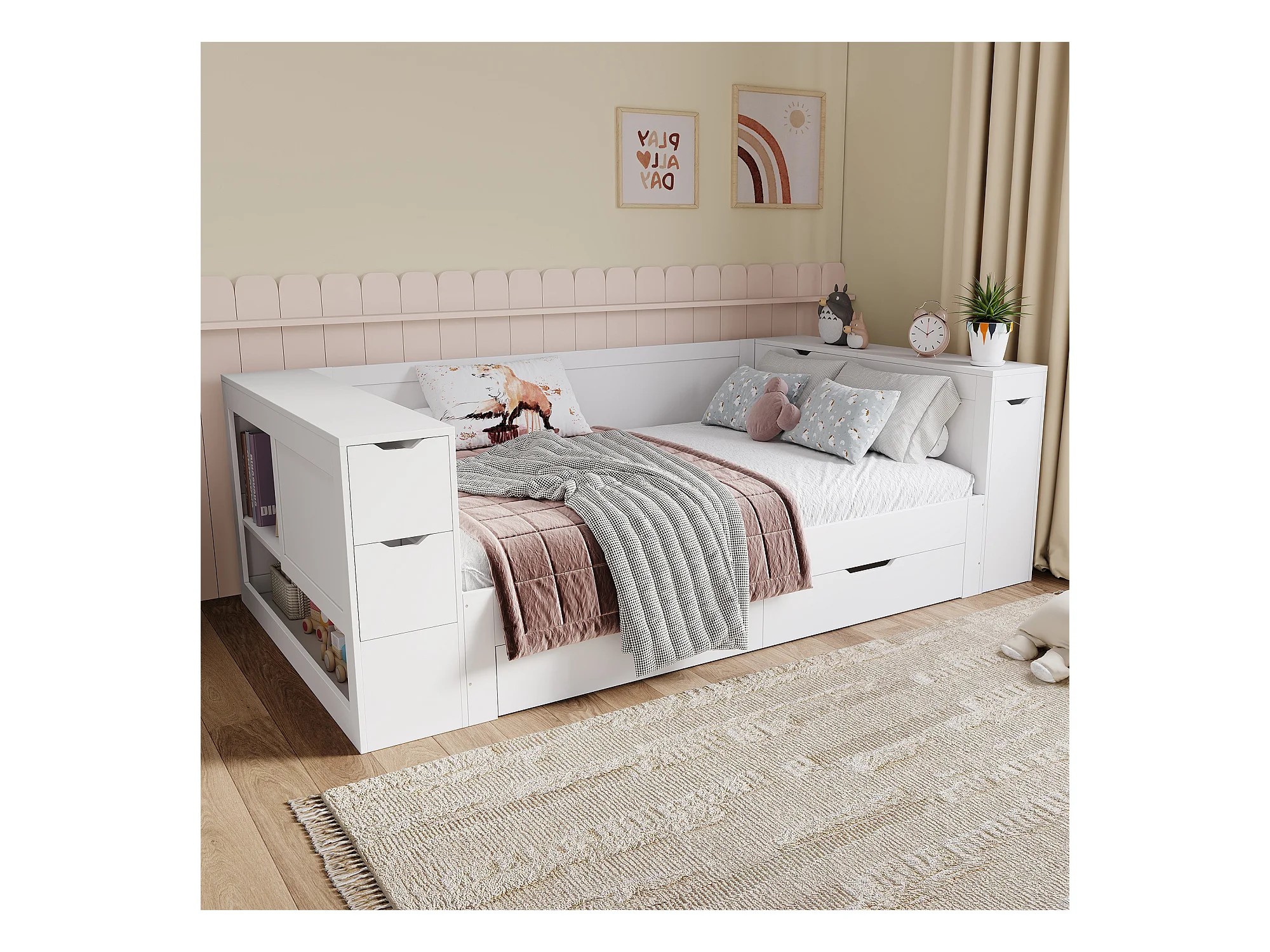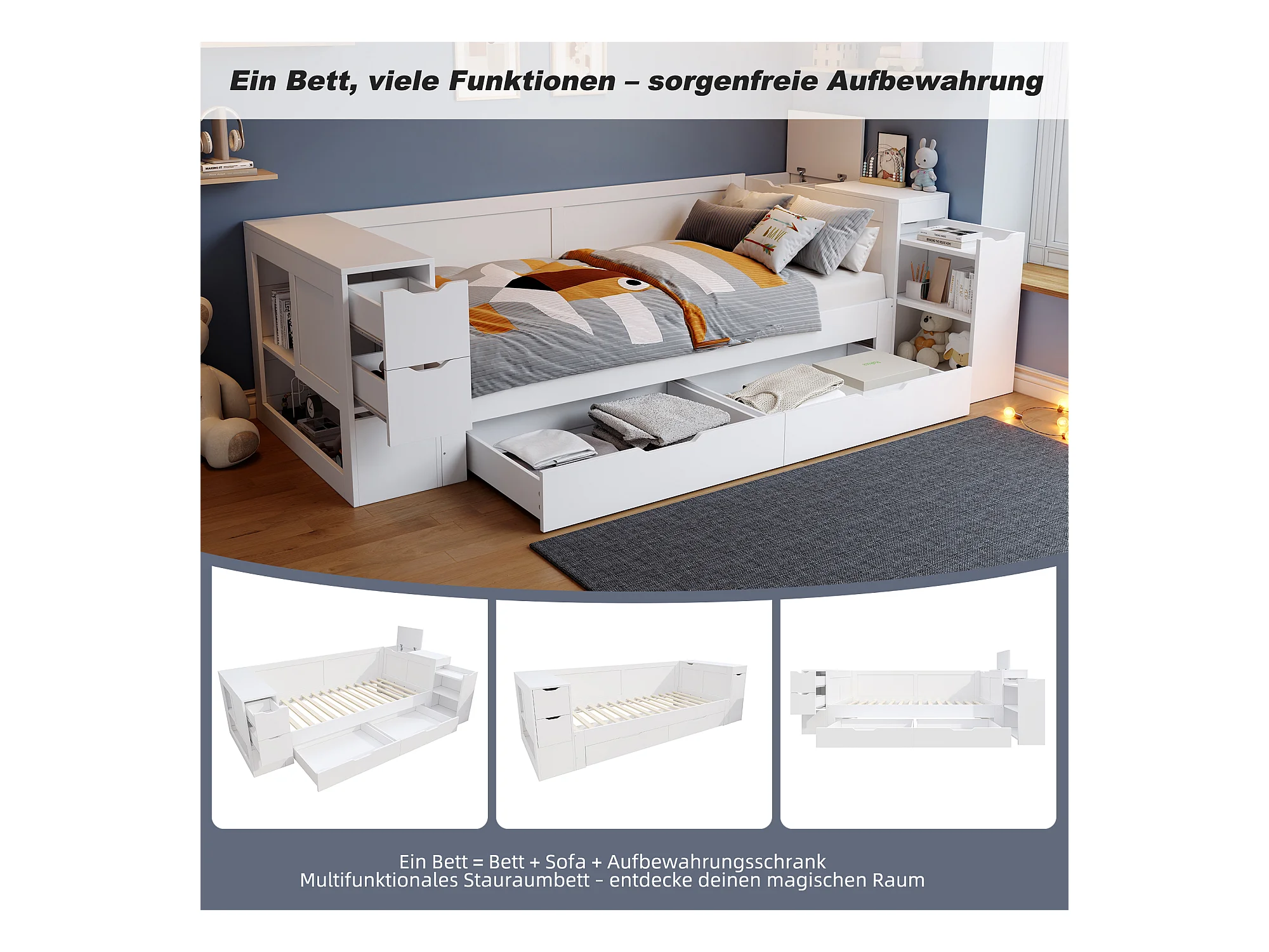 Multifunctioneel bed 90x200 cm, met lattenbodem, hoofdbord, opbergruimte en 1 nachtkastje, MDF, wit (90x200x60 cm)