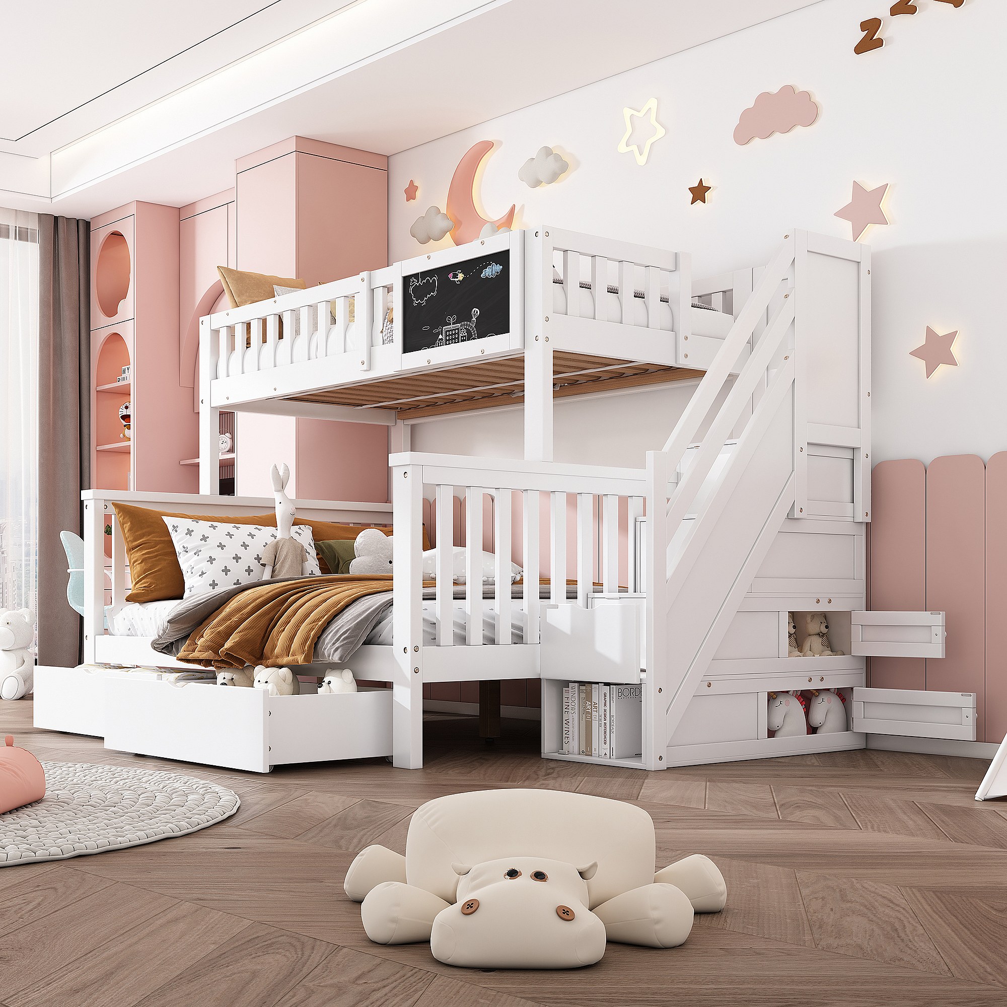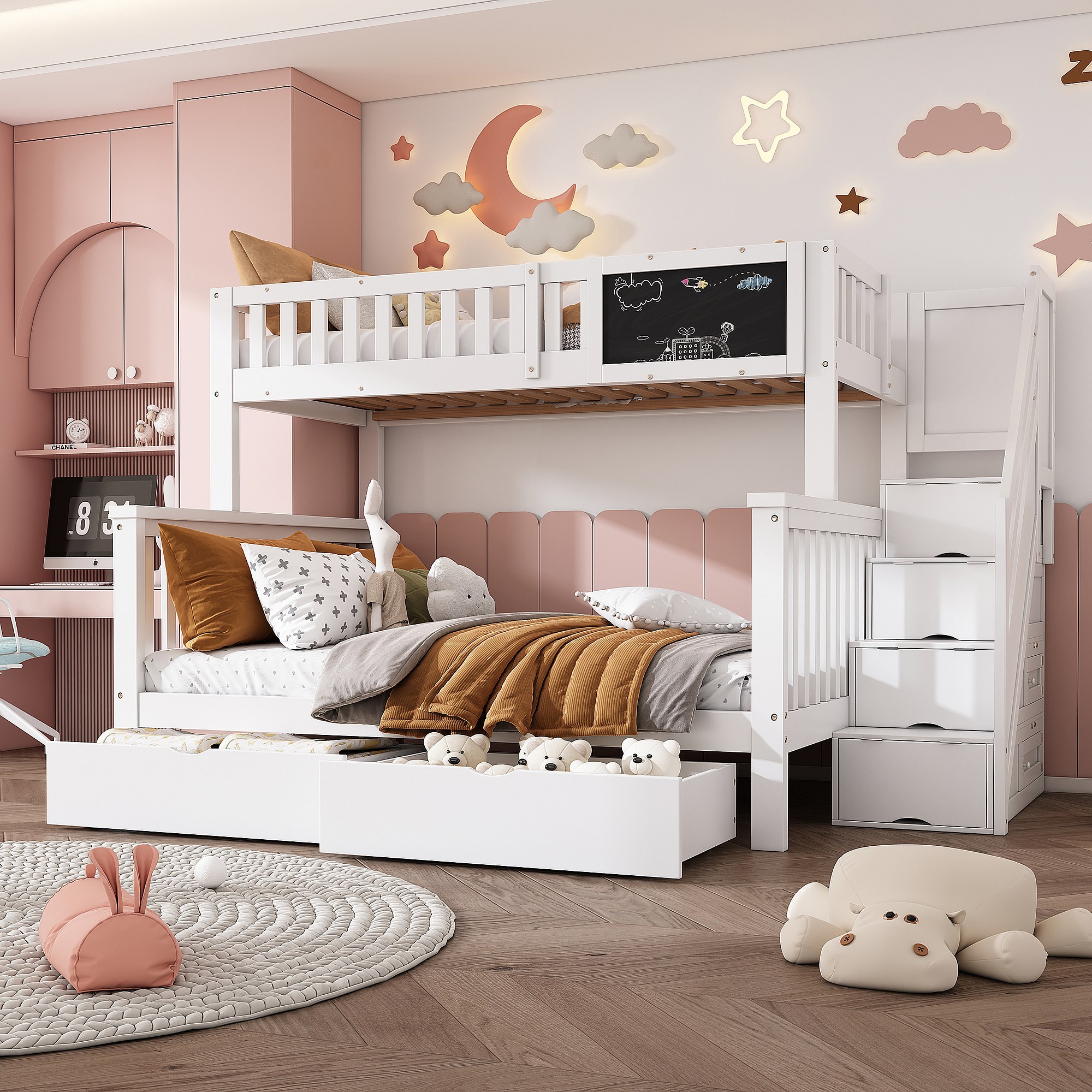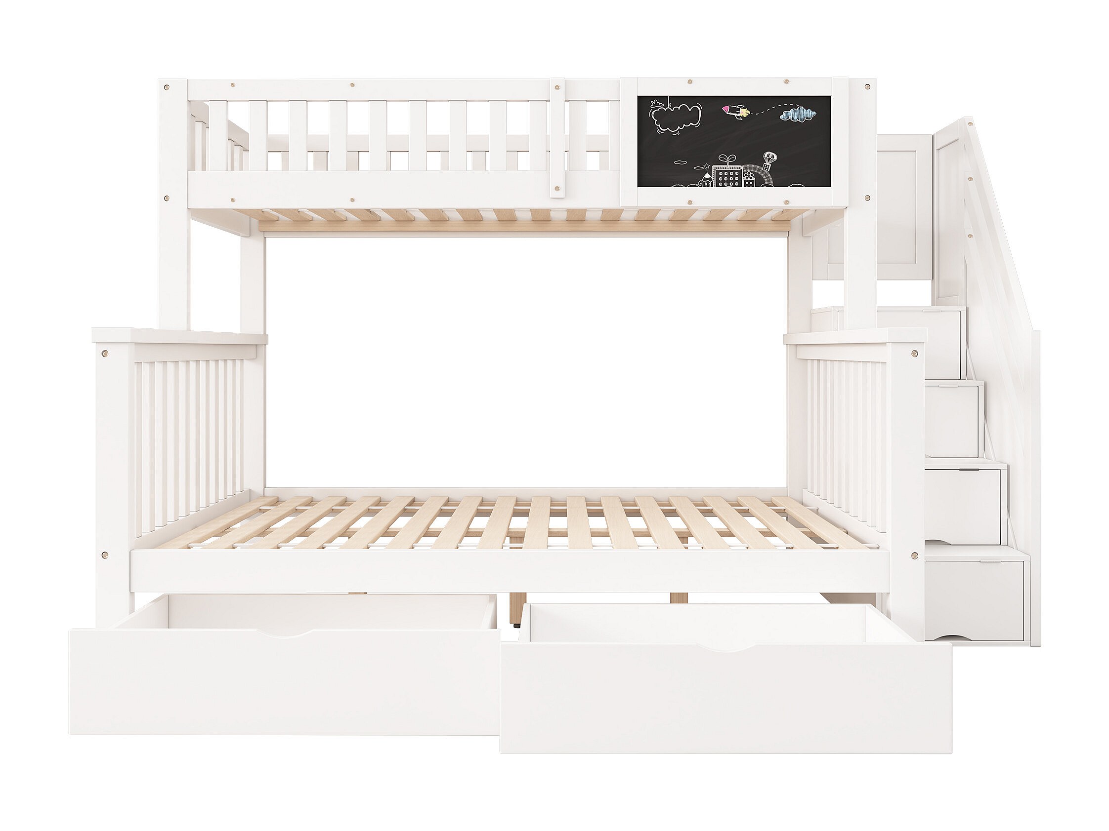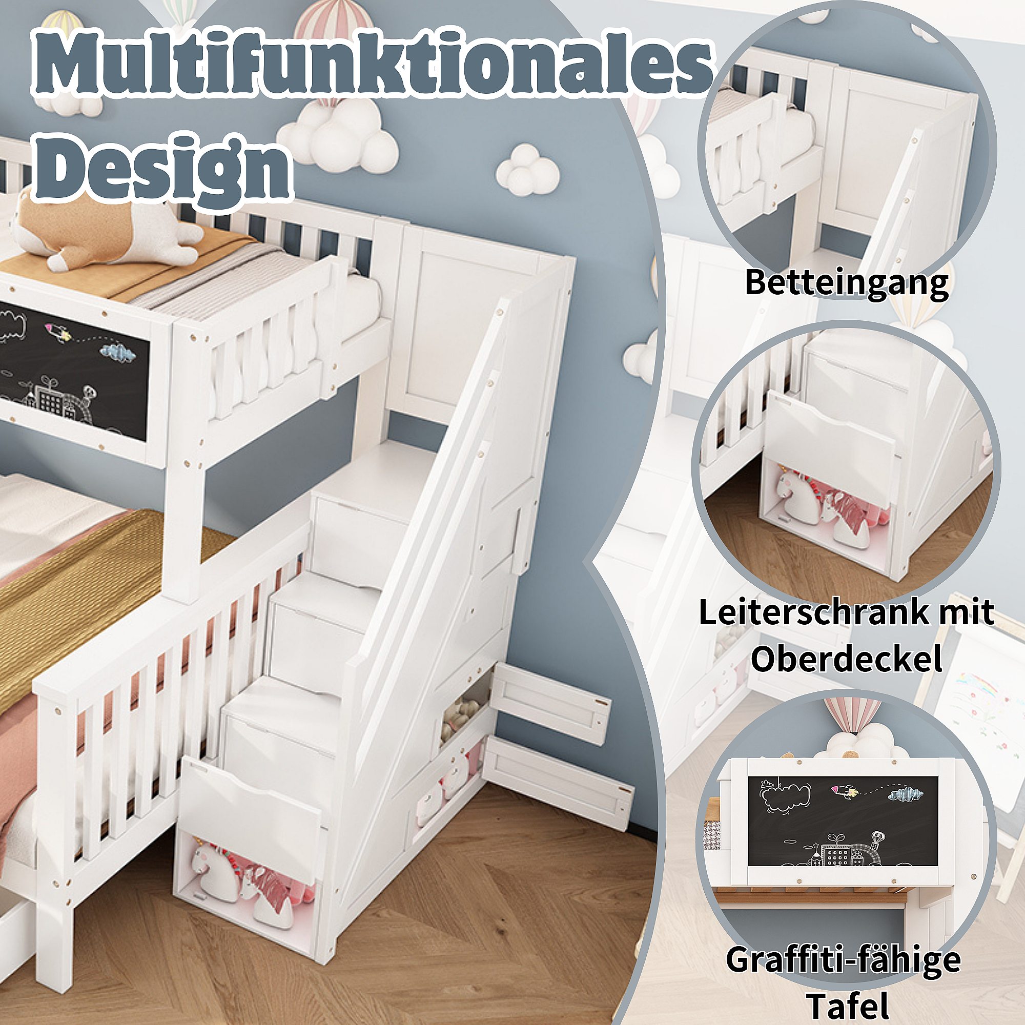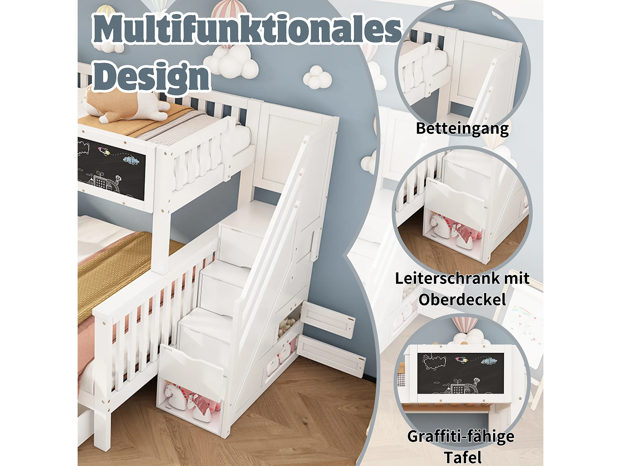 Multifunctioneel kinderstapelbed met tafel en lades, massief hout, wit (90x200+140x200 cm)