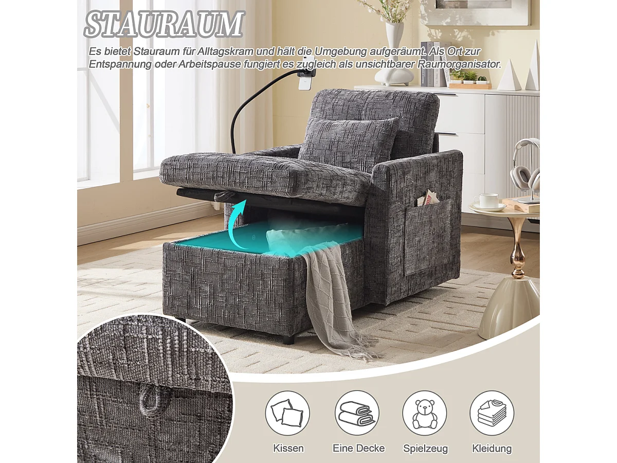 Multifunctionele bank met houder voor mobiele telefoon, fauteuil van chenille voor de woonkamer.