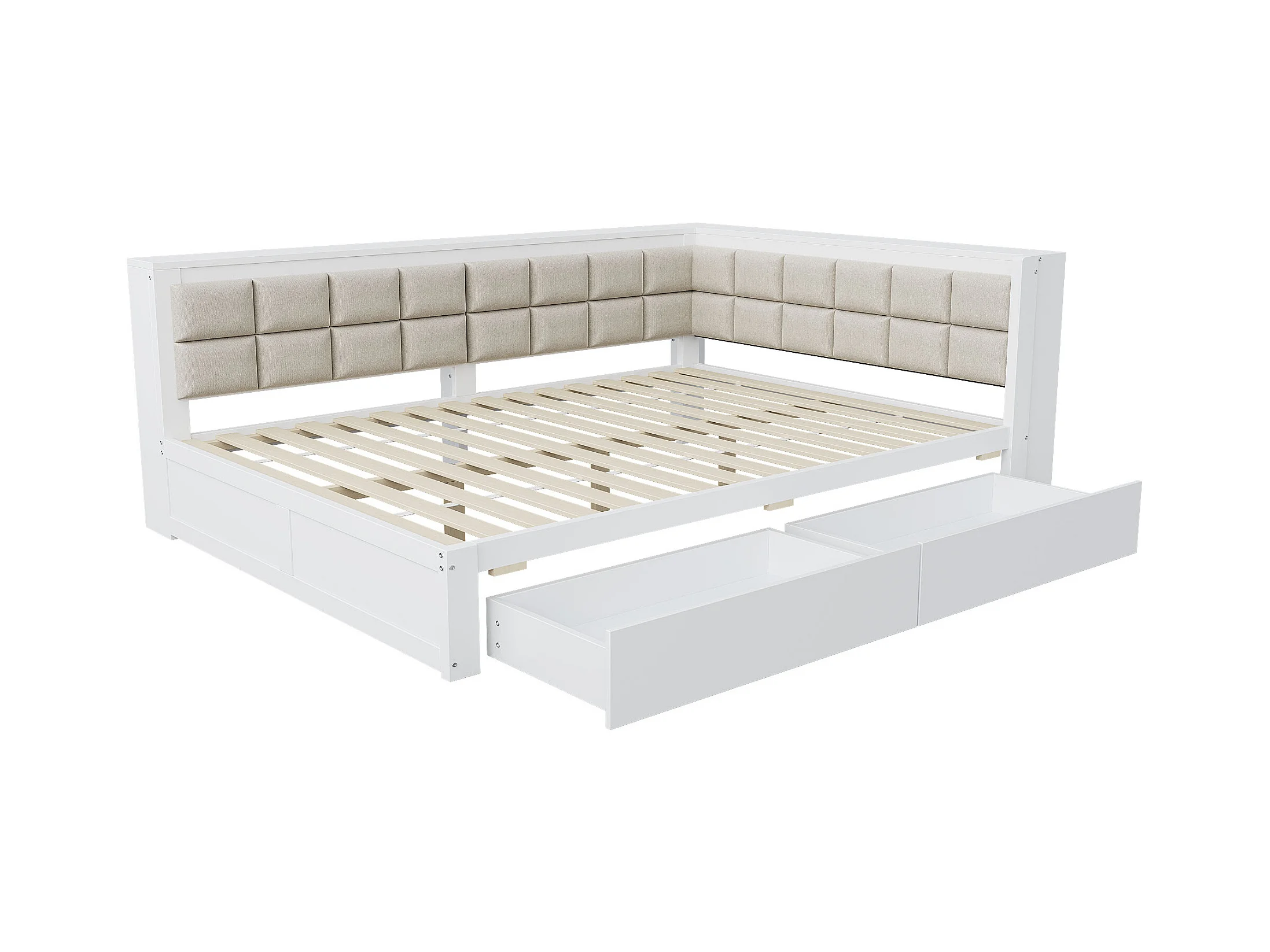 Multifunctionele slaapbank 140x200, ergonomische rugleuning, grote opberglades, grenen frame, witte afwerking (204,5x146,5x71 cm)
