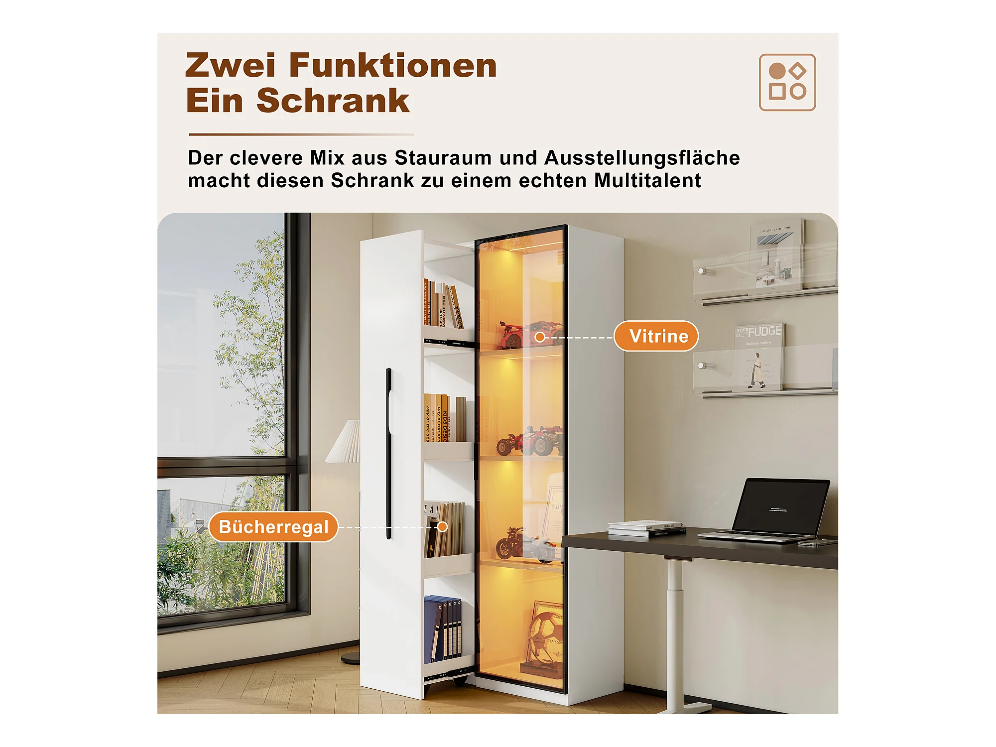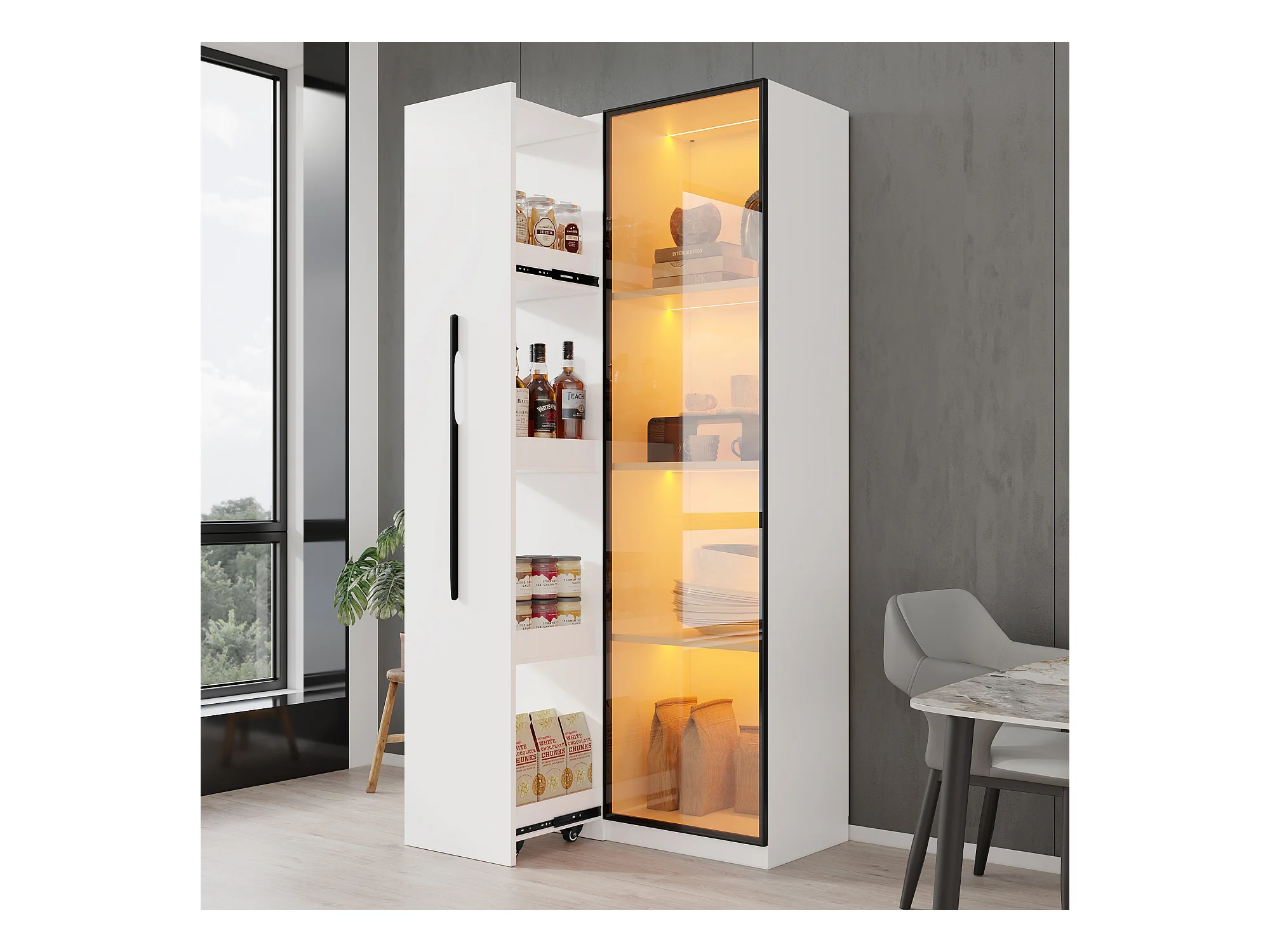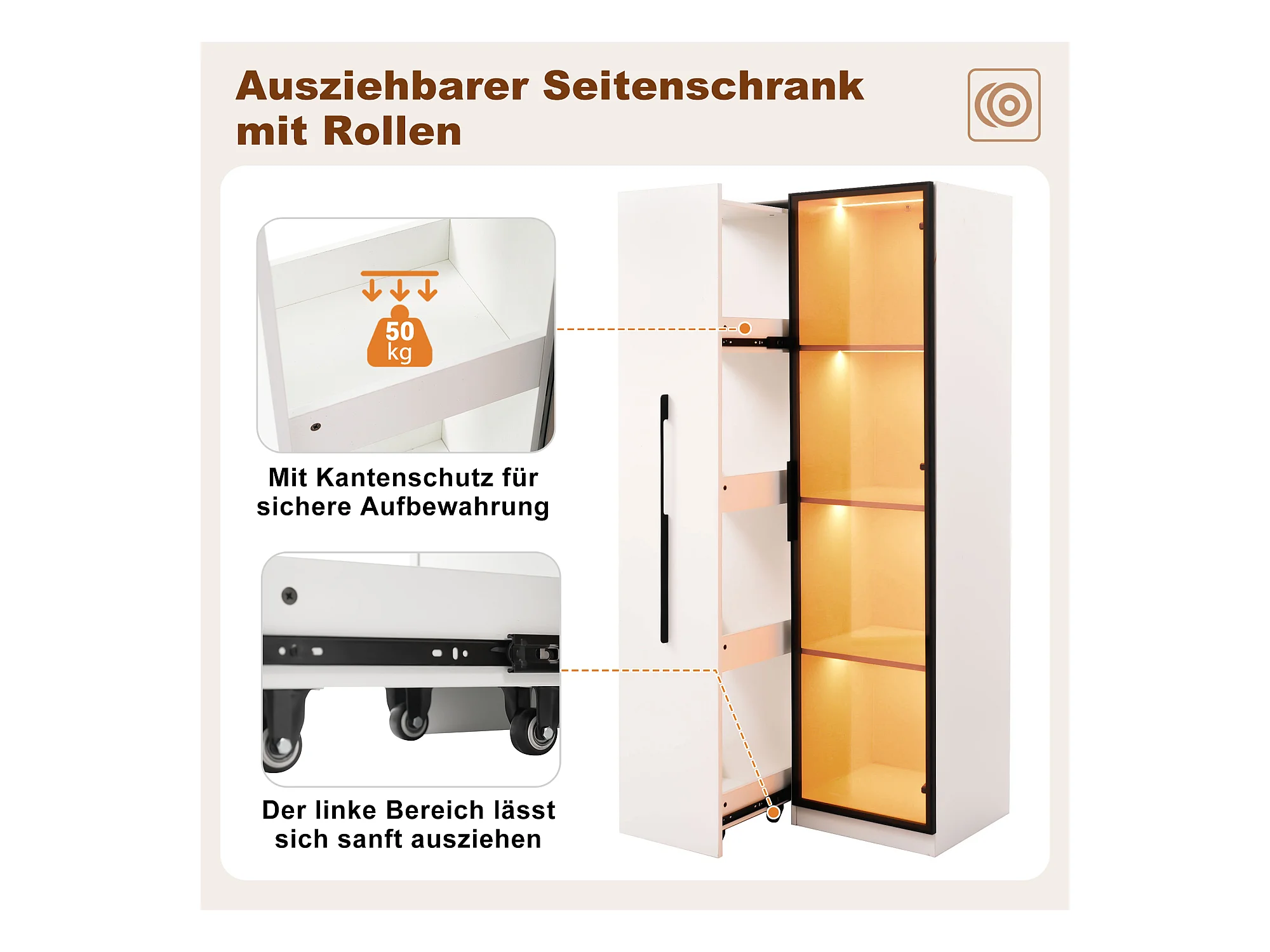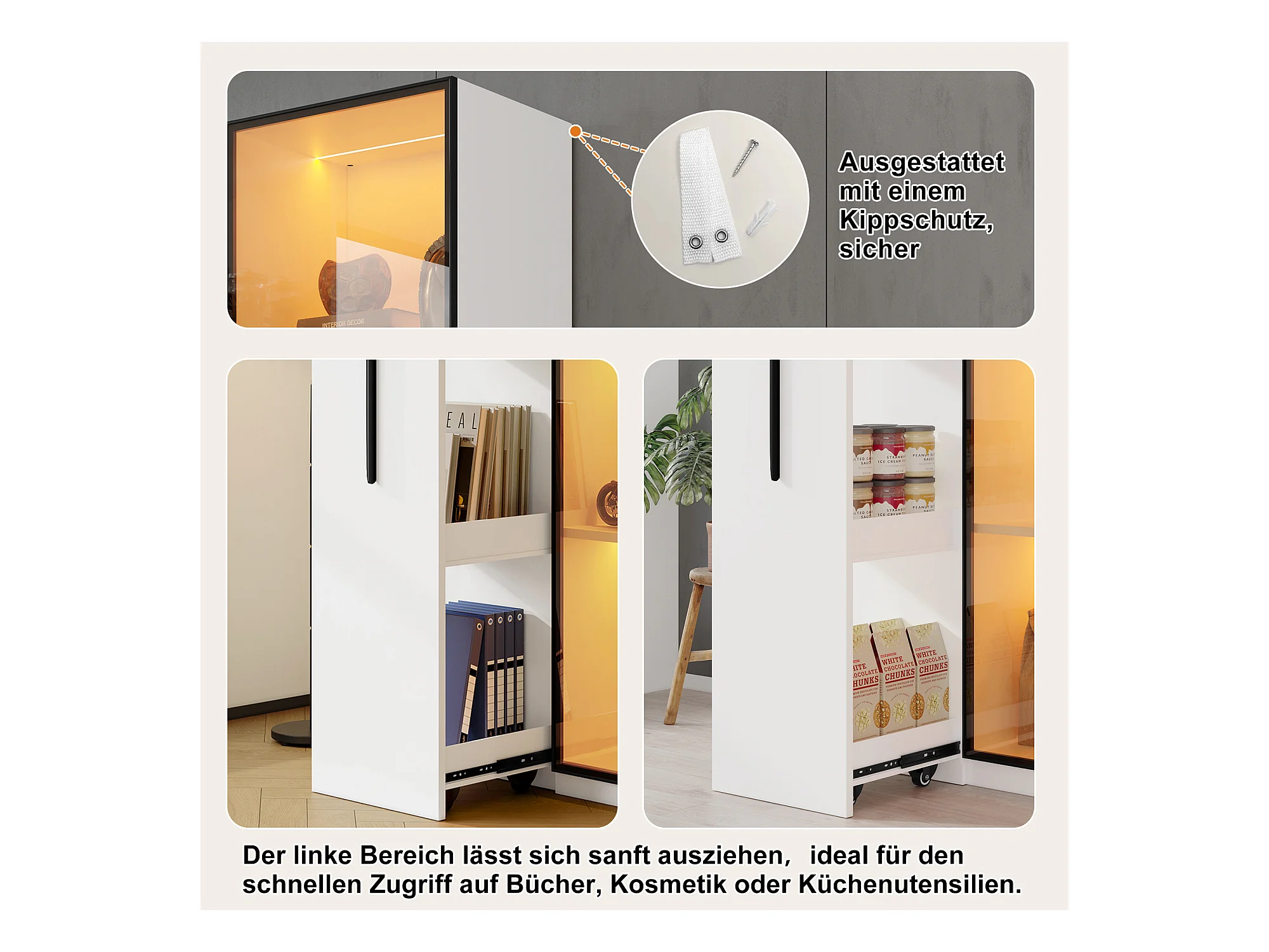 Multifunctionele kast, plank en vitrinekast van gehard glas met aluminium frame, 1 deur, 1 zijlade, met wielen en LED-verlichting