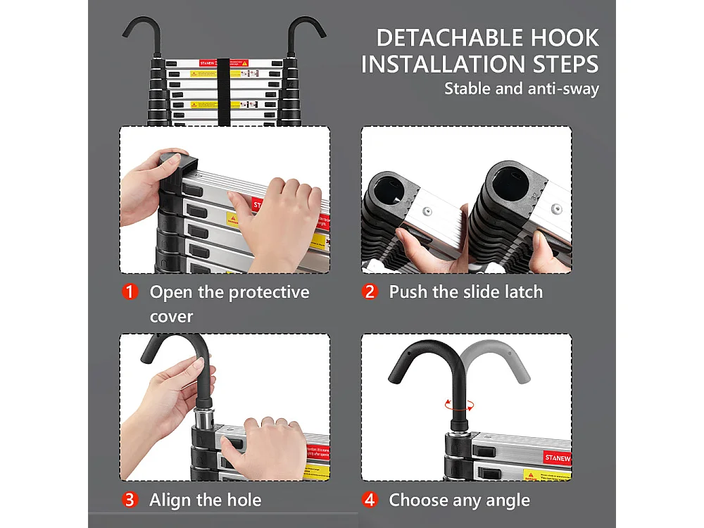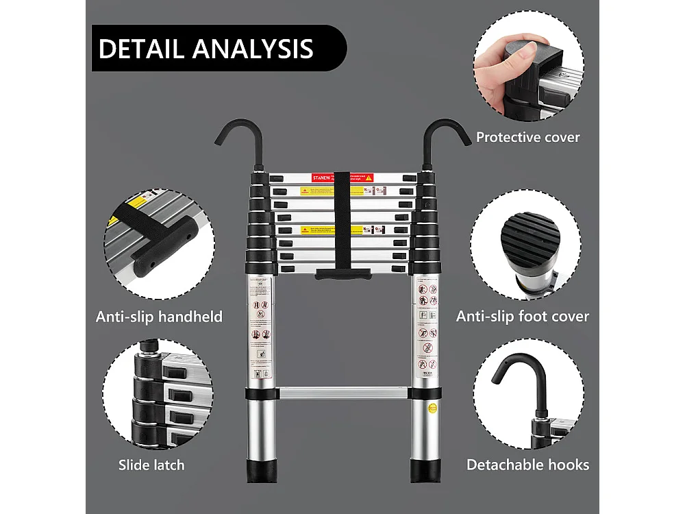 4,4 meter lange telescopische aluminium vouwladder met leuning, maximaal draagvermogen van 150 kilogram