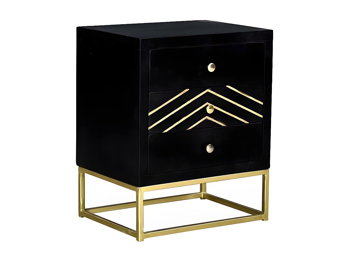Nachtkastje art deco 3 lades PRISMIN - Mangohout en metaal - Zwart en goudkleurig