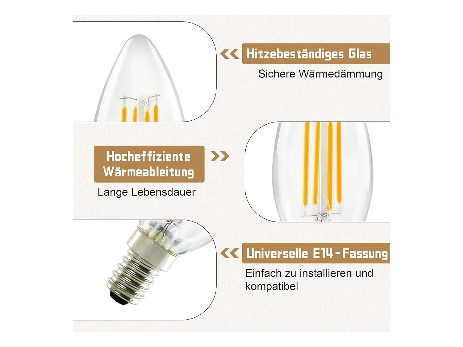 NETTLIFE Pakket van 10 LED - lampen E14: 4W warme witte kaarslamp (2700K) met Edison - draad C35 oud -styled glas, niet dimbaar, energiebesparend.