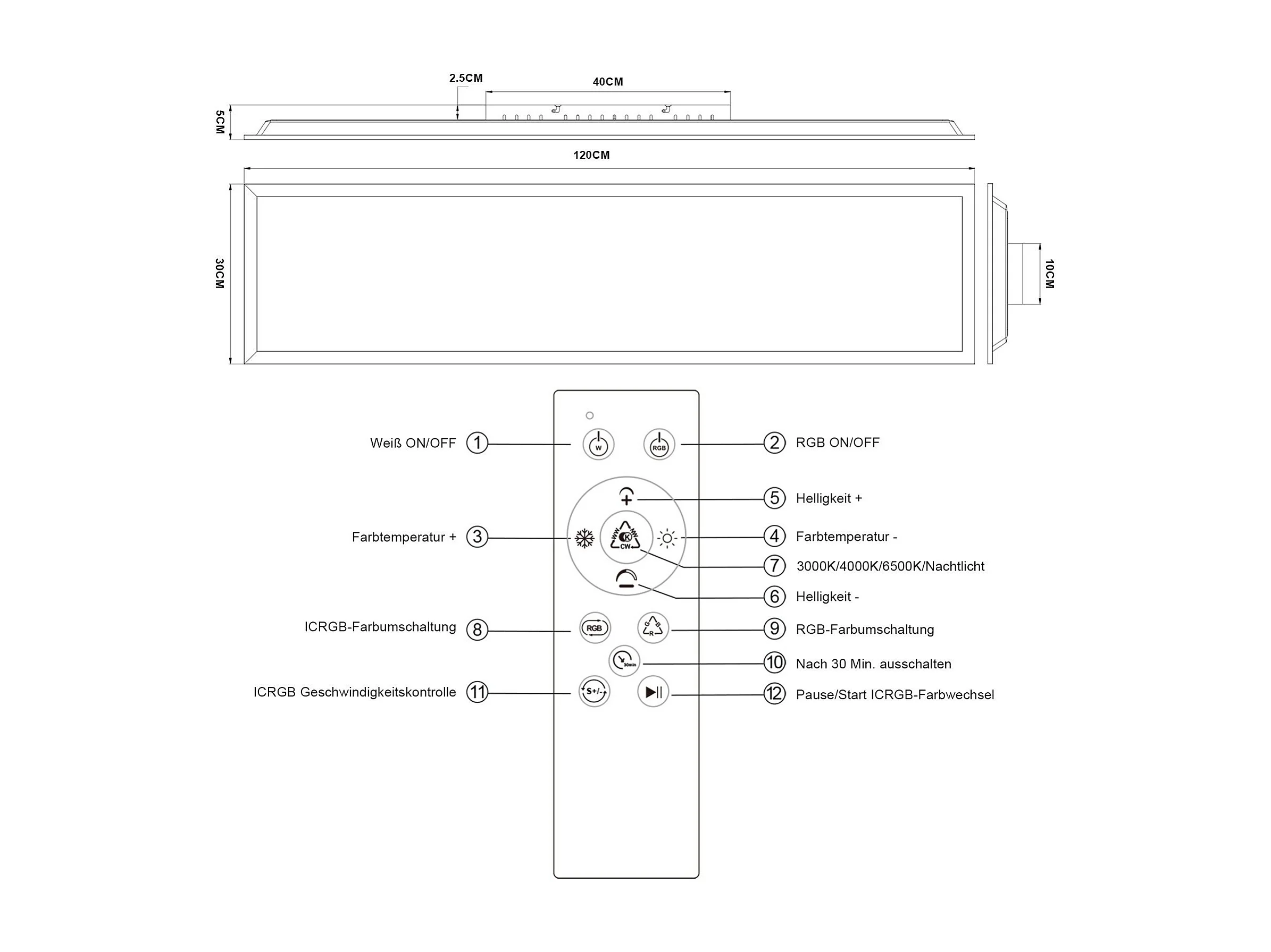 NETTLIFE LED-paneel 120 x 30 cm, dimbaar, plat plafondlicht, RGB-kleurveranderend, met afstandsbediening, 36 W, 3000 K-6500 K