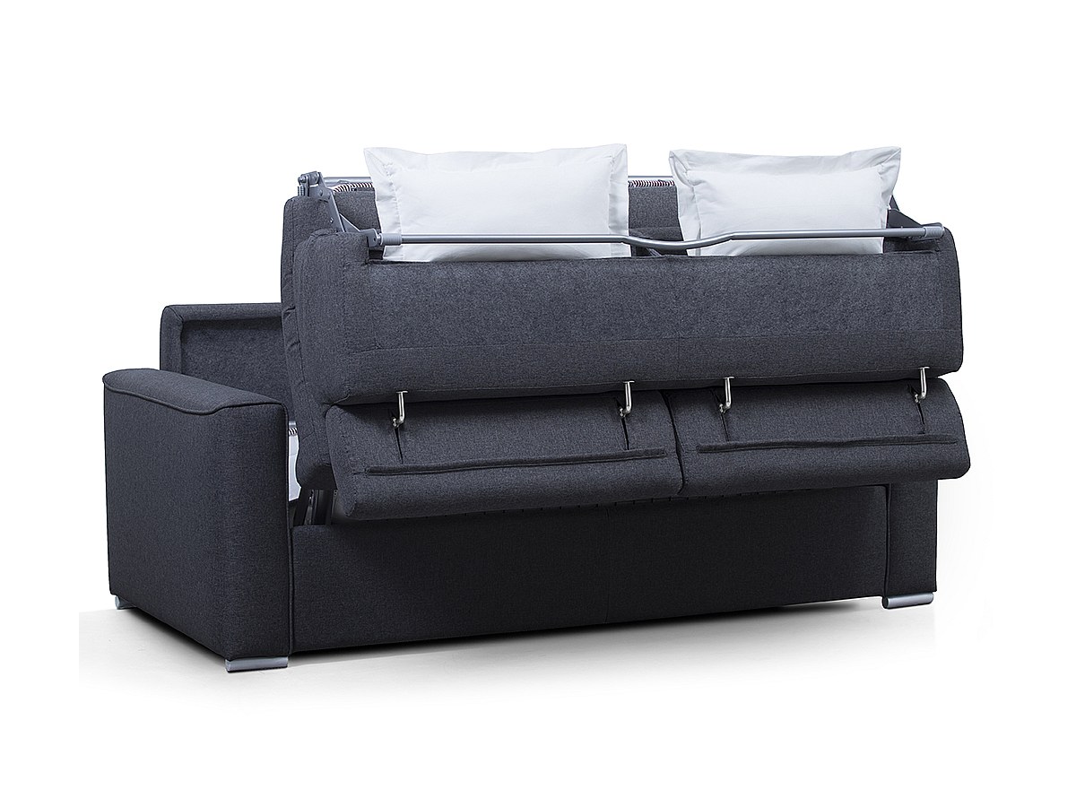 Mechanisme express slaapbank VIZIR II: Trek aan de hendel achter de rugkussens om het bed te ontvouwen.