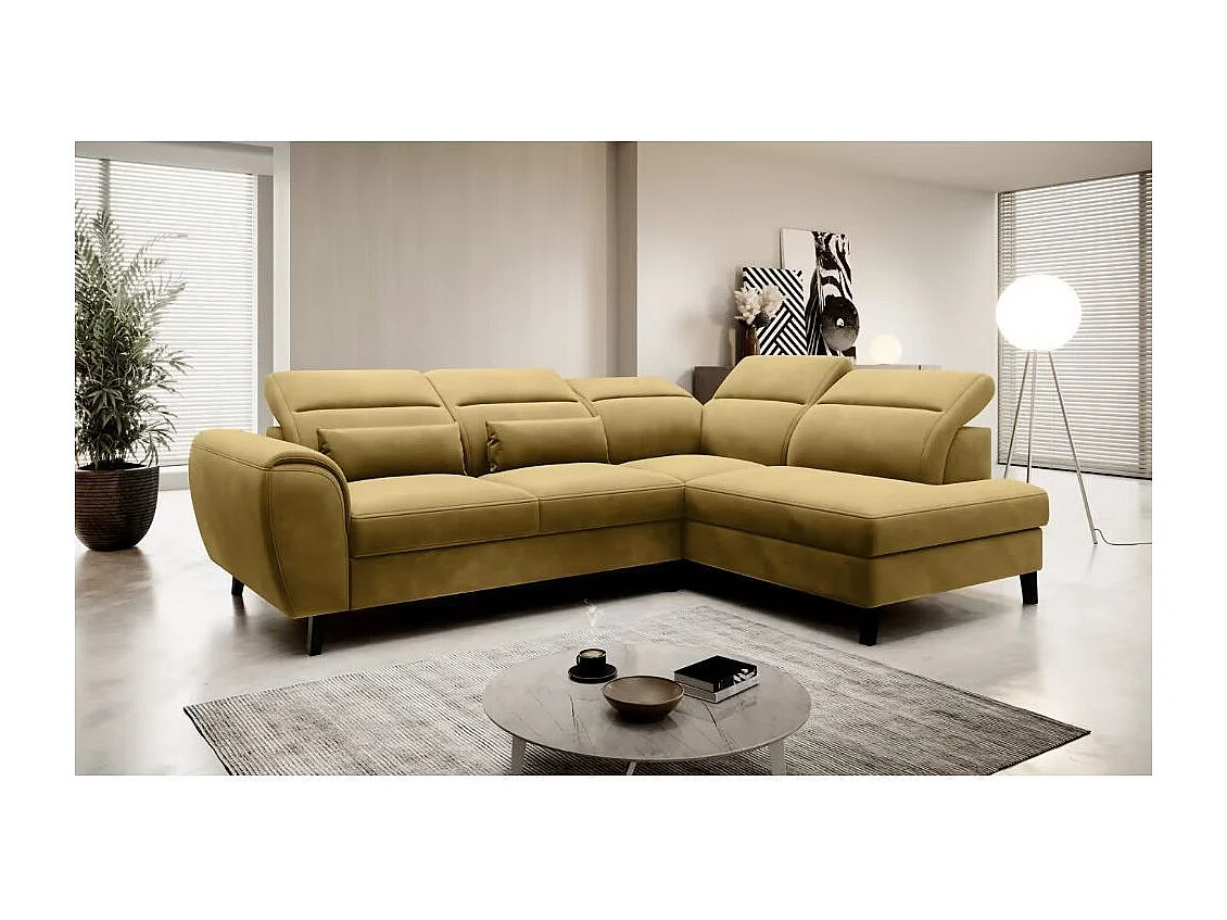 NOBLESSE omvormbare hoekbank met fluwelen opbergruimte - Zwarte houten poten-Kleur Buff geel-juiste hoek