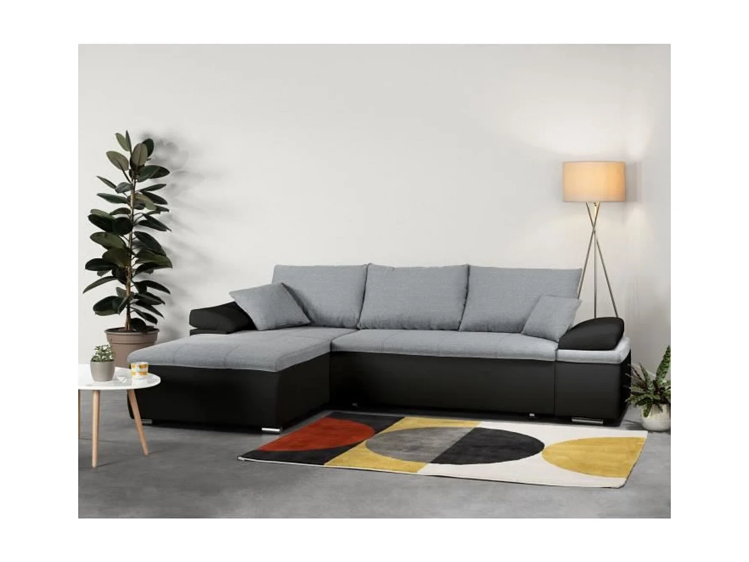 Hoekslaapbank in grijze stof en zwart kunstleer met opbergruimte - LUCAS
