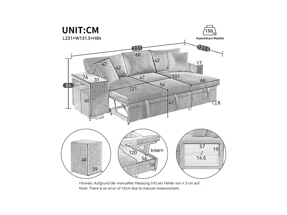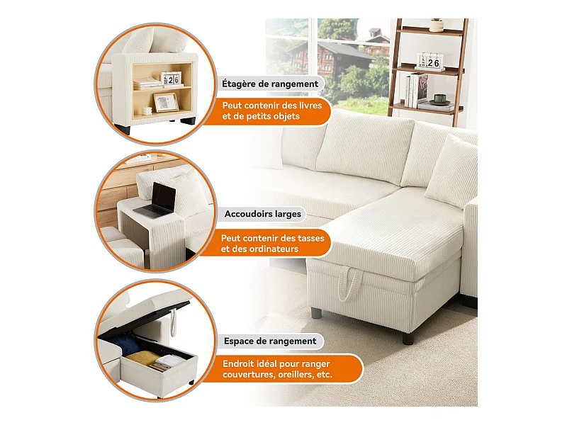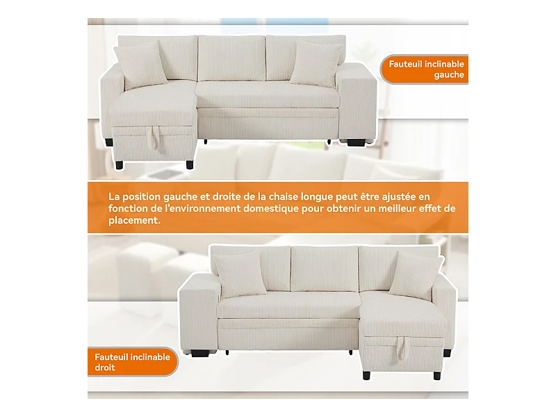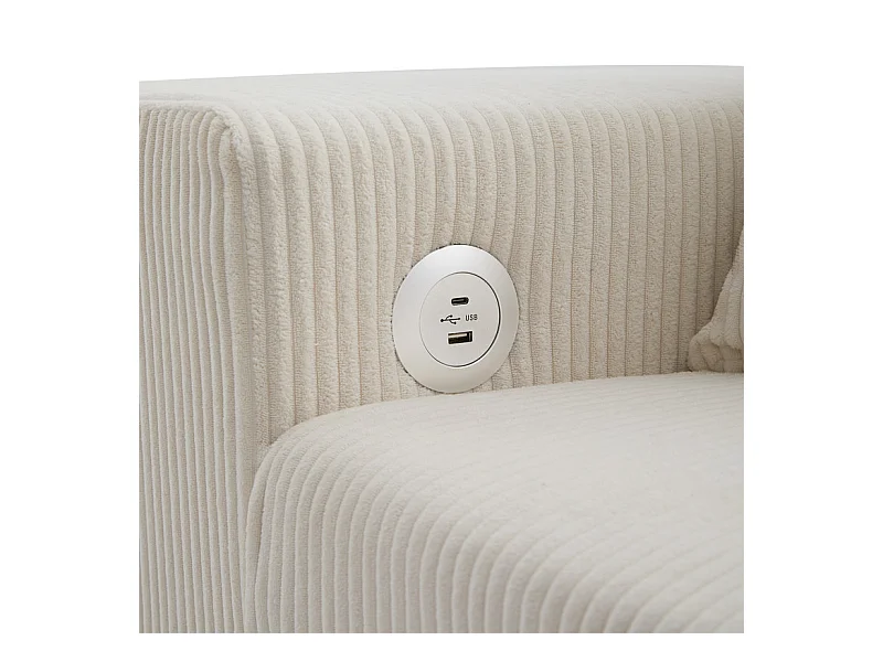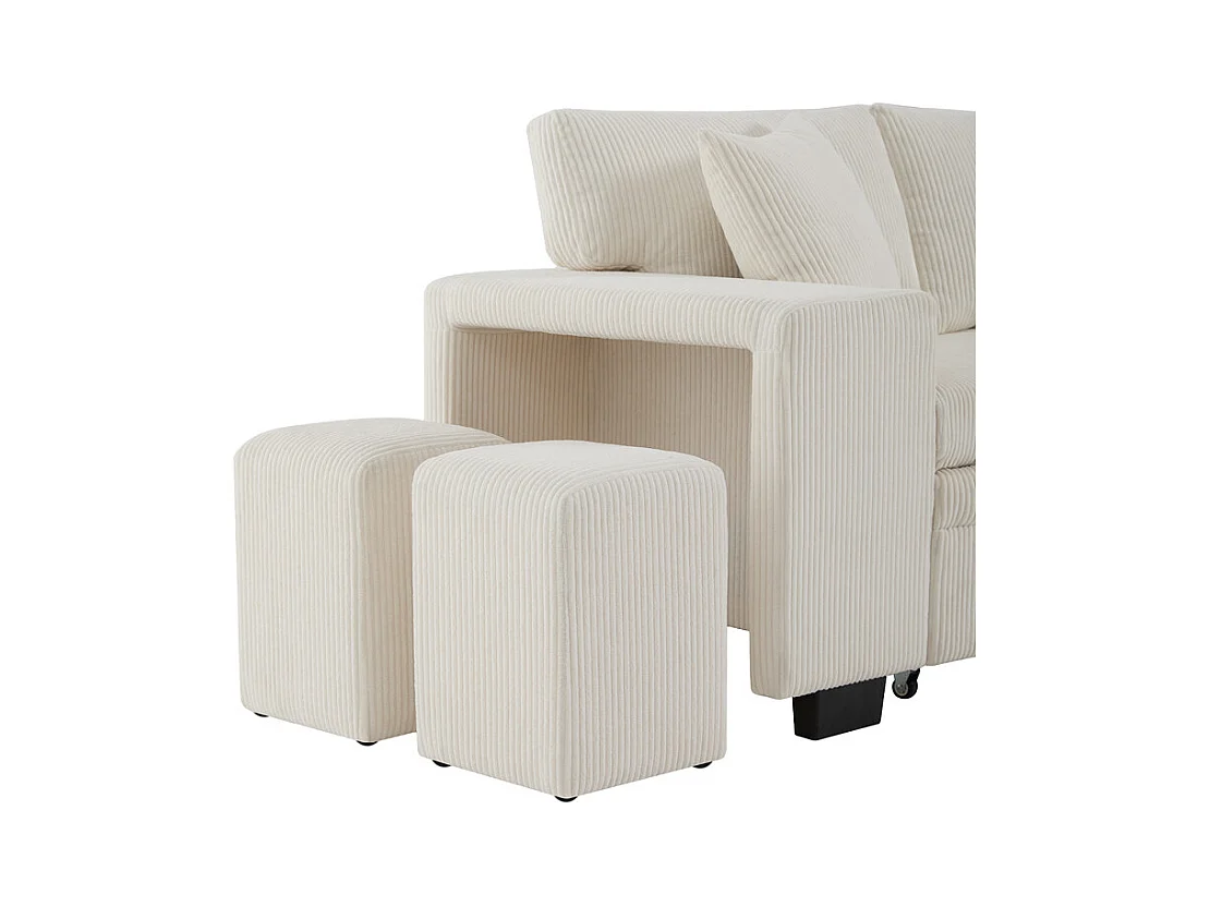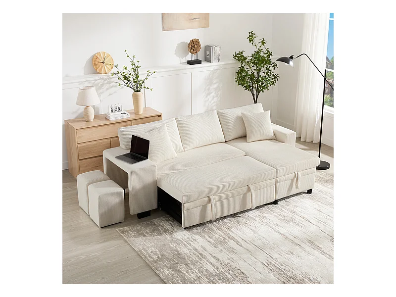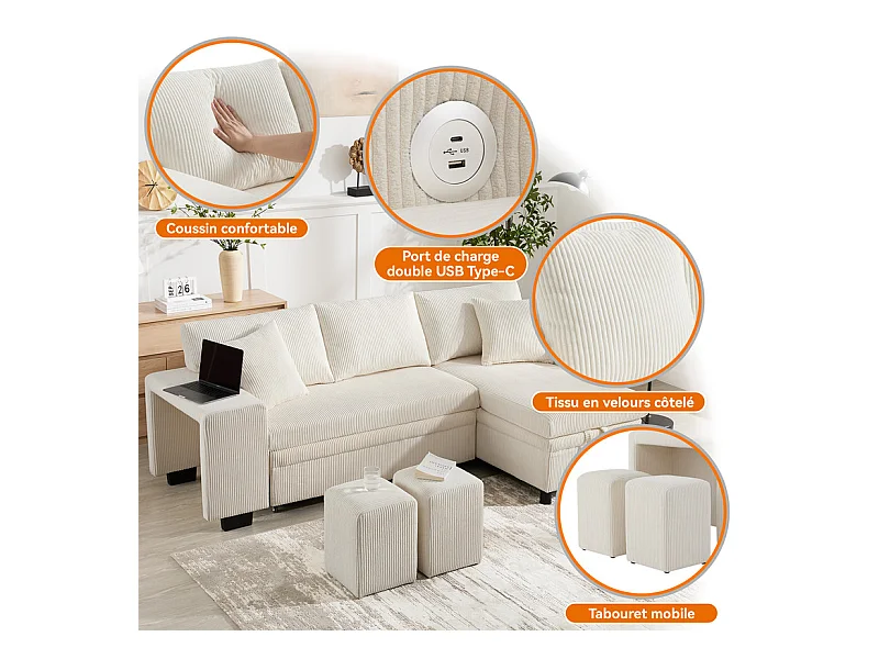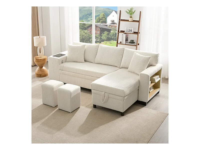 Omkeerbare 3-zits hoekbank - van ribcord - met opbergruimte, plank en 2 poefs - USB+Type-C aansluiting - Beige