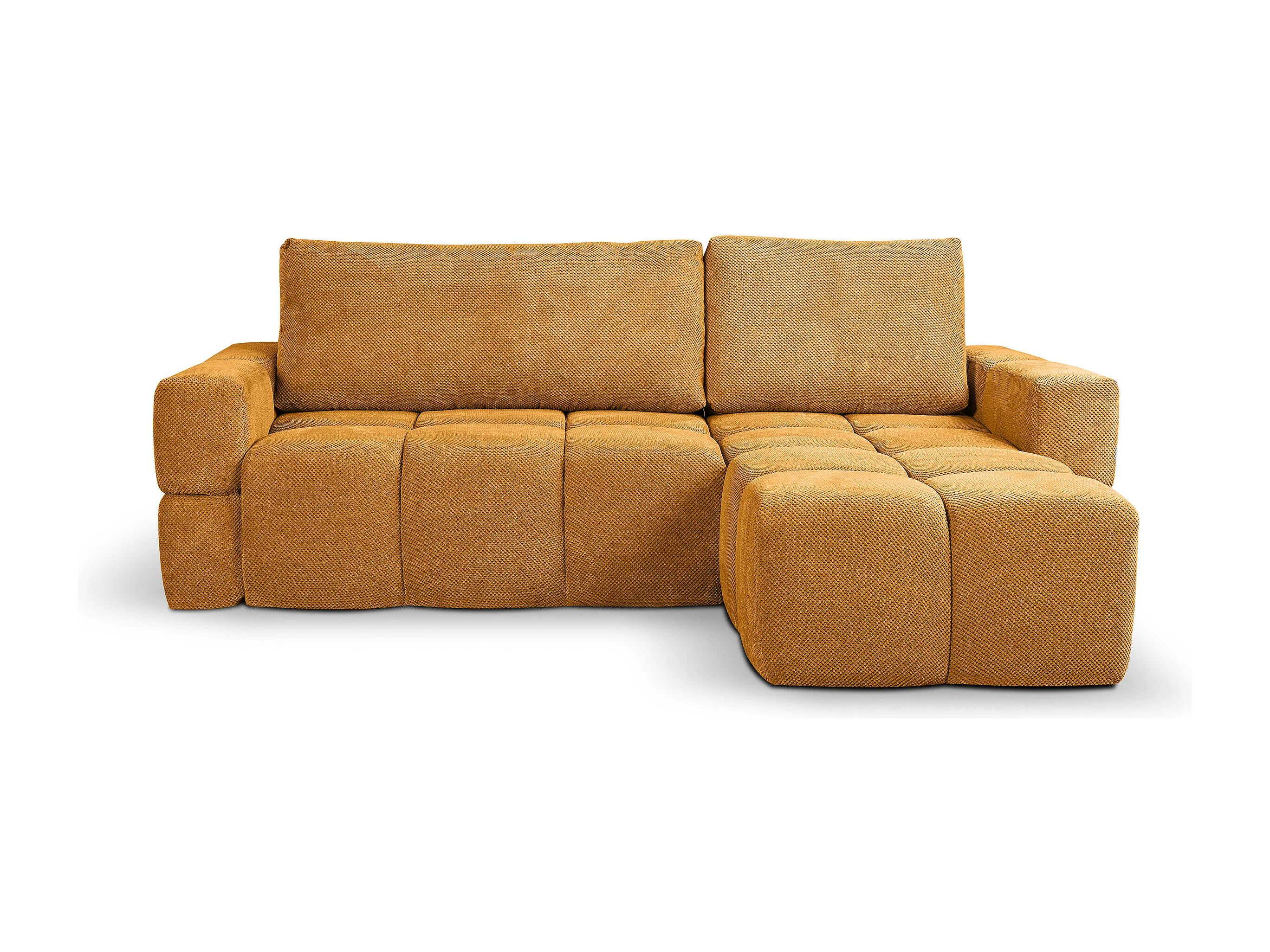 Omkeerbare hoekbank met slaapfunctie, in mosterd stof FUMO van de fabrikant.