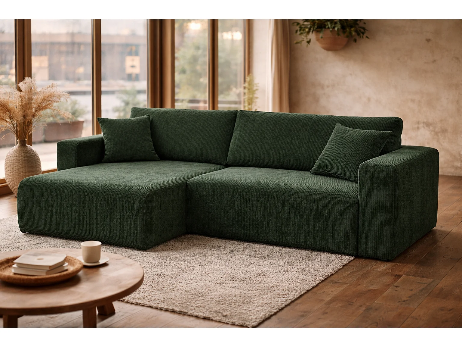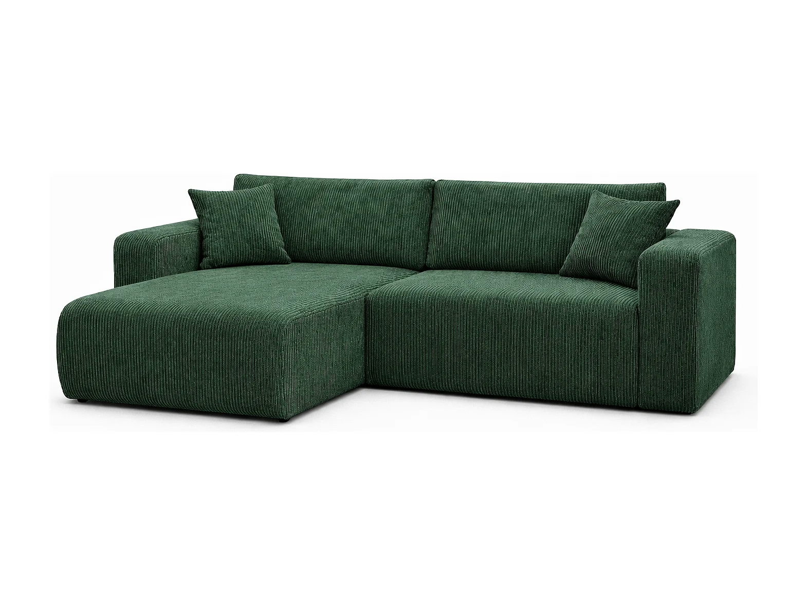 Omkeerbare hoekslaapbank Flora L met slaapfunctie en universele opbergbox in fles groen ribfluweel Rechtstreeks van de fabrikant, levering en plaatsing gratis!