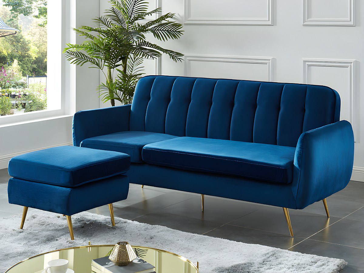 Met zijn goudkleurig metalen poten, zijn fluwelen bekleding, zijn modulaire poef en zijn rugleuning met strepen, komt de zitbank BLAYNE geen troeven tekort om u te verleiden! U hoeft er alleen nog maar op te gaan zitten!