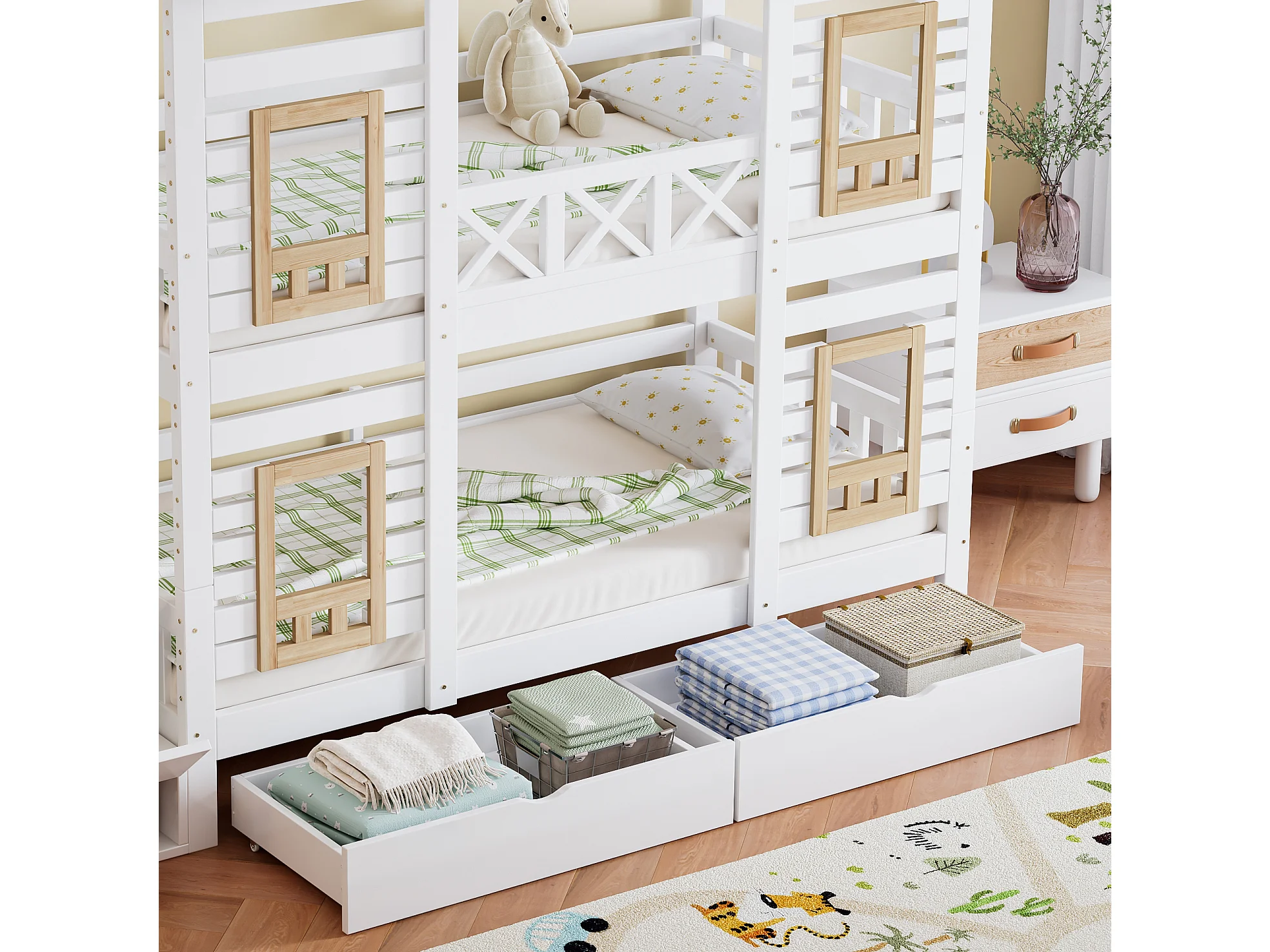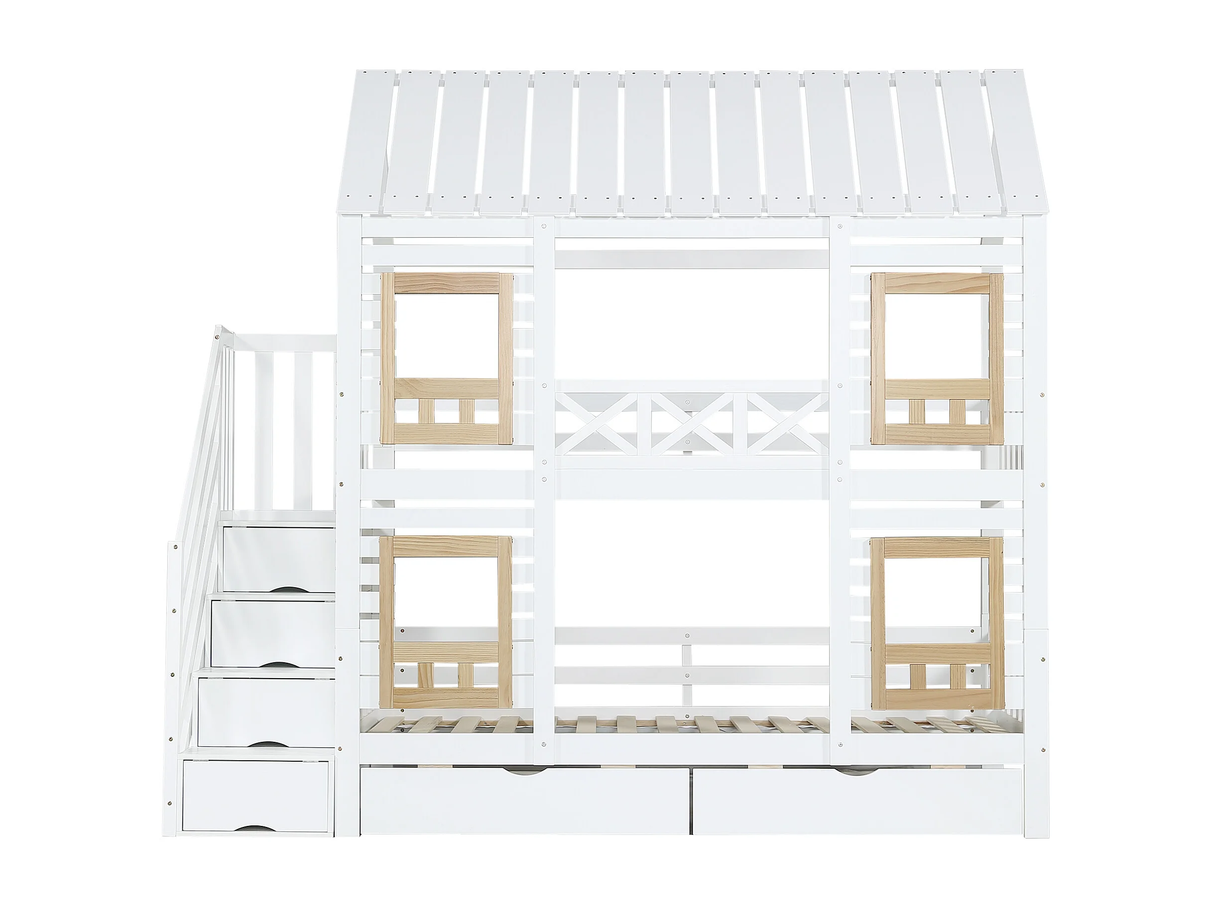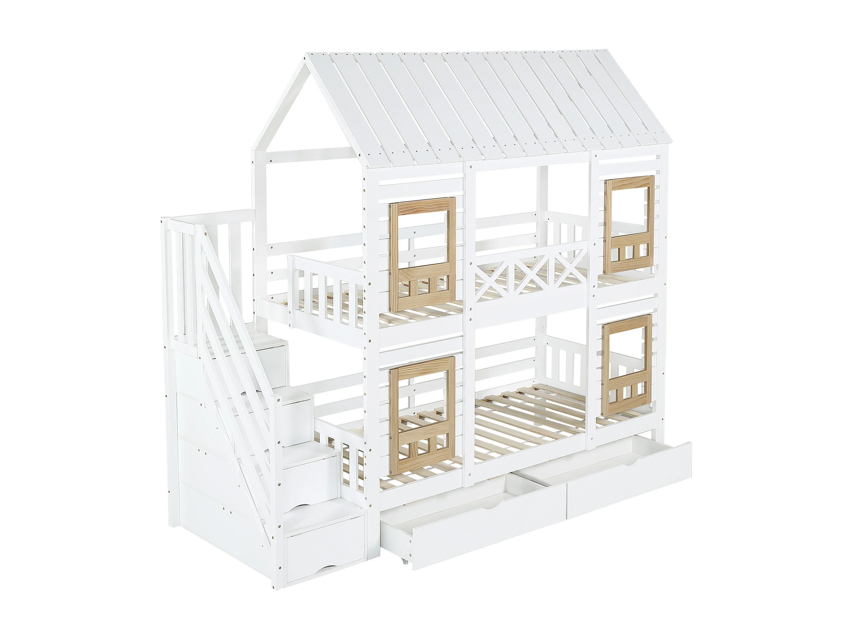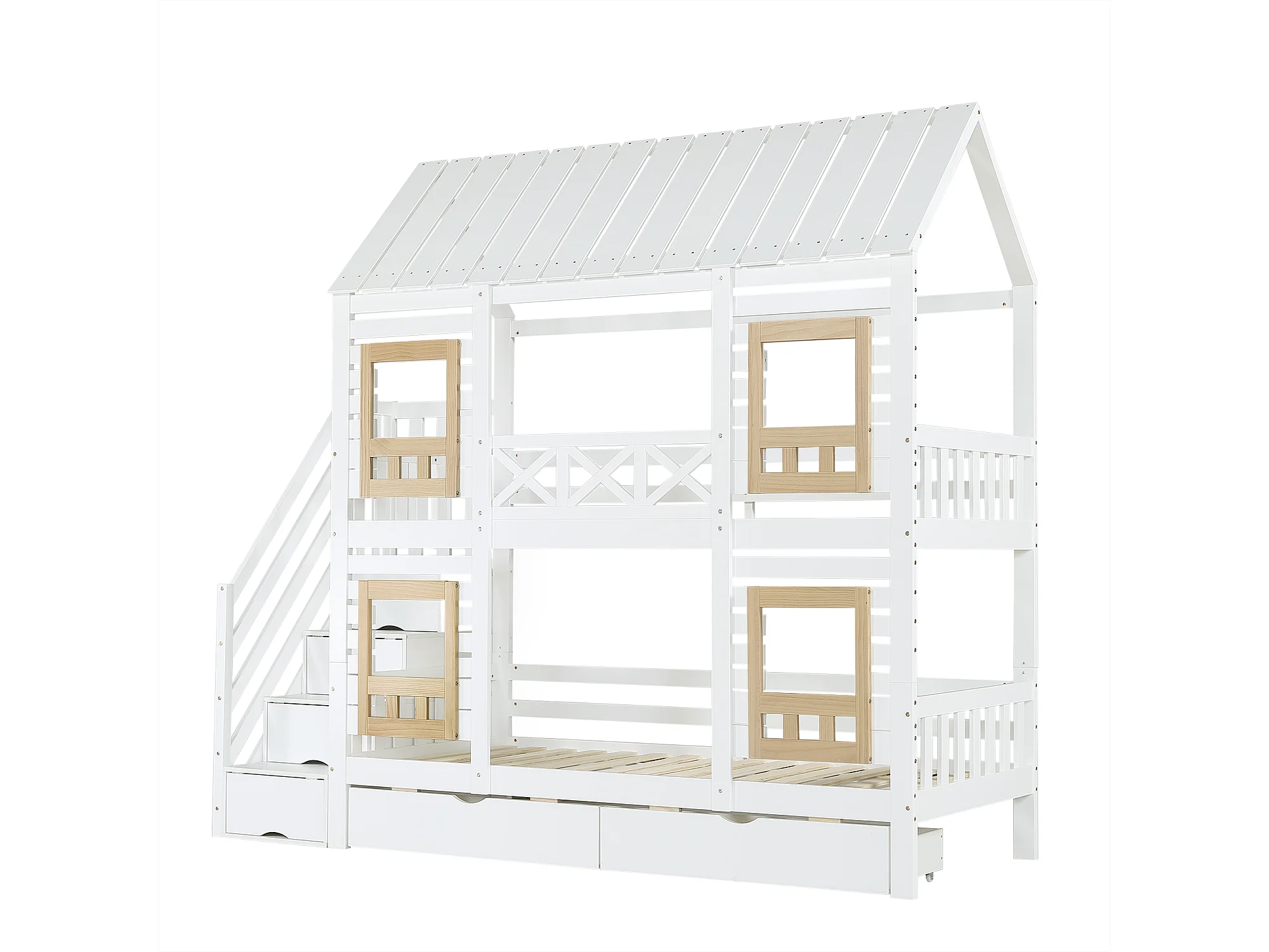 Kinder stapelbed 90×200 cm - met raam - met 2 laden - trap met opbergruimte - massief hout - wit + naturel