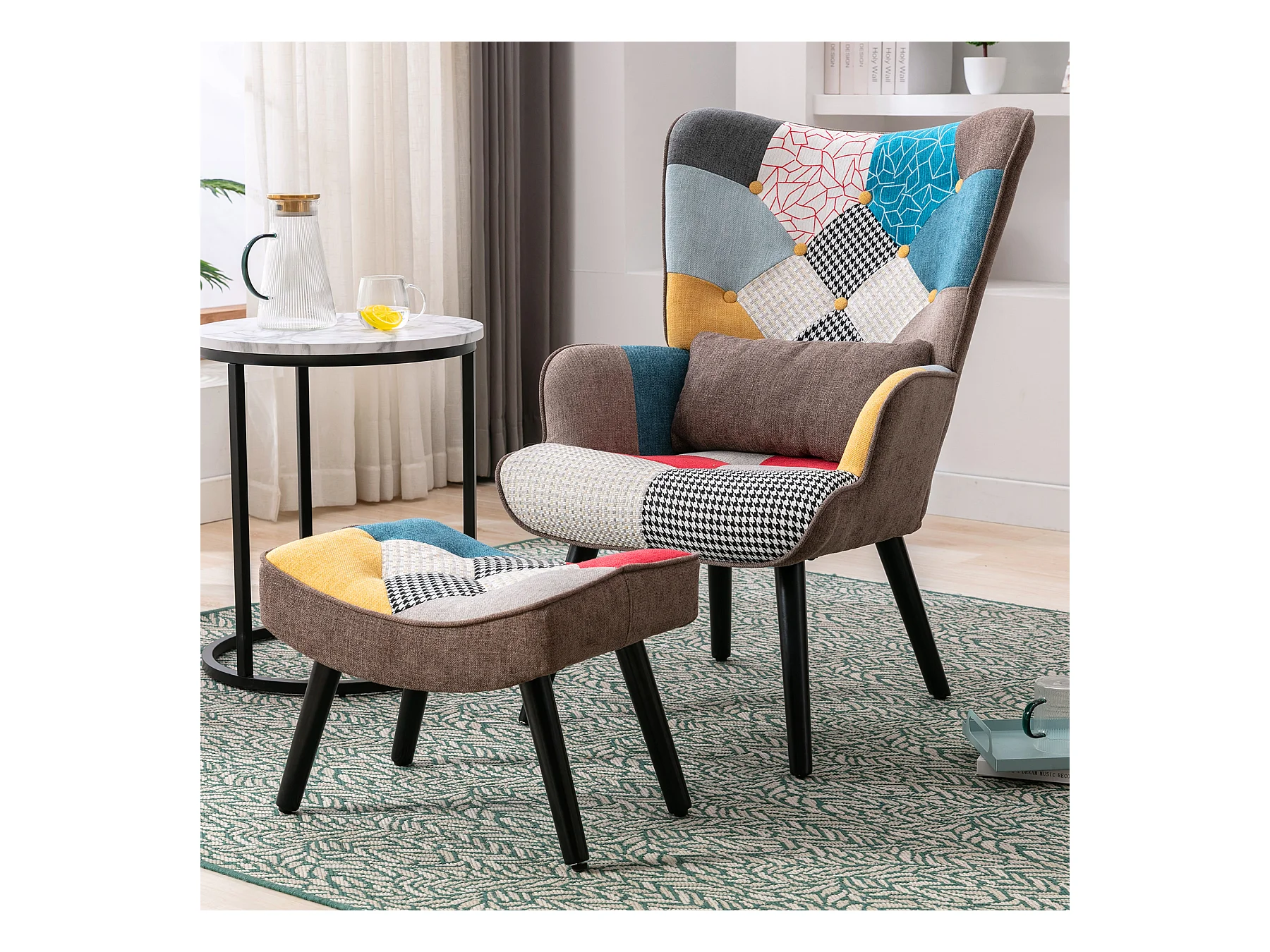 Oorfauteuil, relaxstoel met kruk, patchworkstoel, oorfauteuil, woonkamerstoel