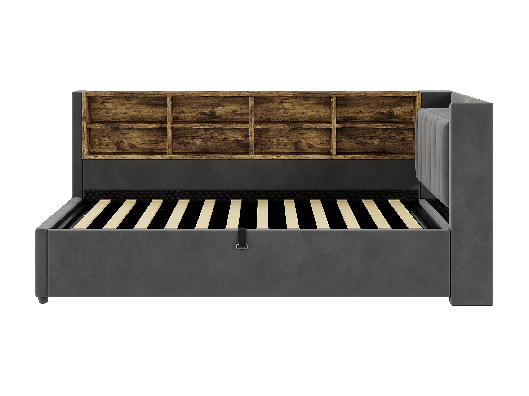 Opbergbankbed 90×200 cm - met verlichting - met USB- en Type-C-poort - Fluweel - Donkergrijs (zonder matras)