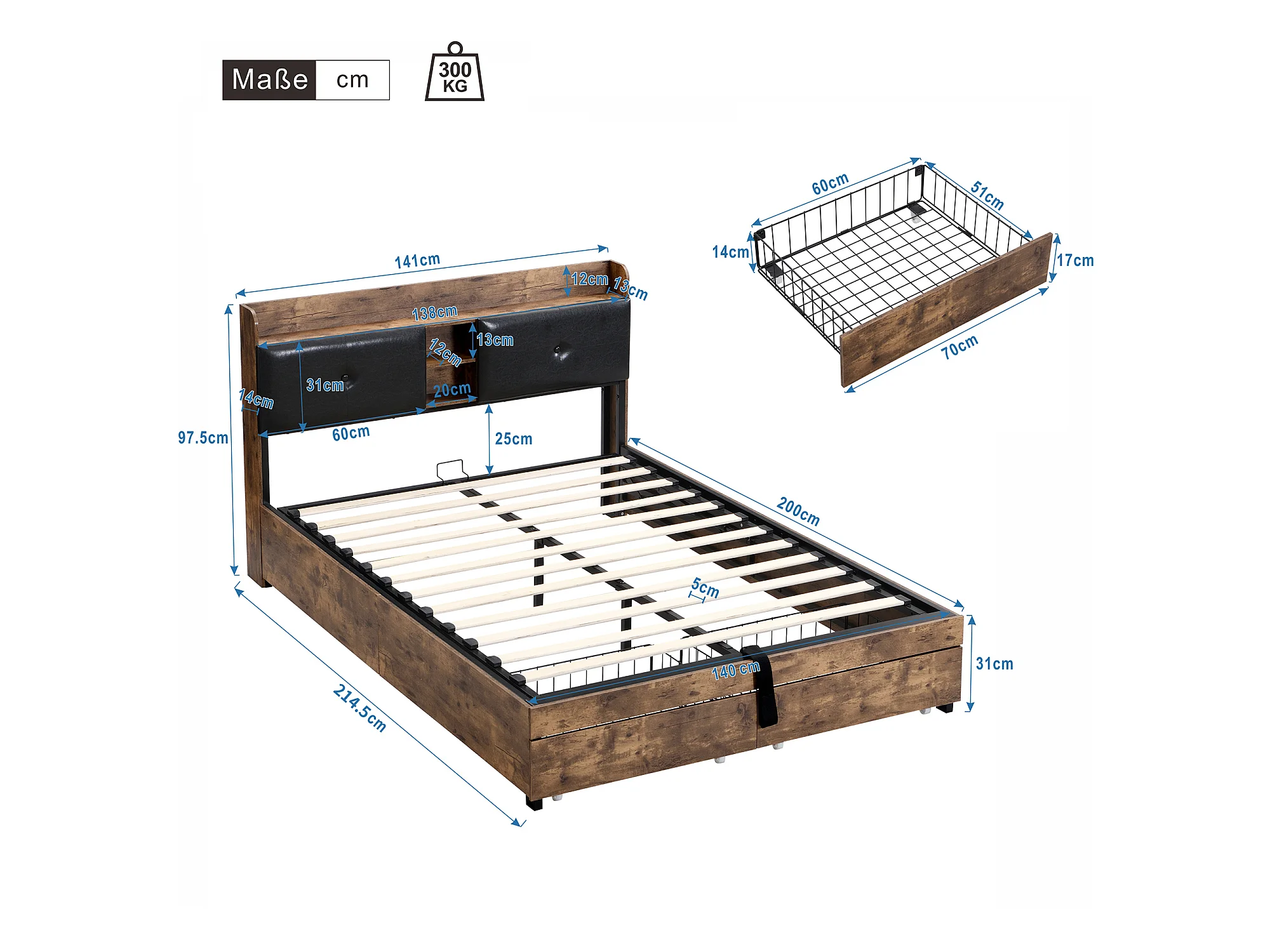 Opbergbed 140x200cm - met opberghoofdeinde en metalen lattenbodem - Donker naturel & Zwart