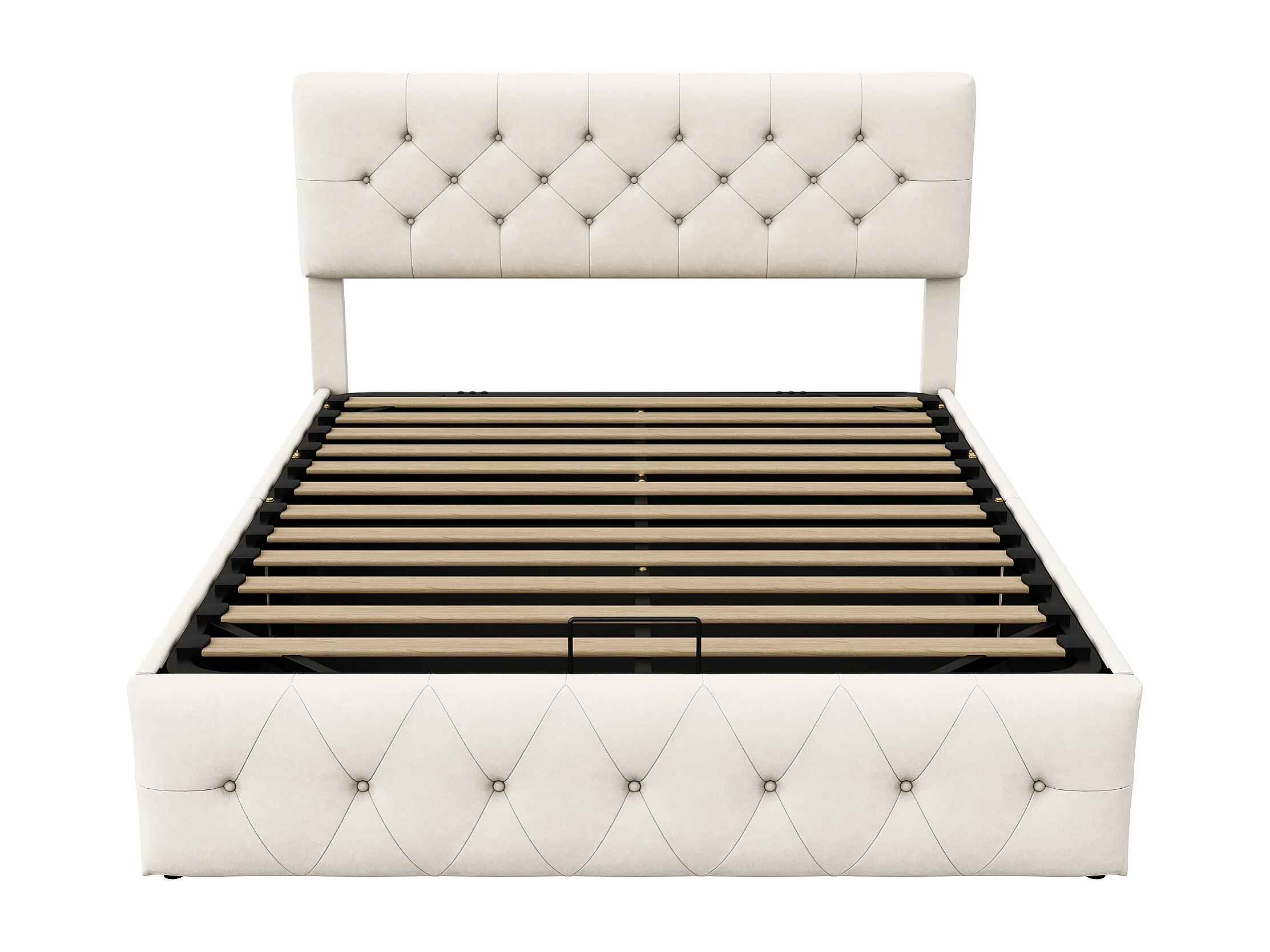 Opbergbed 160 x 200 cm, tweepersoonsbed, volwassen bed, gestoffeerd bed, met lattenbodem, hydraulische hendel, fluwelen stof, beige