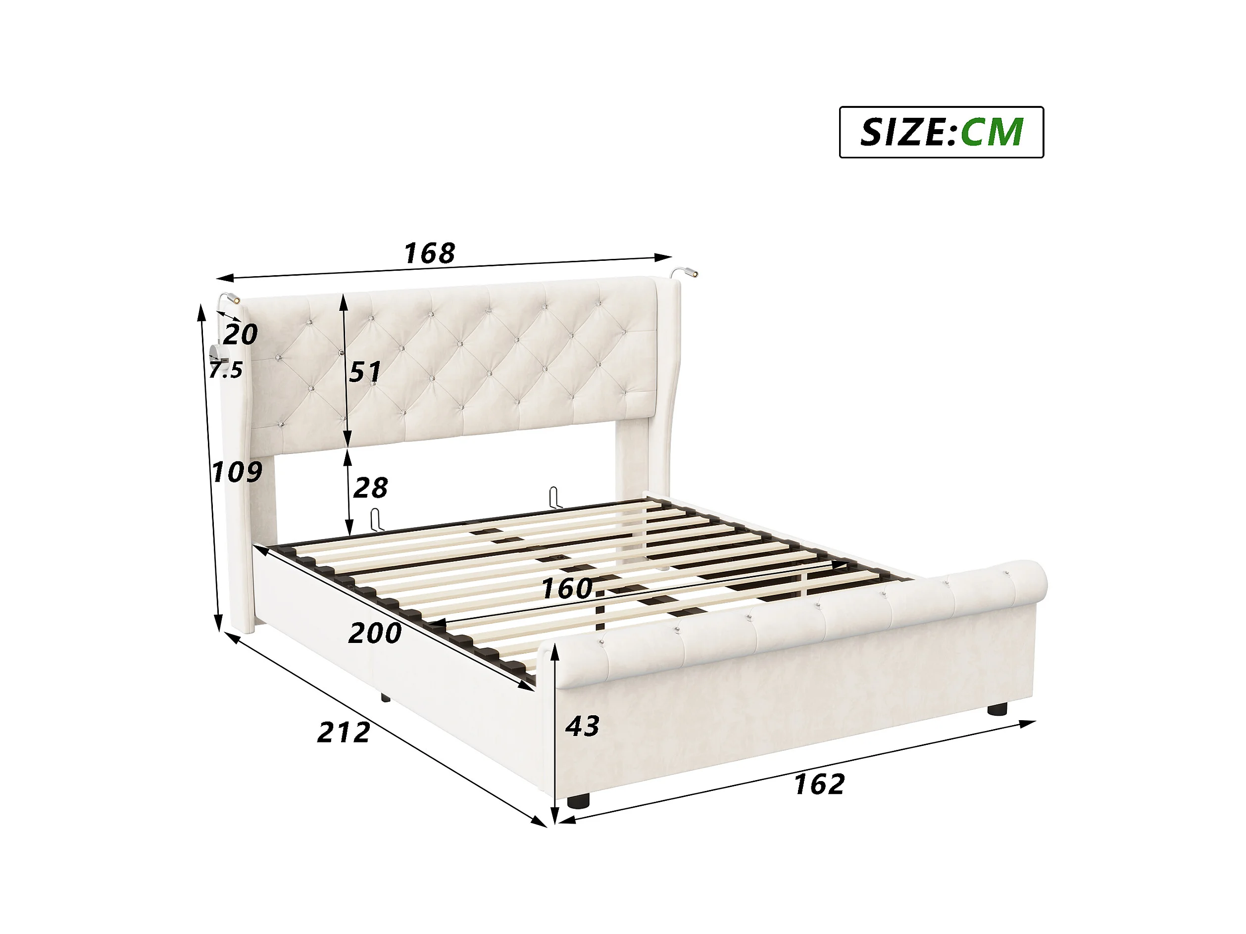 Opbergbed 160x200 cm in beige fluweel met hydraulische opbergruimte, geïntegreerde bedlampjes met USB-poorten en Europese oplader