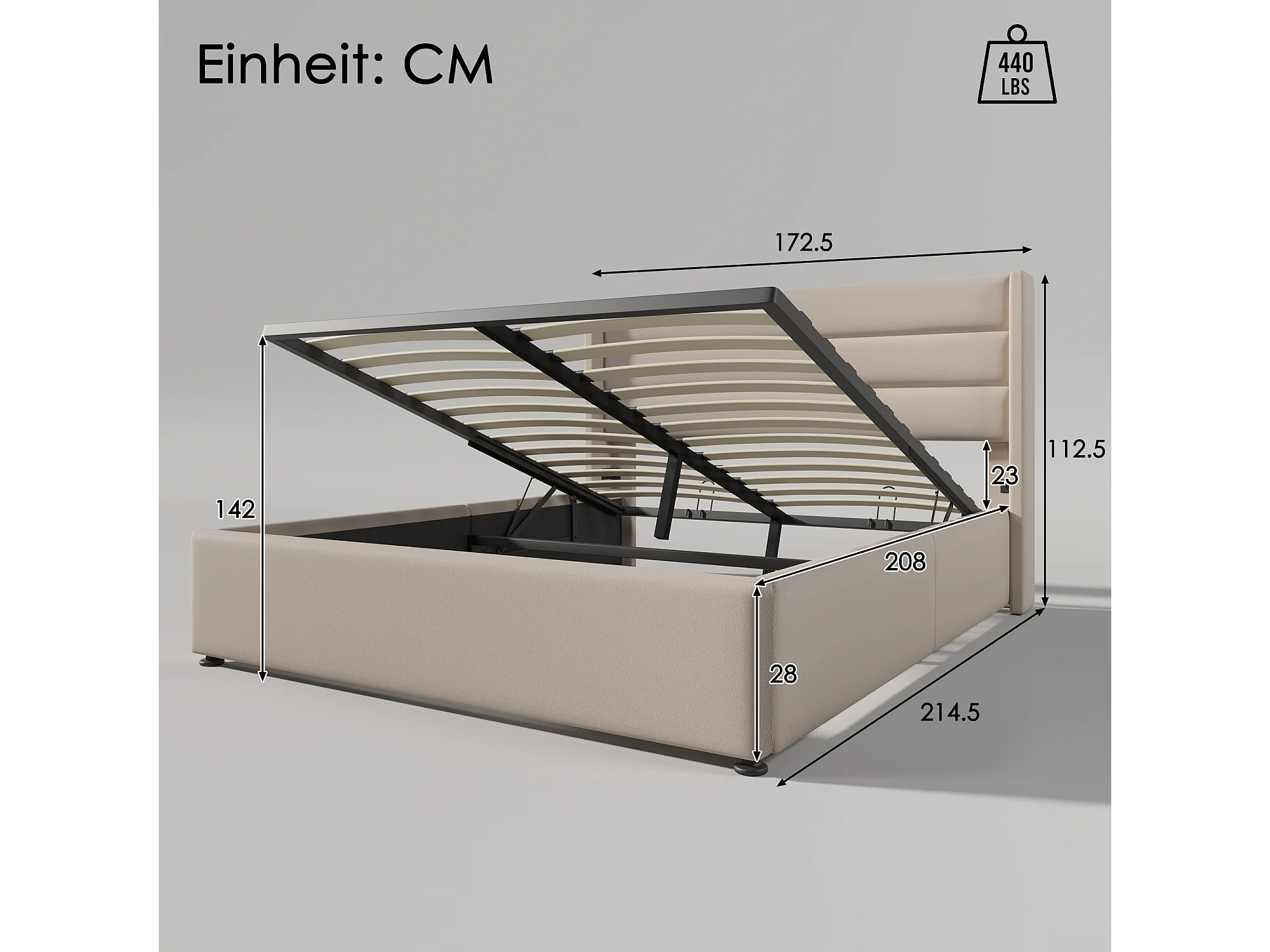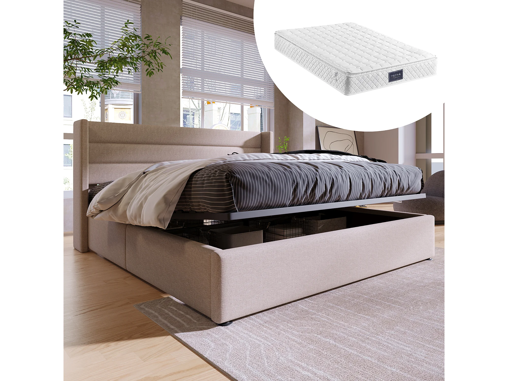 Opbergbed 172.5×214.5cm met kopmatras frame opbergruimte - beige - (Met matelas)