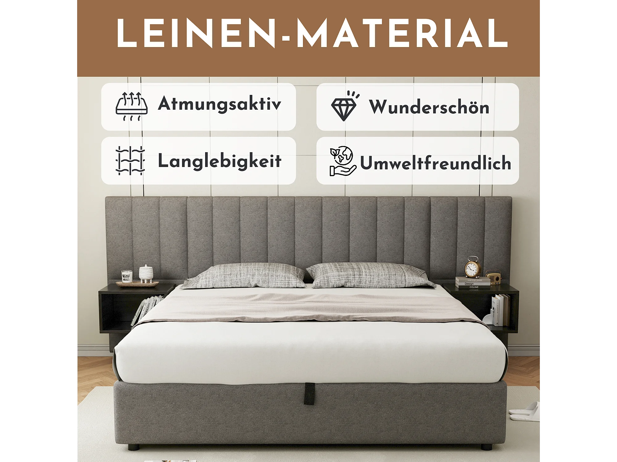 Opbergbed 180 x 200 cm met groot hoofdbord en 2 nachtkastjes - Linnen stof - Grijs + zwart (zonder matras)