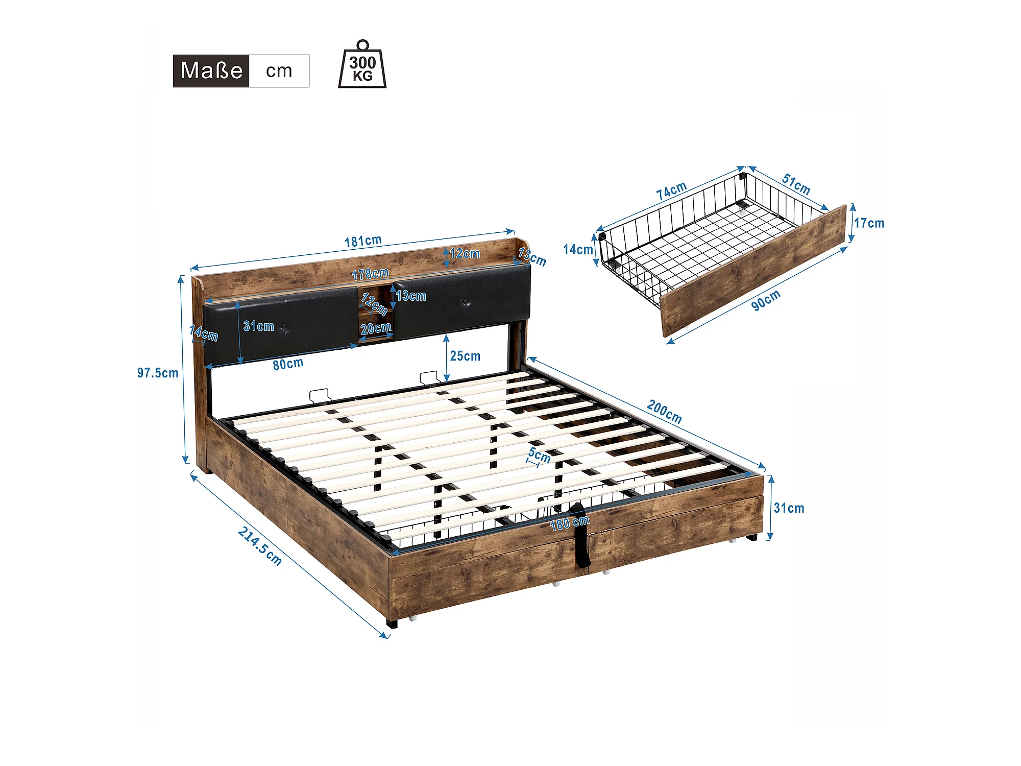 Opbergbed 180x200cm - met opberghoofdeinde en metalen lattenbodem - Donker naturel & Zwart